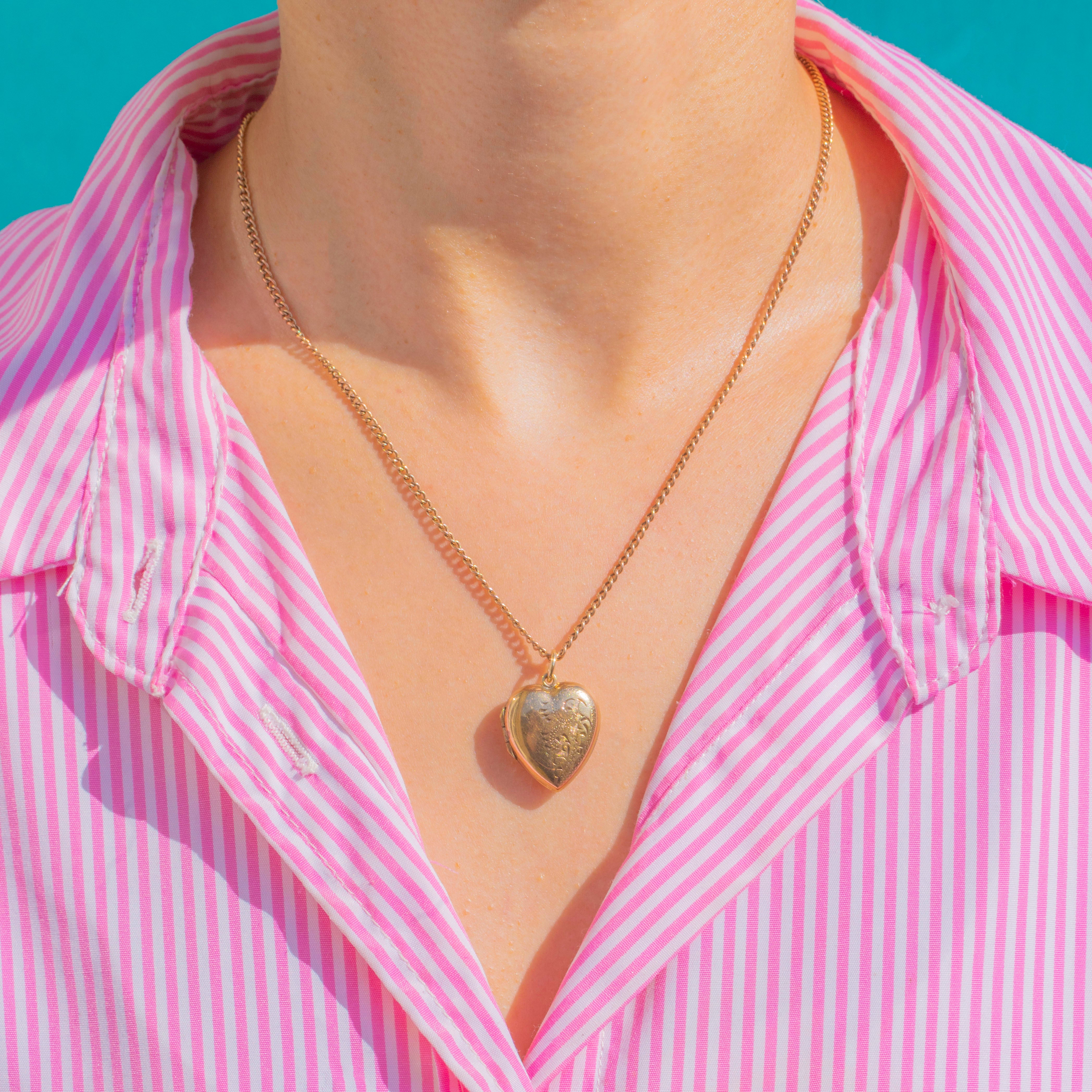 This charming Victorian puffy heart locket is crafted in warm 9ct Gold, its front finely engraved with scrolling foliate motifs. The reverse is smooth and highly polished, catching the light beautifully.