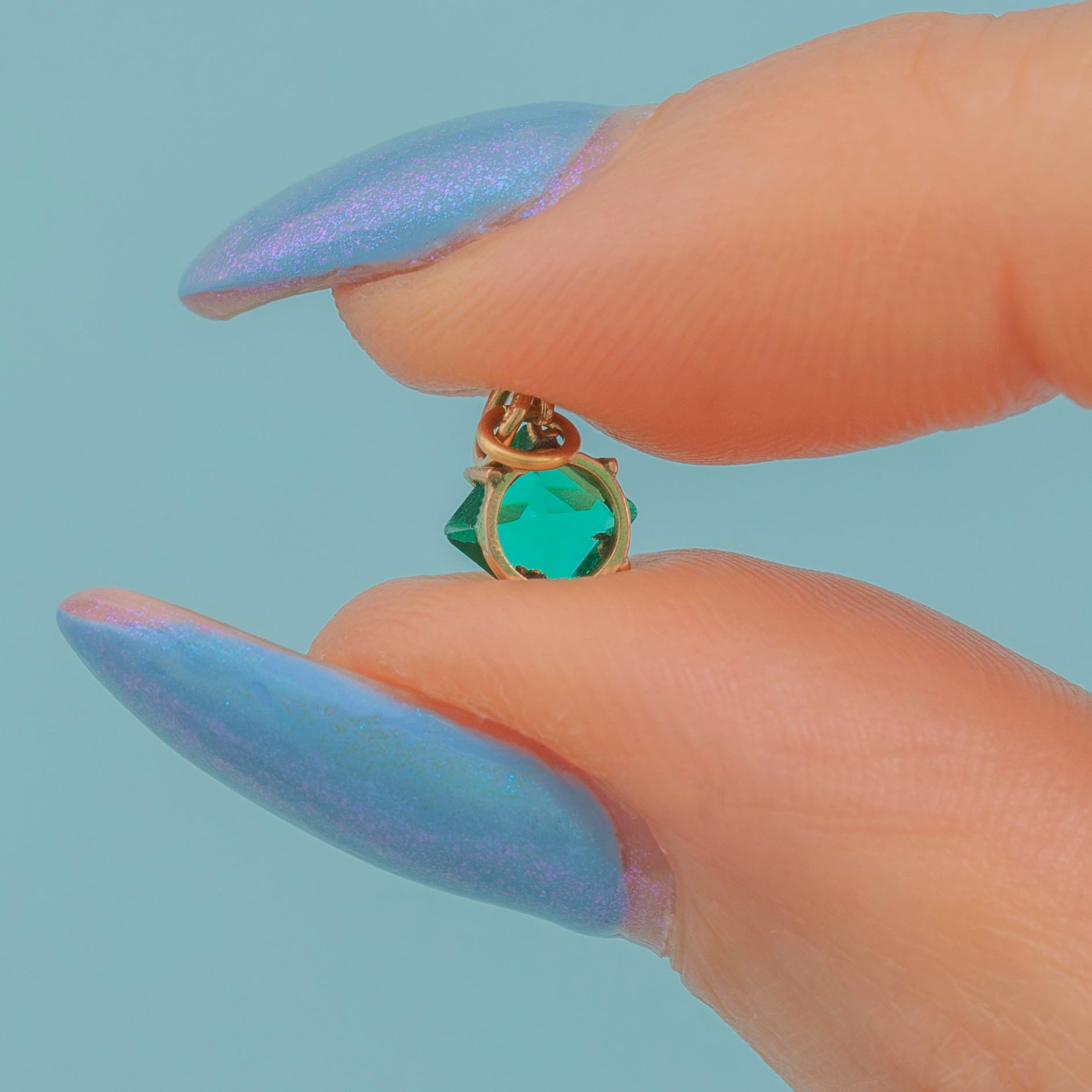 This elegant antique 9ct Gold Green Paste charm showcases a vivid emerald-green Paste stone set in a classic 9ct Gold claw setting. The finely cut Paste stone sparkles beautifully, mimicking the brilliance of a precious gemstone, with the warm Gold setting enhancing its rich hue.