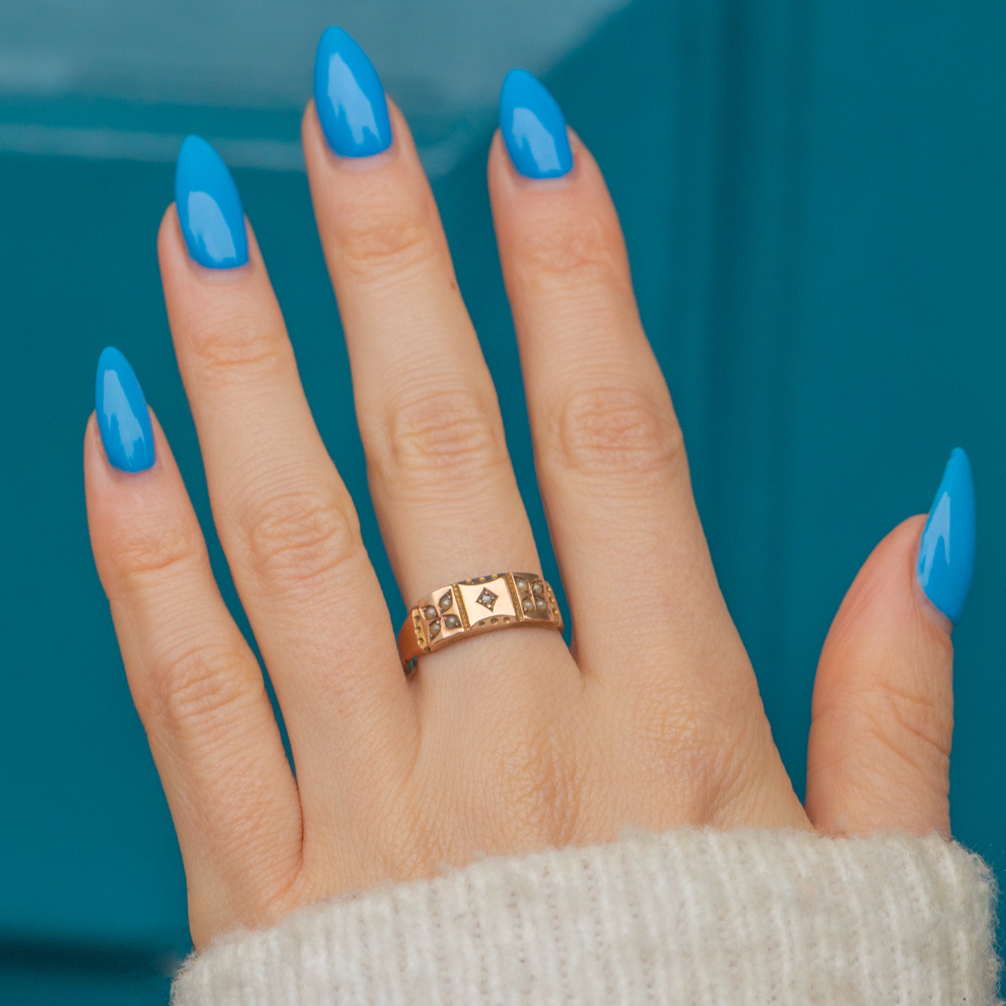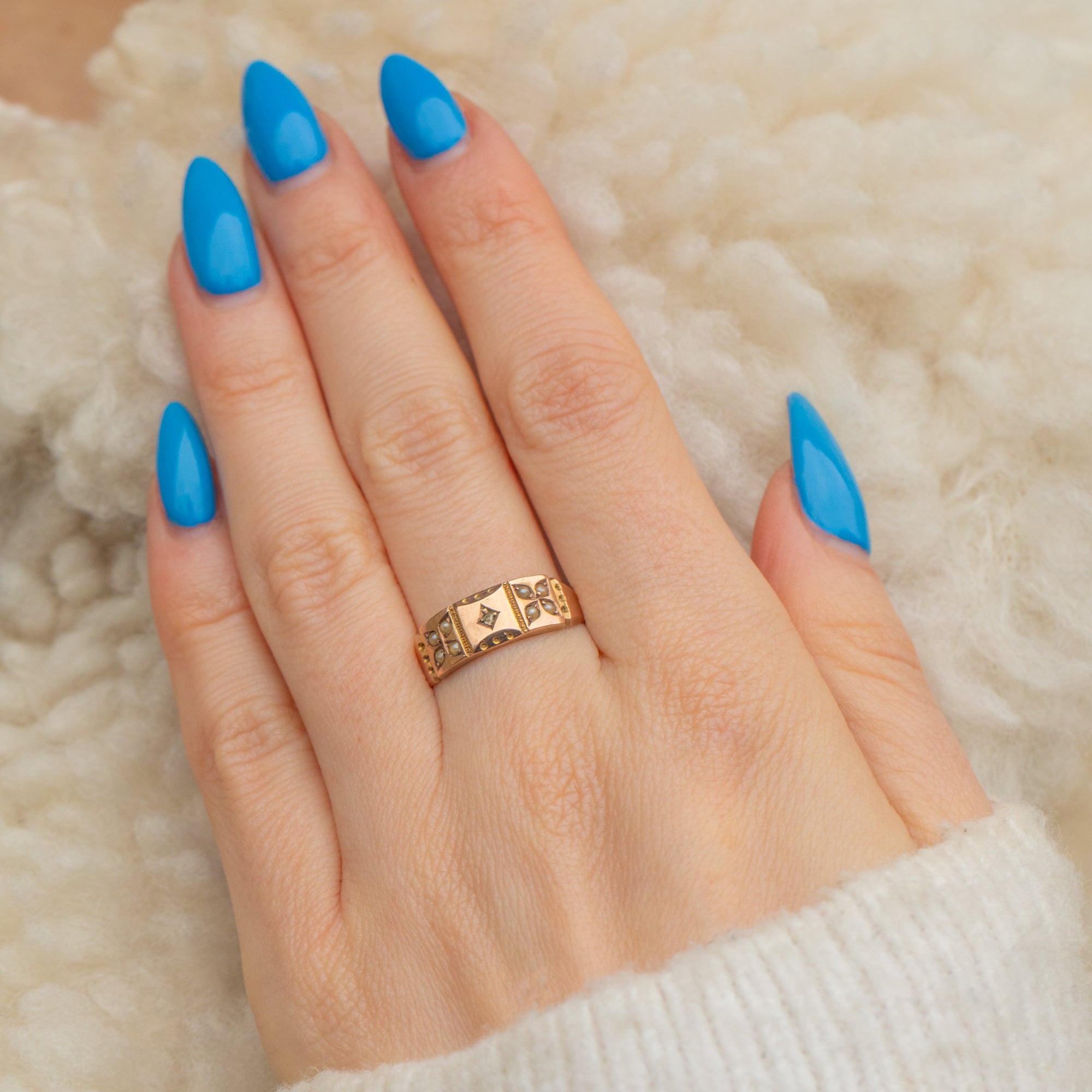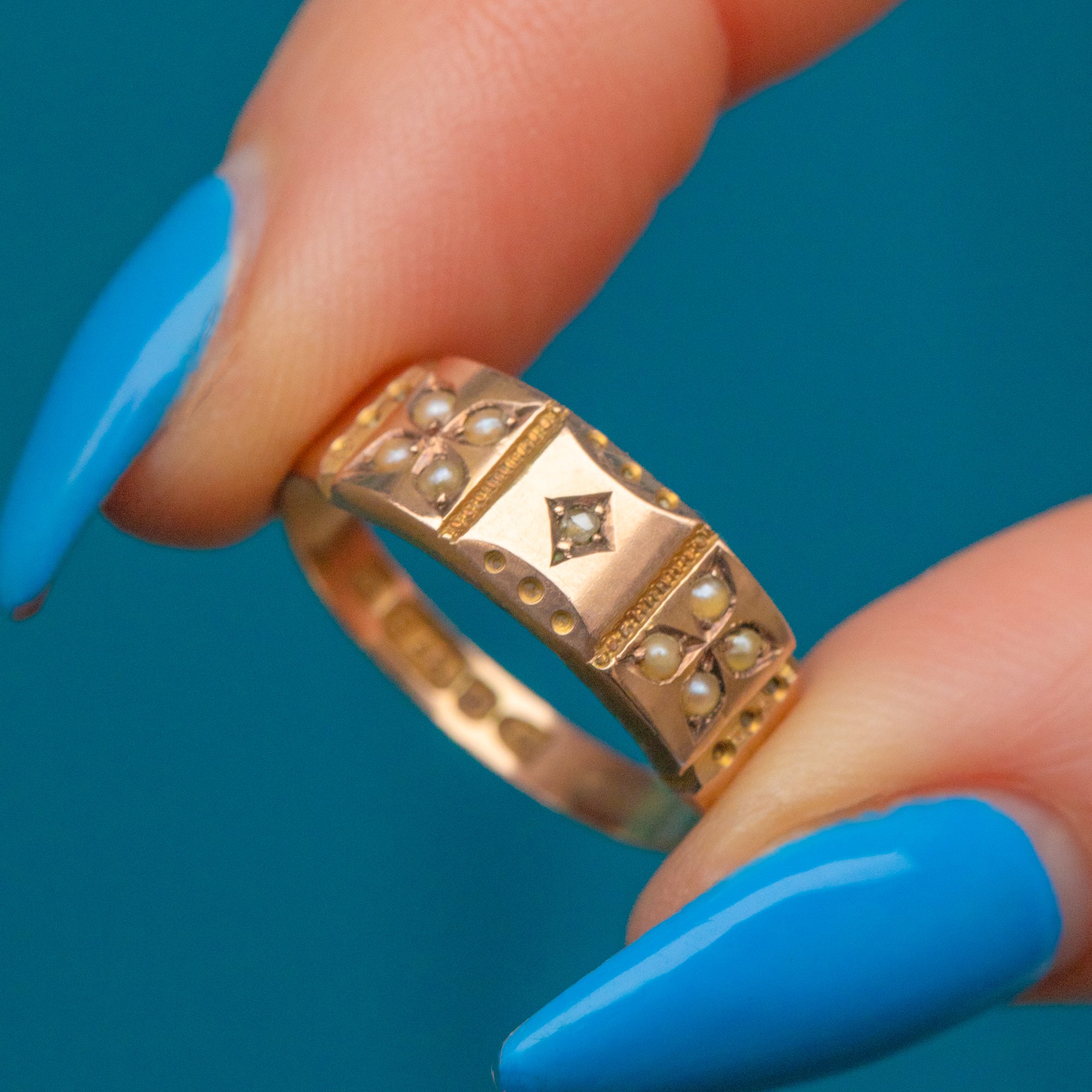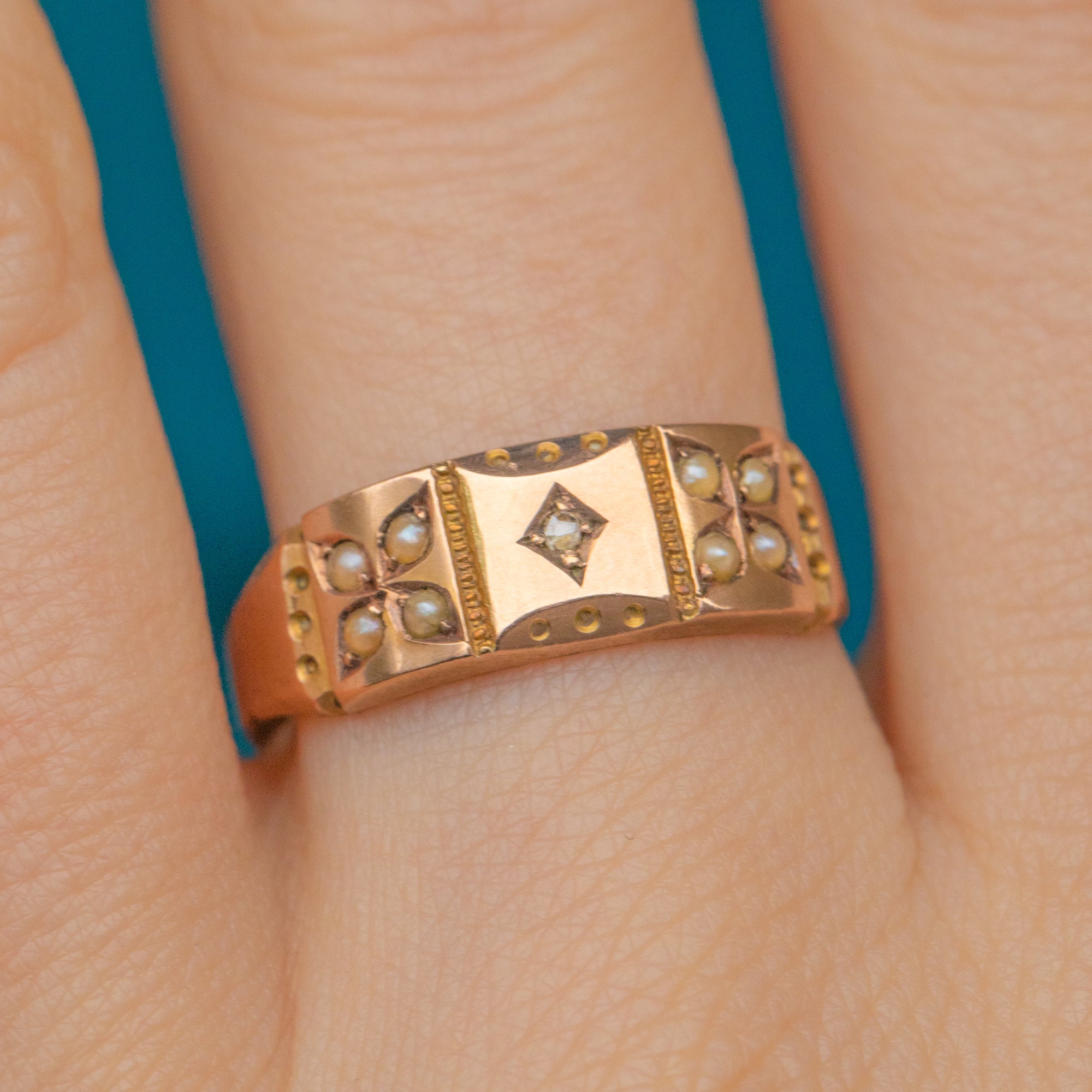 This antique 9ct Gold Pearl Diamond gypsy ring is such a gorgeous piece and perfect for everyday wear! Comfortable to wear and inlaid with a pretty selection of seed Pearls and a rose-cut Diamond, you will fall instantly in love with this delightful Art Deco ring.