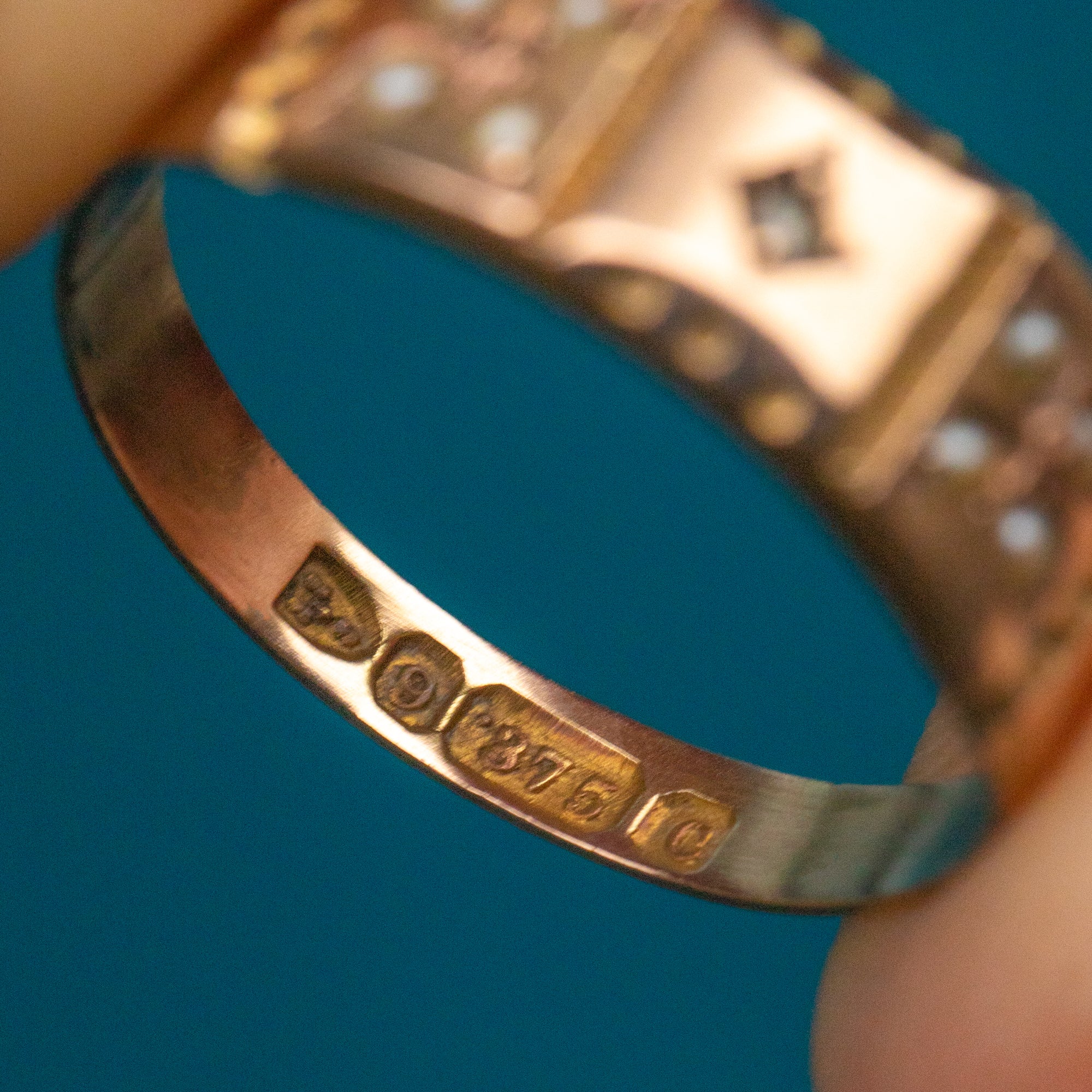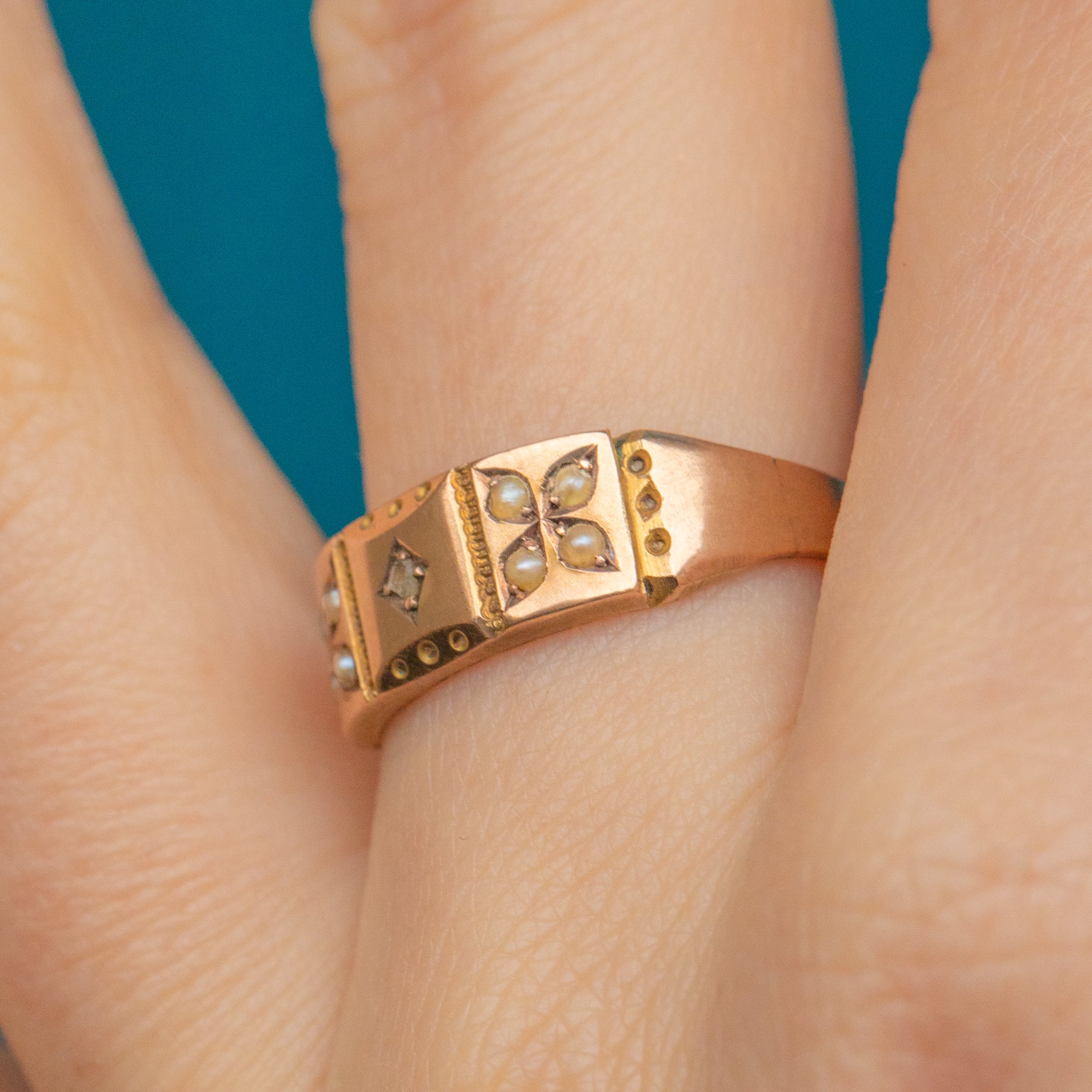 Antique 9ct Gold Pearl Diamond Gypsy Ring