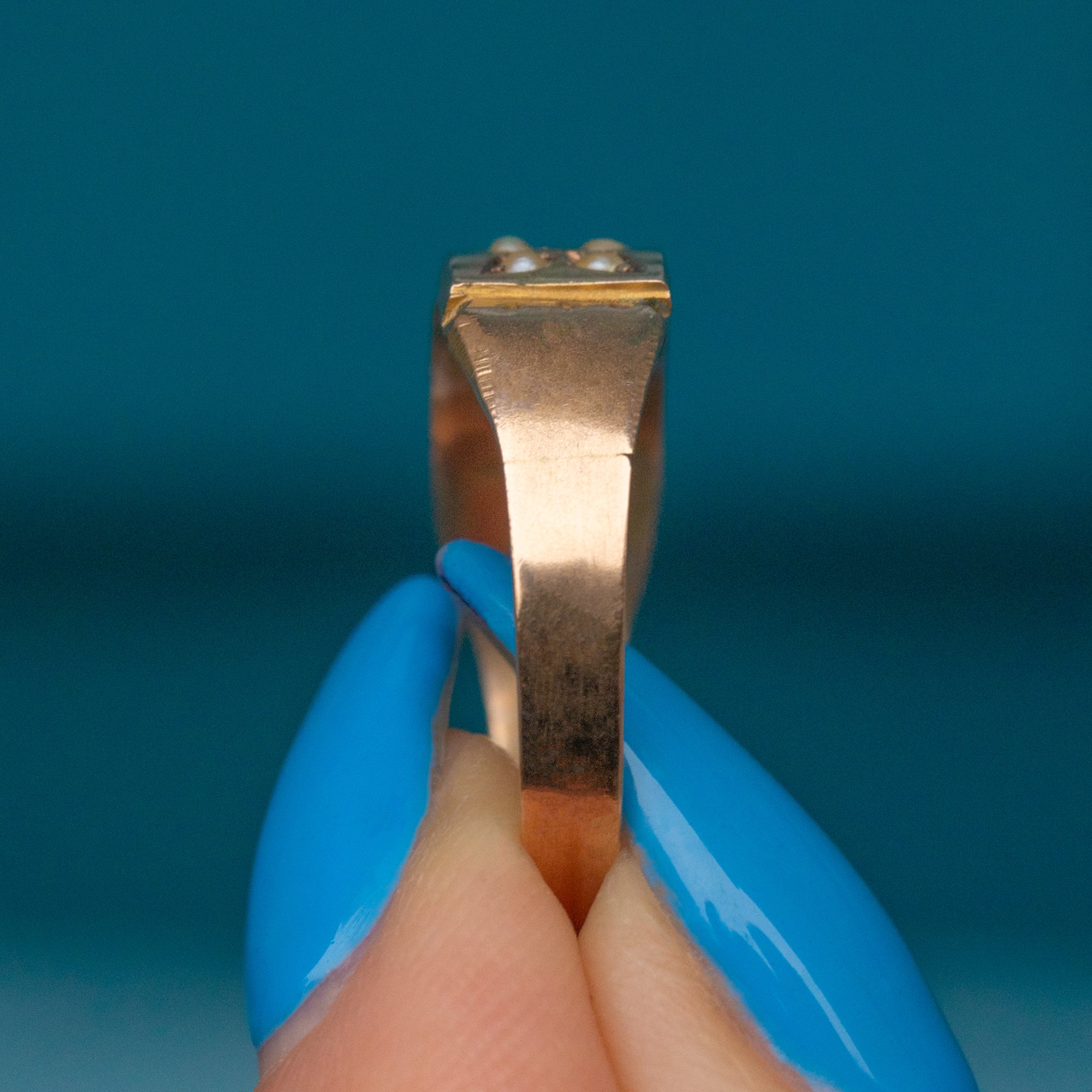 VERY GOOD. This antique 9ct Gold Pearl Diamond gypsy ring is in spectacular vintage condition. The 9ct Gold has smoothed to luxuriously hug your finger in all of the right places, and both the exterior engravings and hallmarks are crisp. There is some light surface wear and a previous resize at the back of the band, but this hardly affects the overall impact of the ring. The gemstones are securely set with no signs of wear, promising many more years of enjoyment!