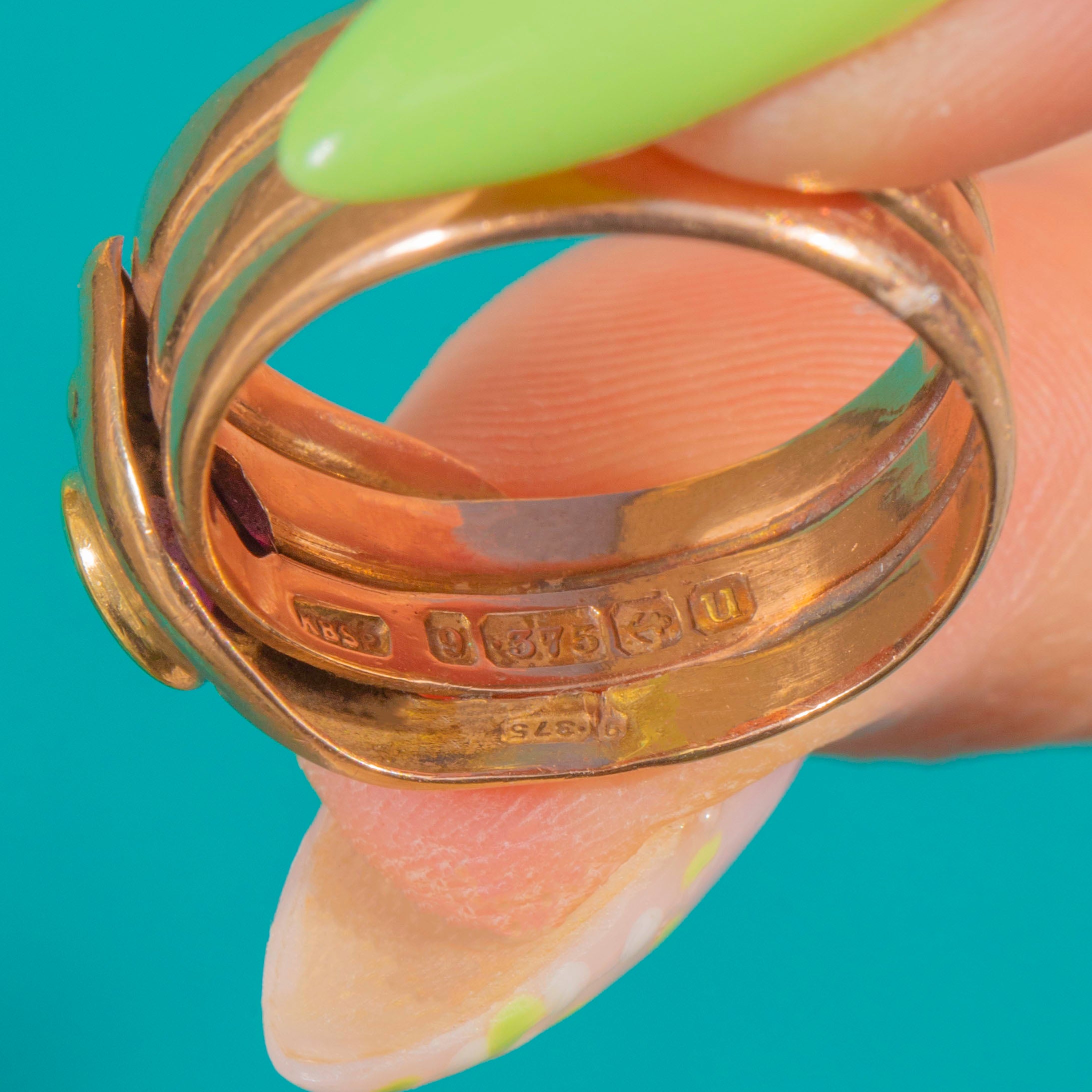 A sinuous 9ct Gold snake ring with a bold triple-coil shank, crowned by a bezel-set Ruby in the serpent’s head. The warm Gold and sculptural wrap-around silhouette give this piece wonderful presence on the hand.