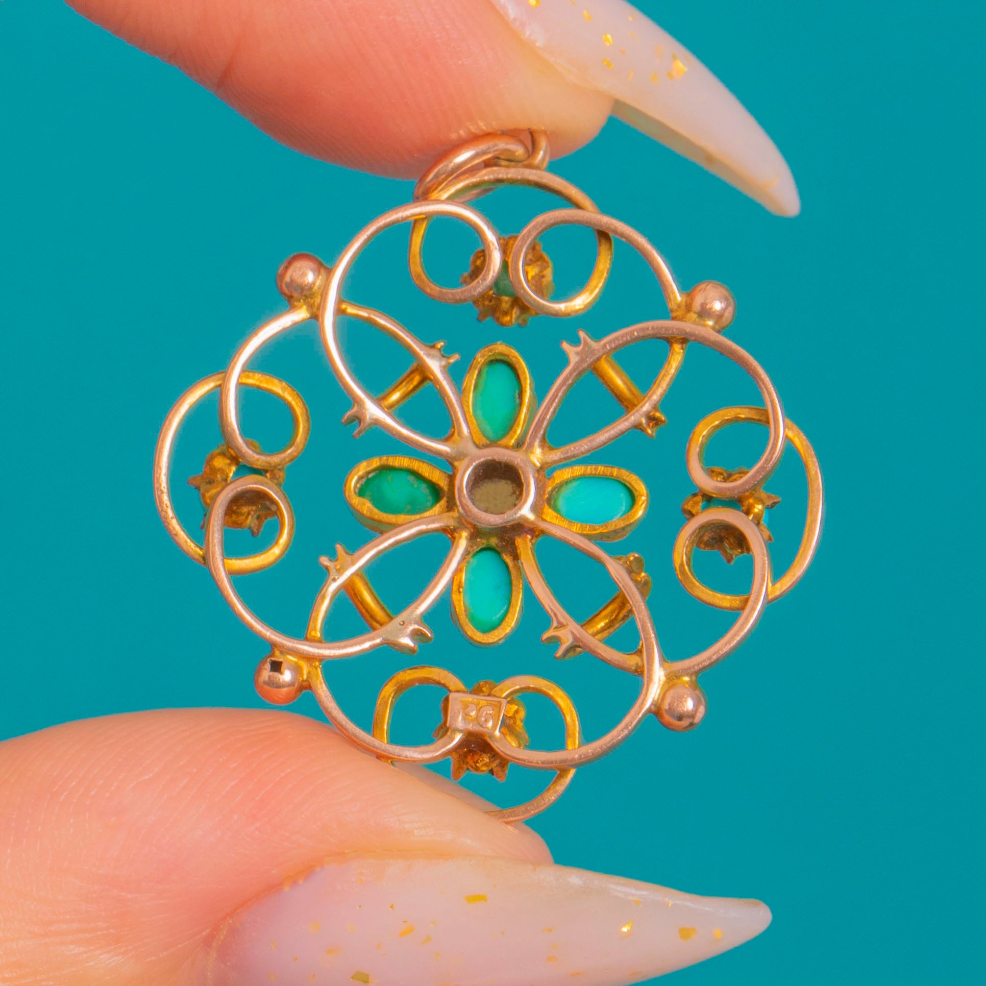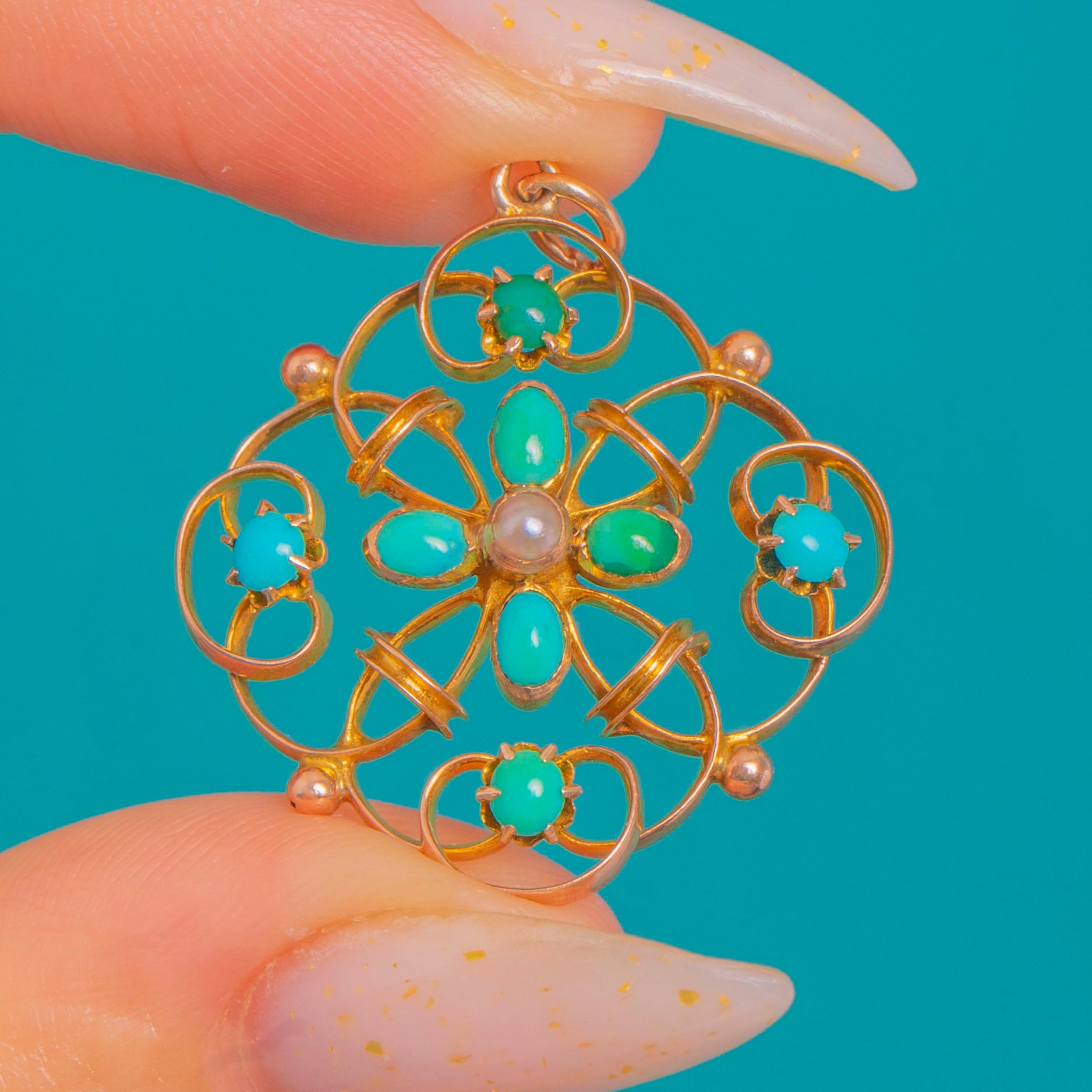 Delicate, lacy and unmistakably Edwardian, this openwork pendant marries glossy Turquoise with a creamy Pearl in a charming Celtic-inspired motif. Crafted in glowing 9ct Gold, the design forms a floral rosette within a soft quatrefoil cartouche, its scrolling wirework and tiny granule accents adding a refined, hand-wrought finesse.