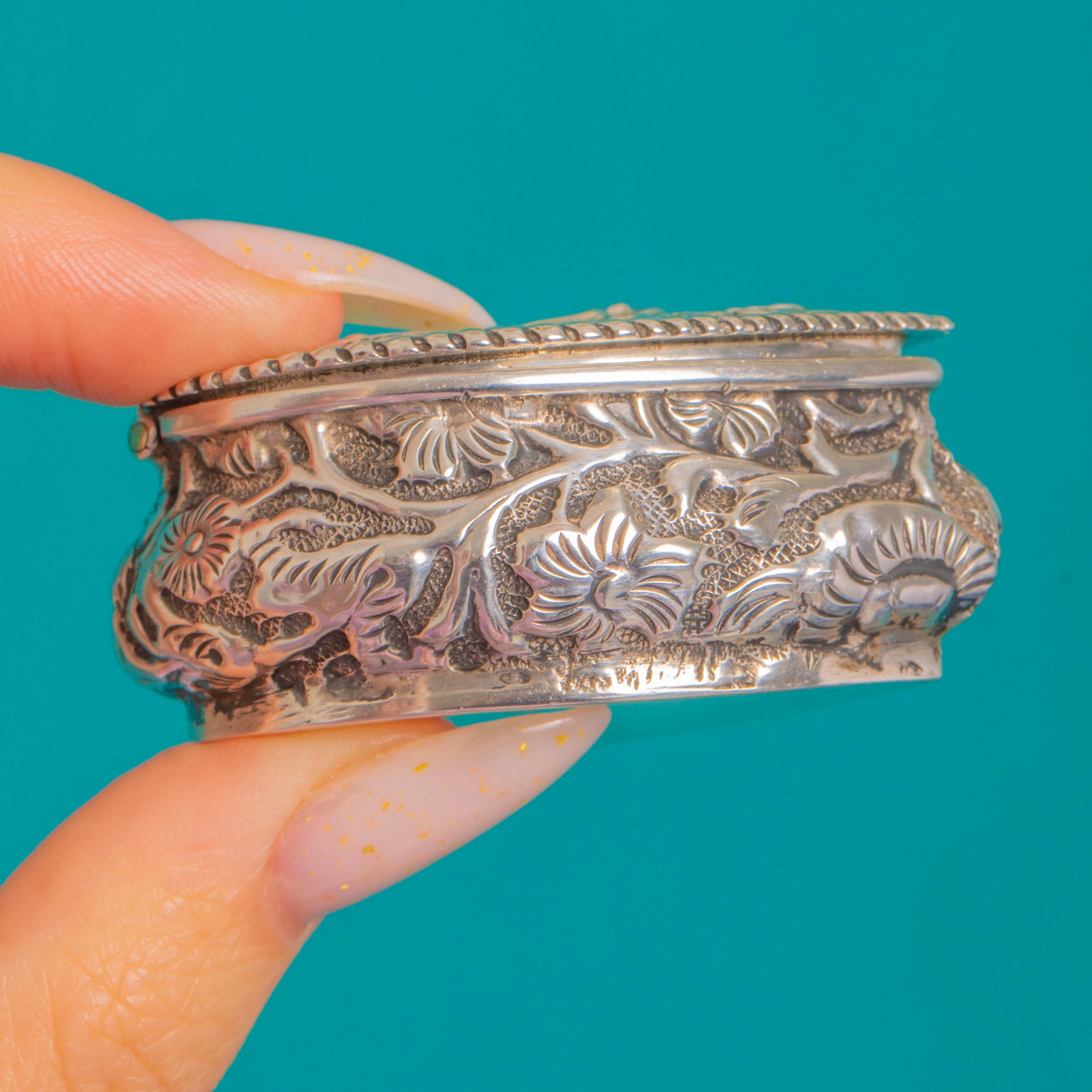 Open the side hinge via the neat thumb notch to reveal a fully gilt interior with chased detail—an elegant surprise that speaks to the quality of its making. Hallmarked in Birmingham with maker’s mark HM, the Lion Passant and the date letter z for 1899, it’s a charming piece of late Victorian craftsmanship in Sterling Silver.