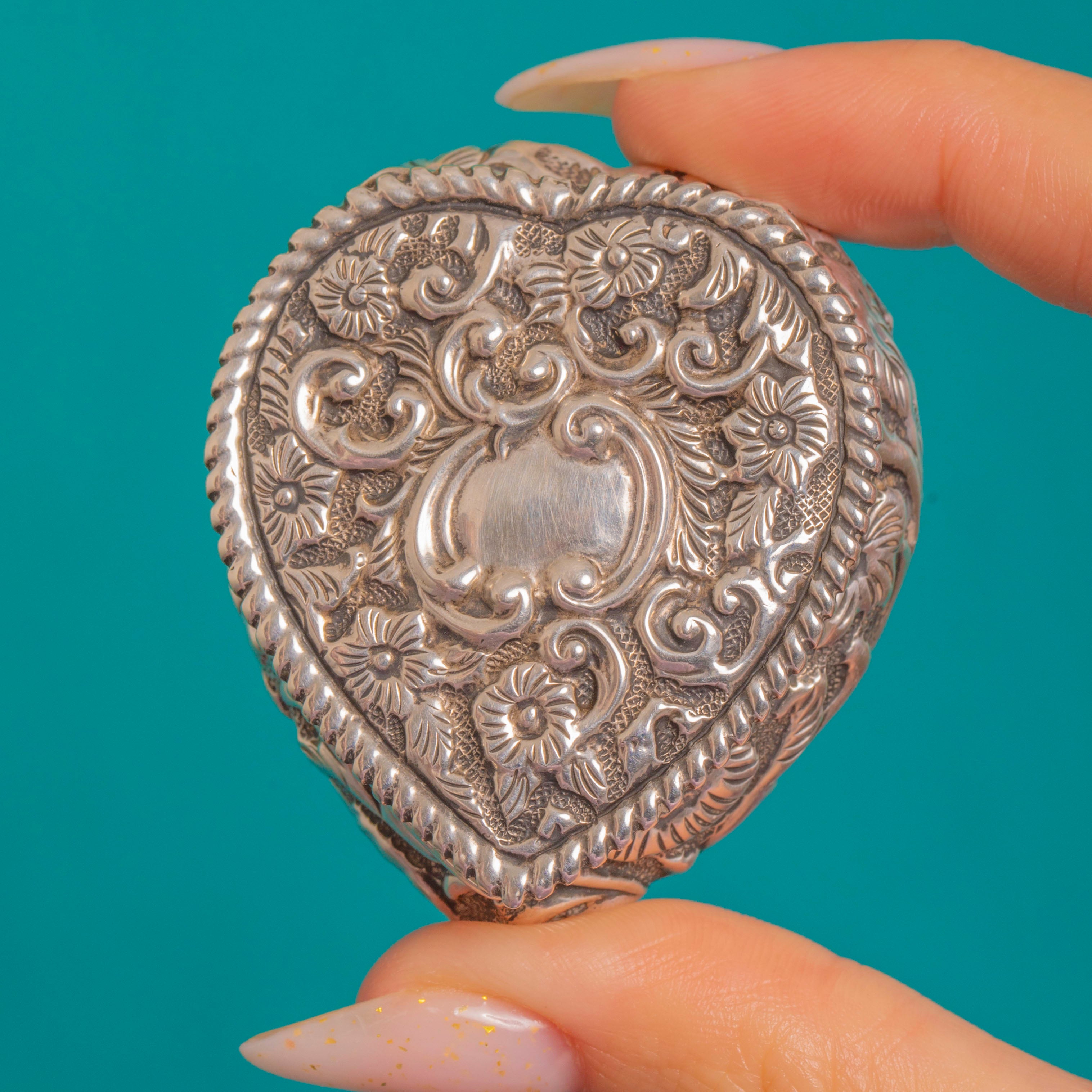 Antique Embossed Silver Heart Trinket Box, c.1889