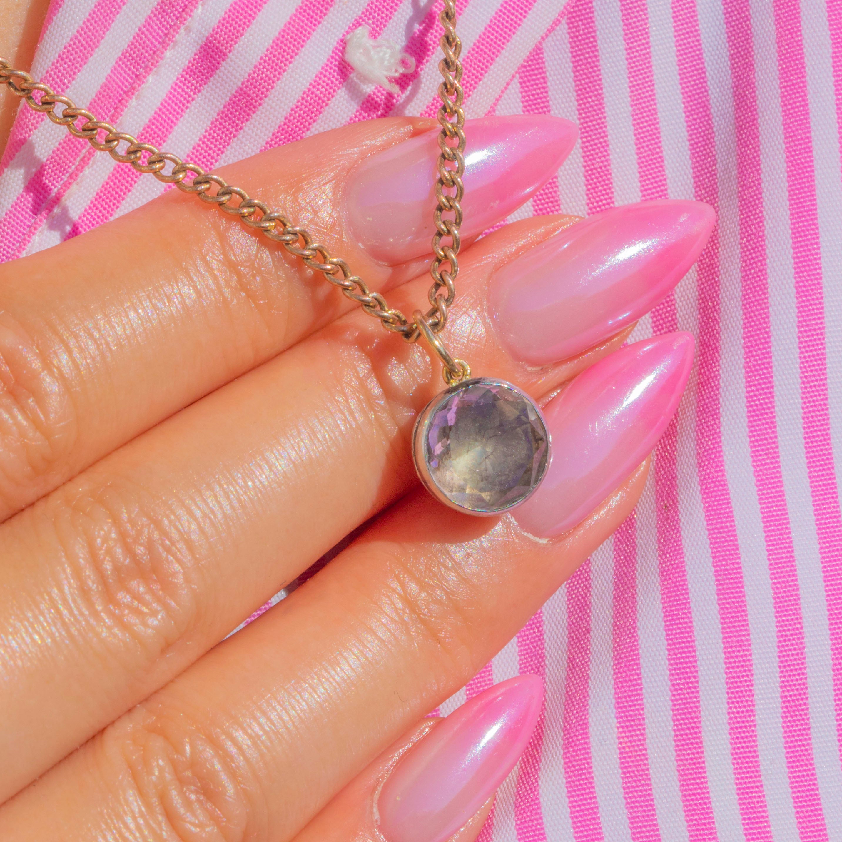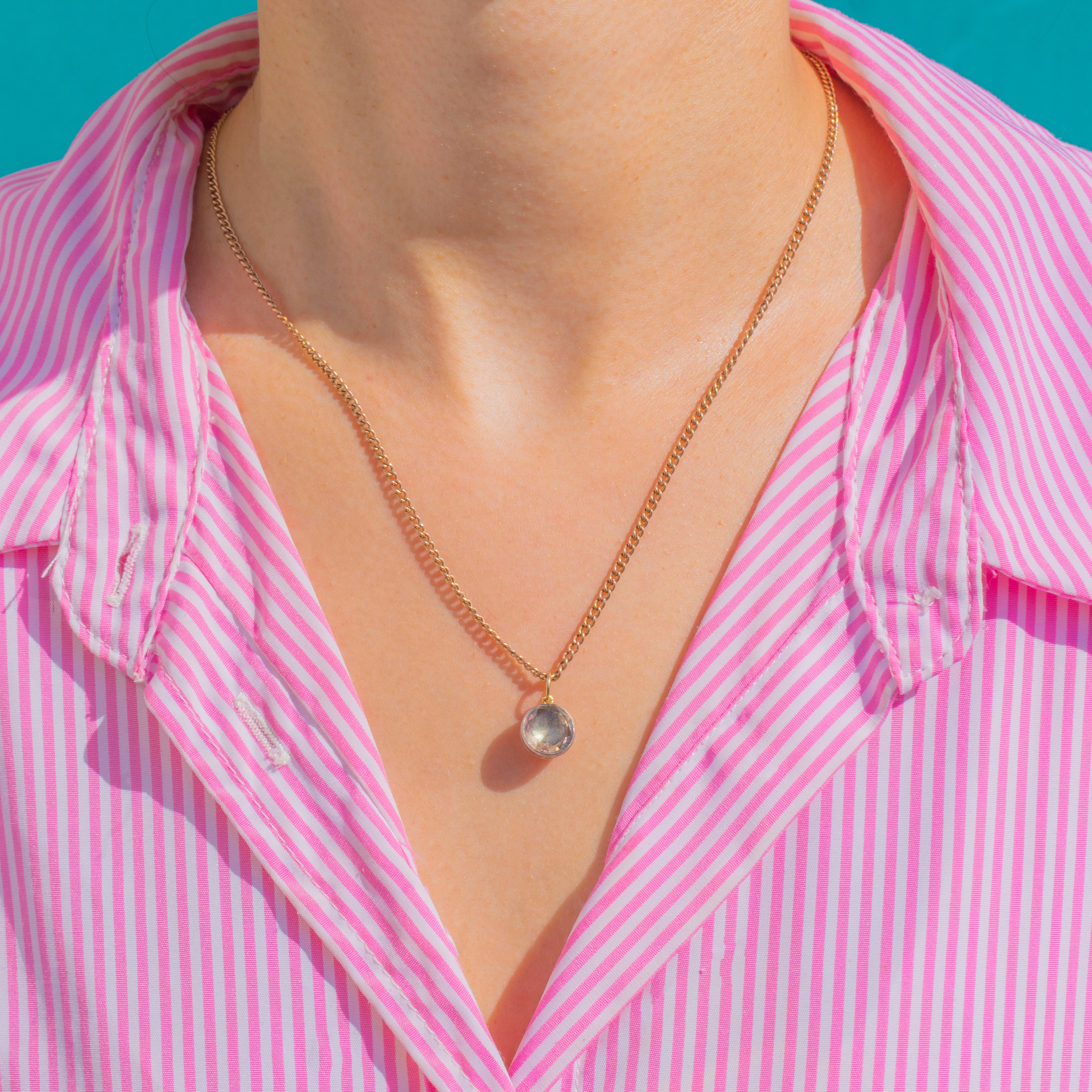 A luminous Georgian Silver foiled Rock Crystal charm, petite yet full of presence. The round Rock Crystal sits in a smooth bezel, its foil backing magnifying the stone’s watery brilliance with that soft, romantic glow collectors adore. Subtle mixed metals—Silver with a touch of 9ct Gold—lend an elegant contrast that feels timeless and chic.