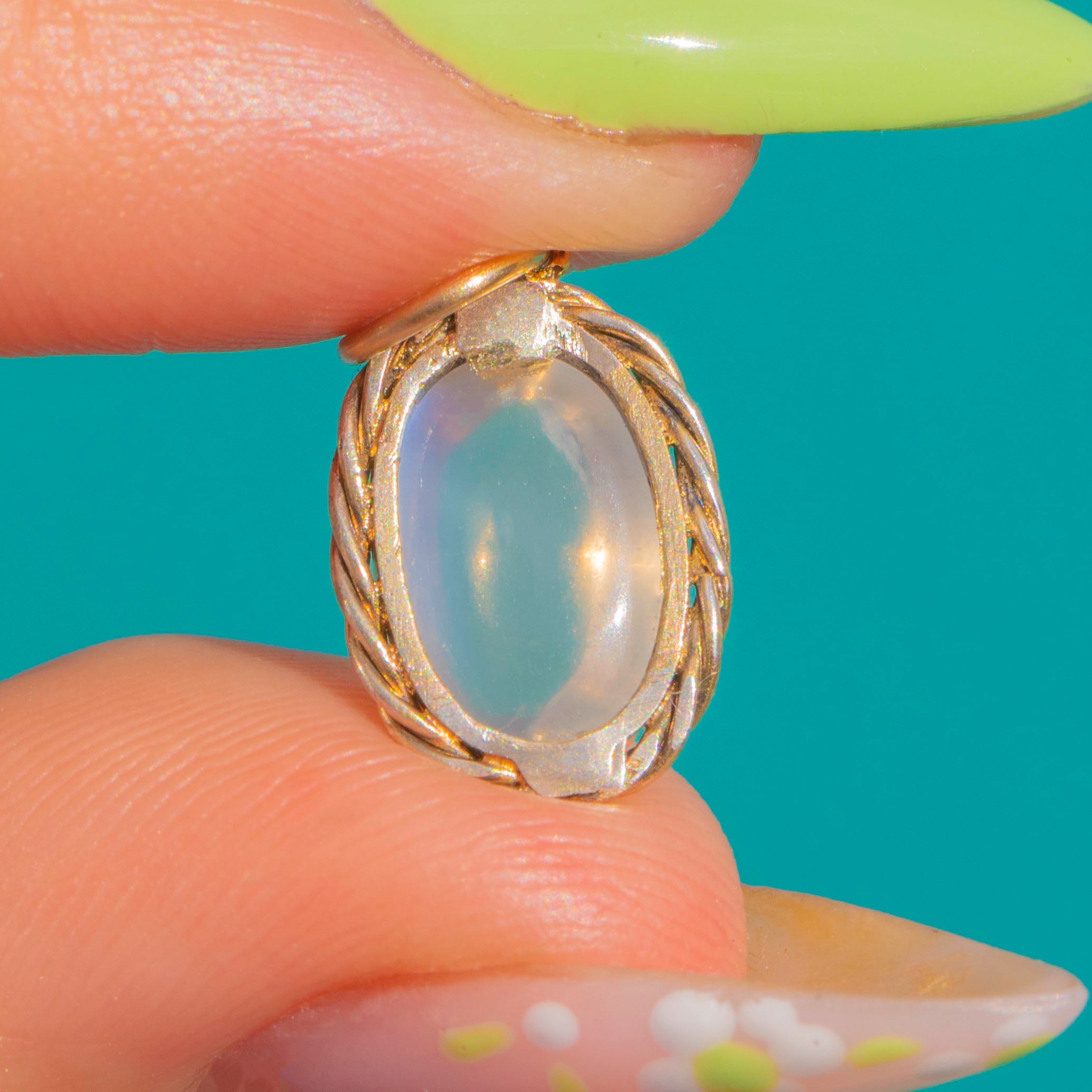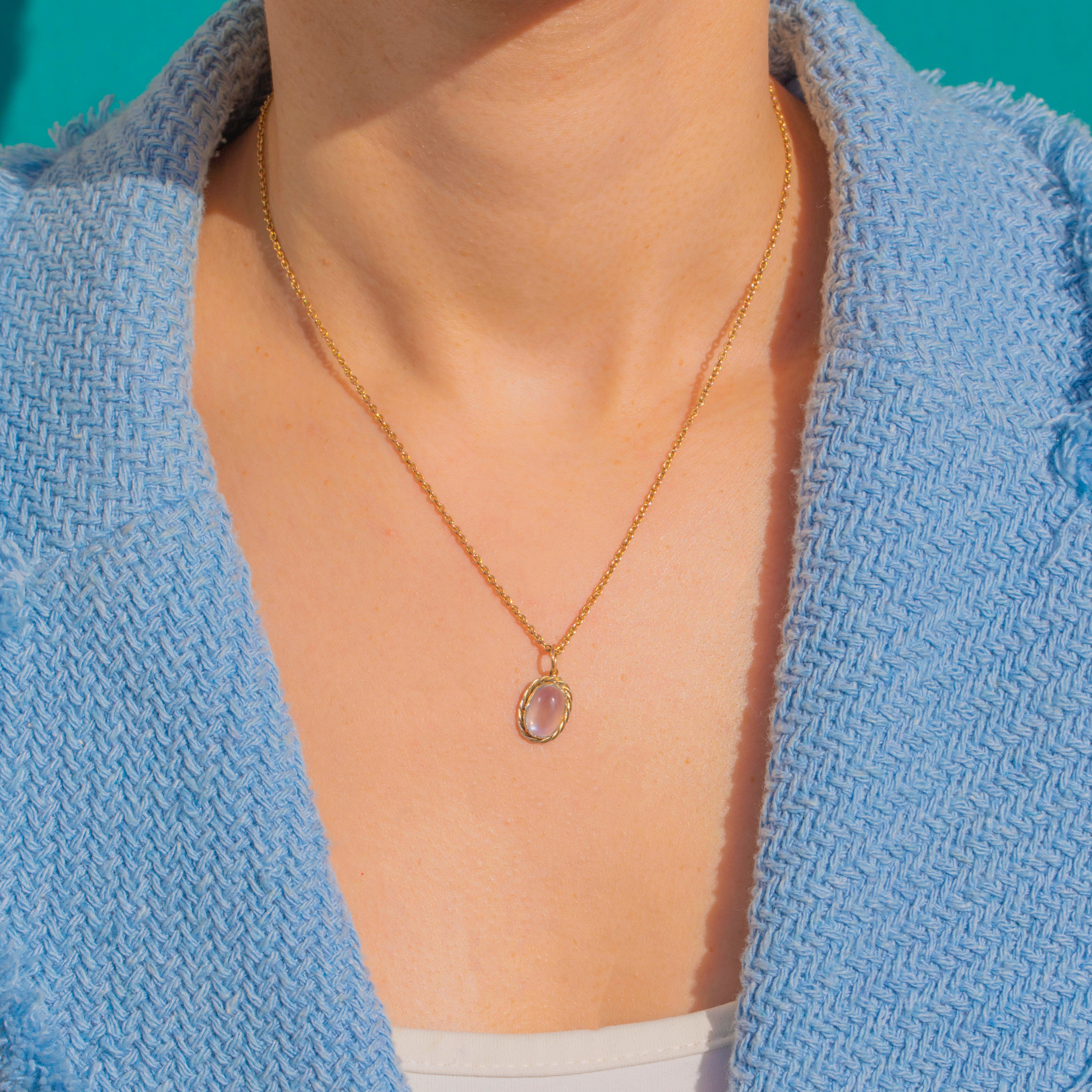 A dreamy Moonstone cabochon glows with soft blue-white to pale lavender adularescence in this delicate Victorian pendant. The oval stone is embraced by a closed bezel and framed with a woven rope-twist border in Gold gilded Silver, lending elegant texture and a timeless, romantic finish.