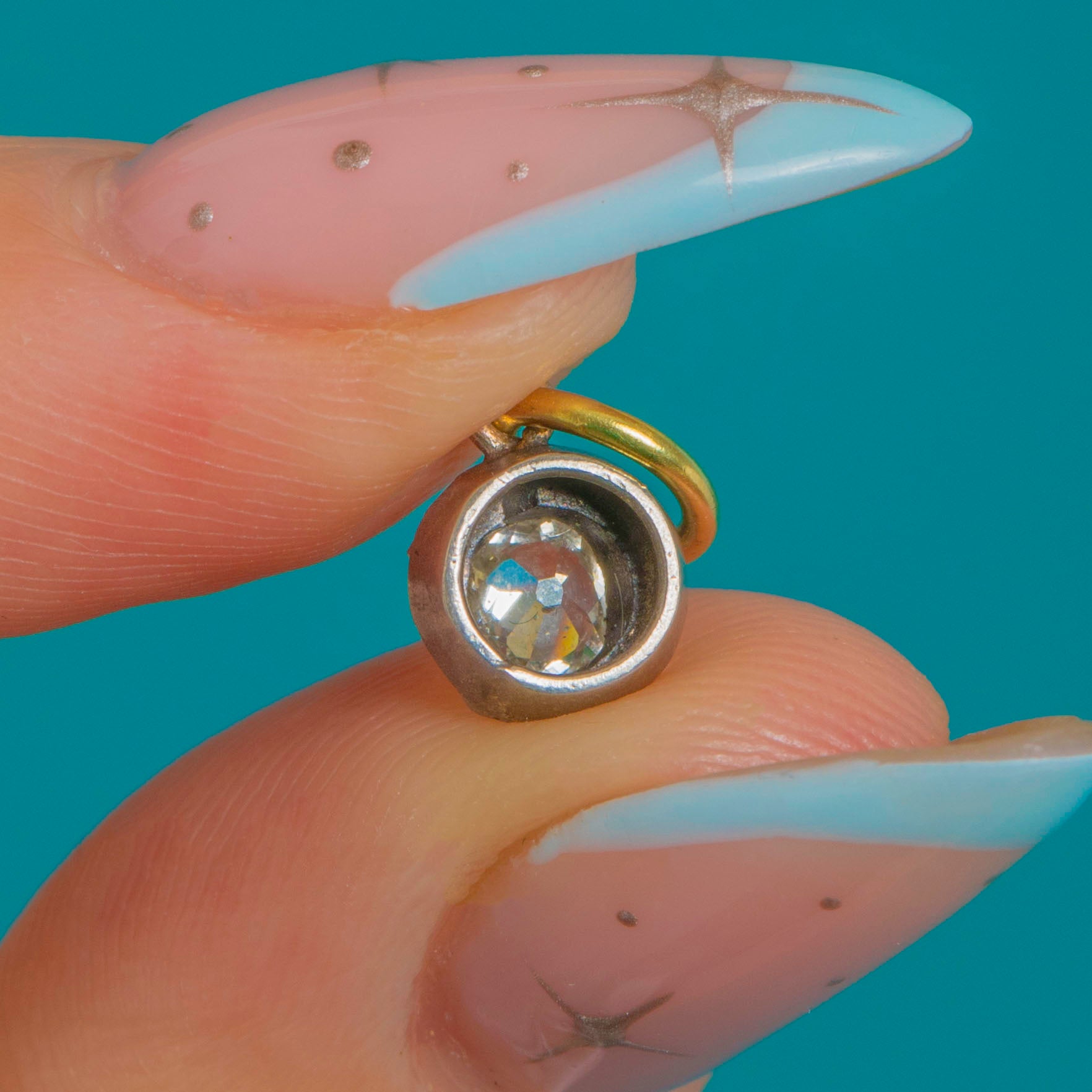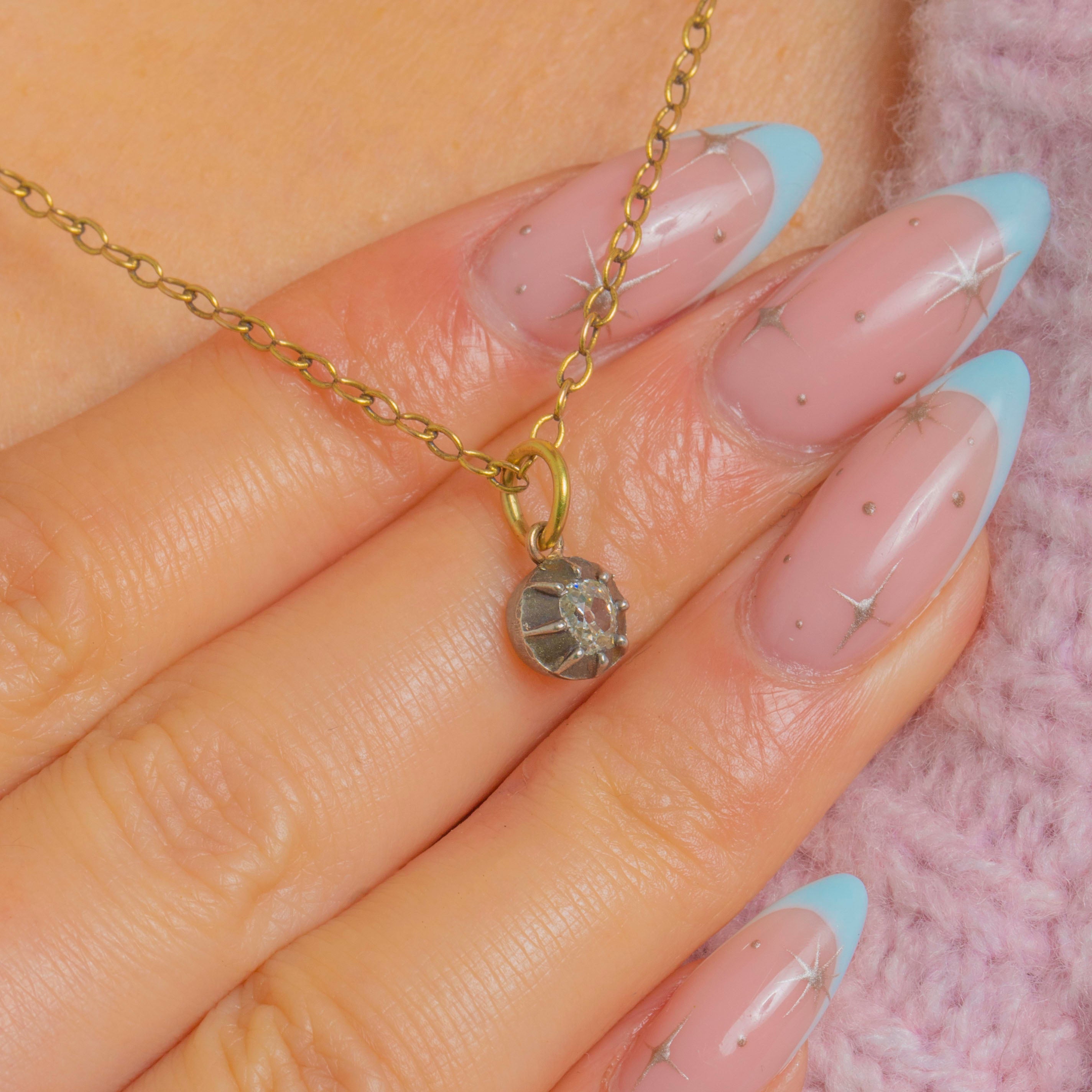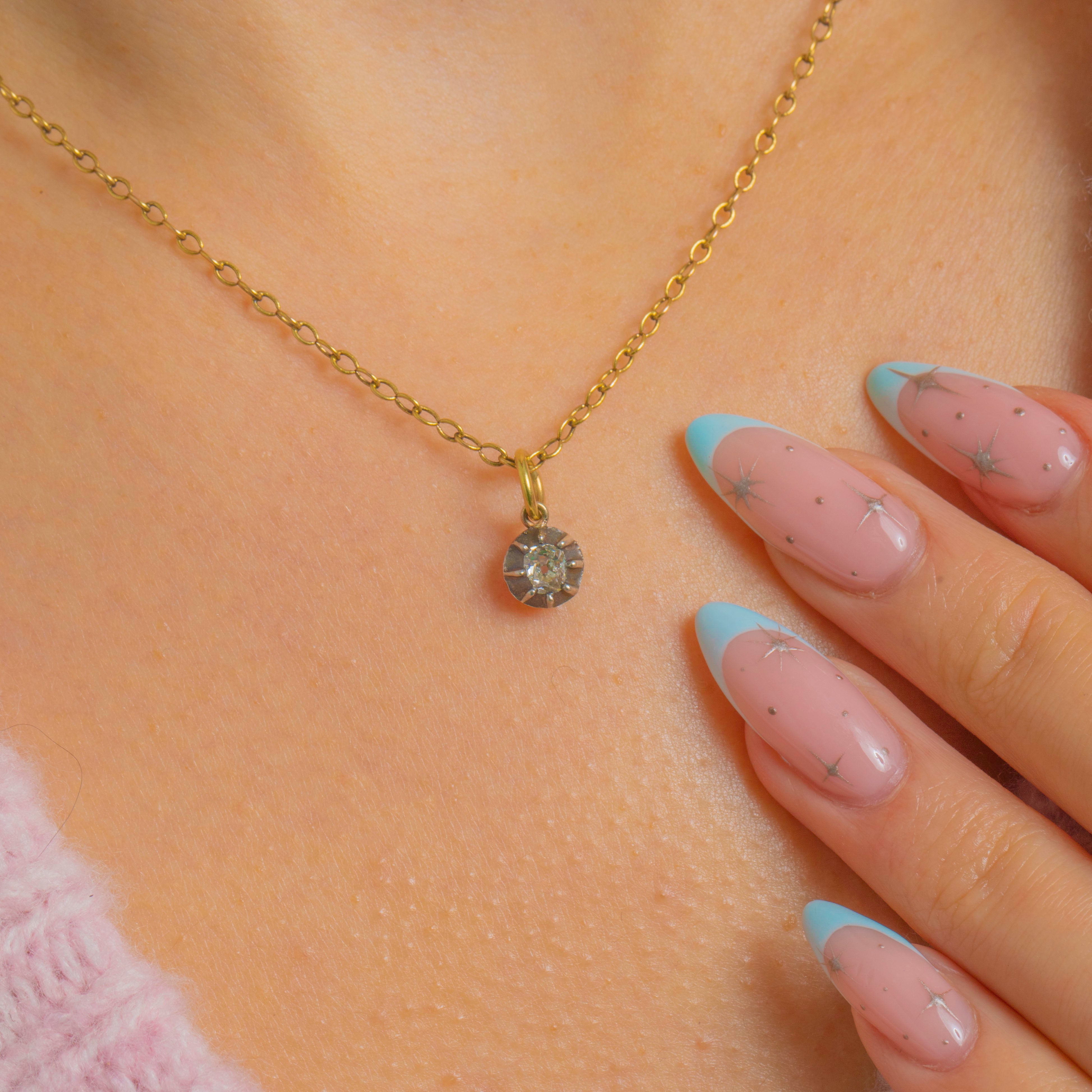 VERY GOOD-EXCELLENT. This Victorian old-mine cut Diamond charm is in lovely condition! Although the Diamond has one small fleabite, only notable under a jeweller's loupe, her sparkle is sensational and she is securely set, guaranteed to last a lifetime. The Diamond is radiant as ever, which is incredible considering her age.