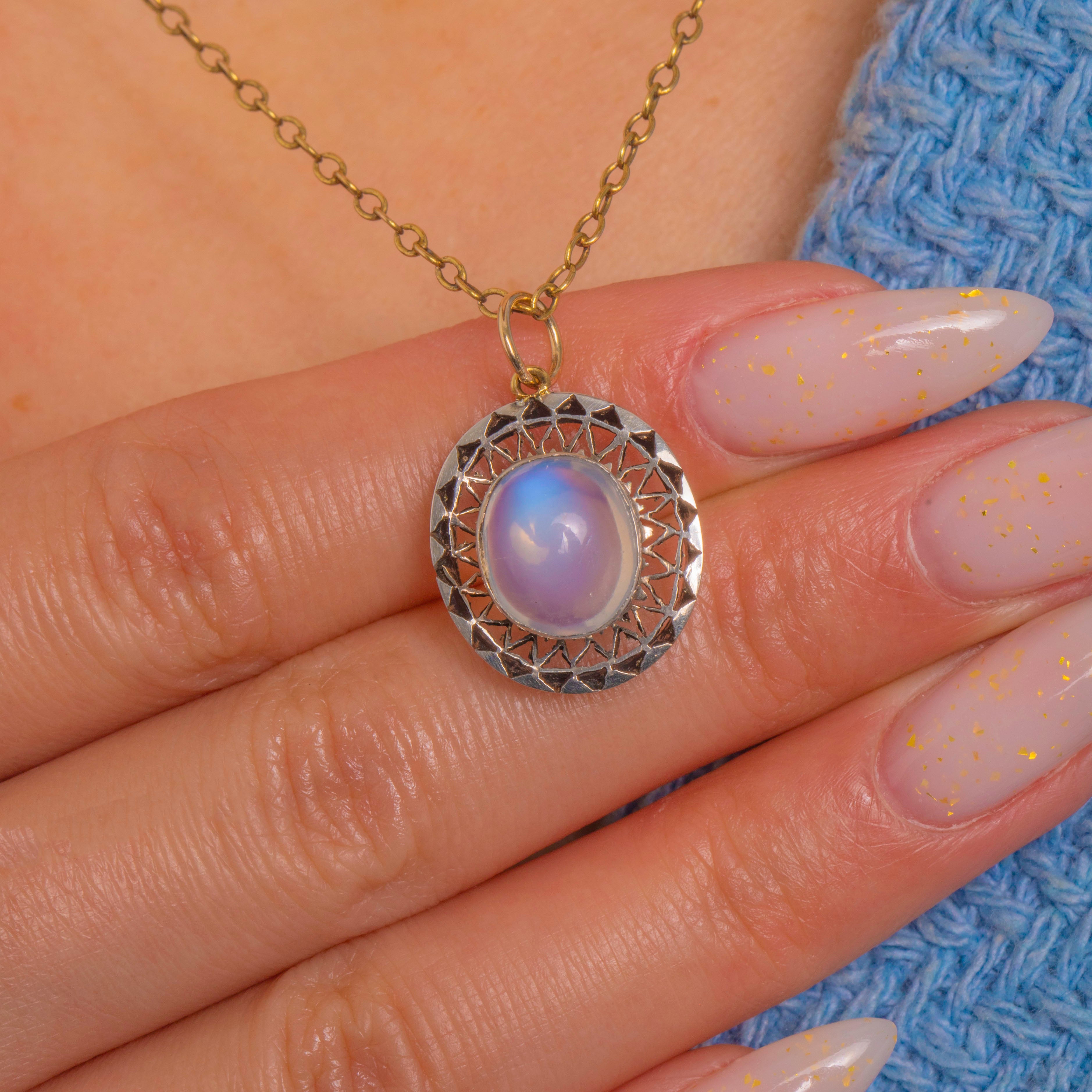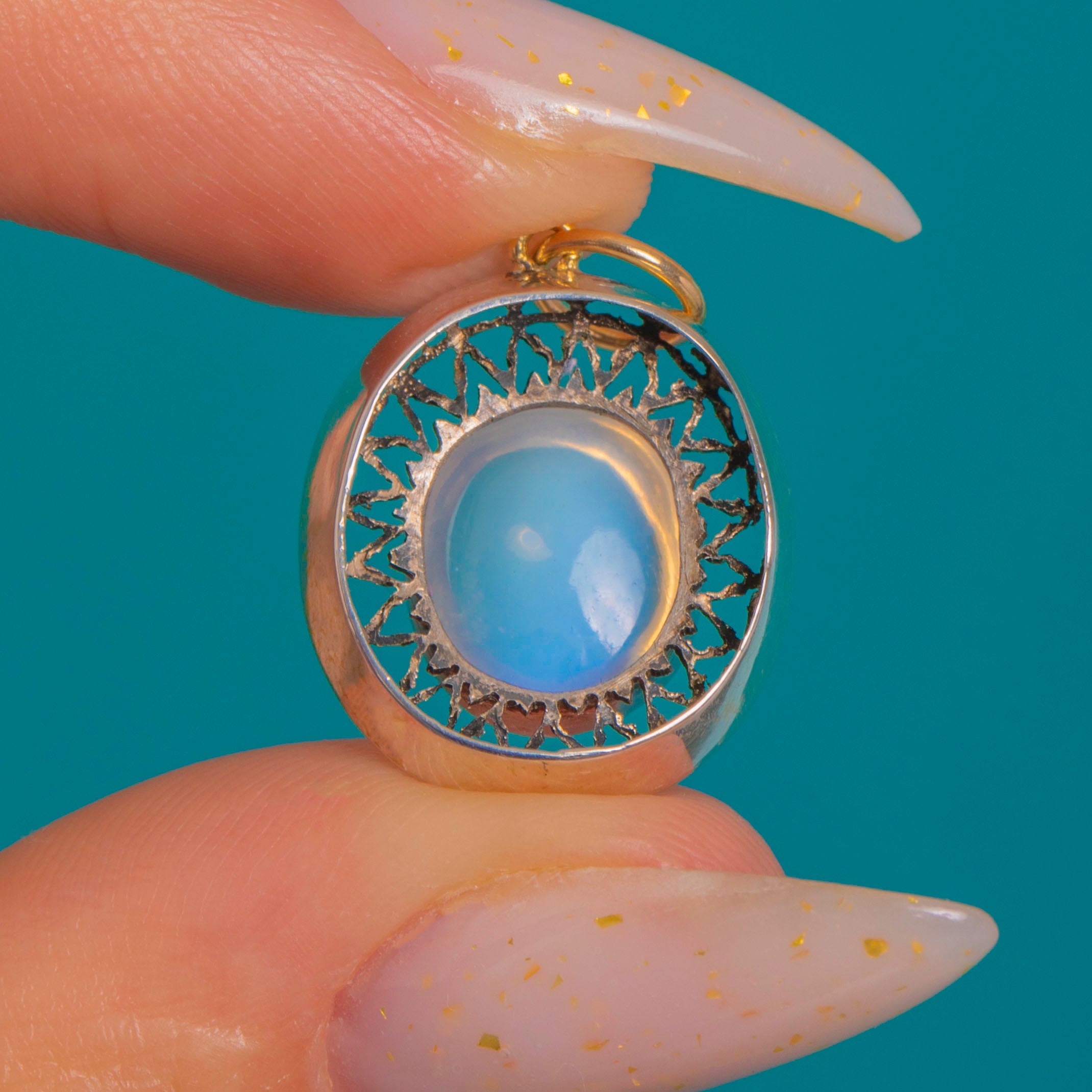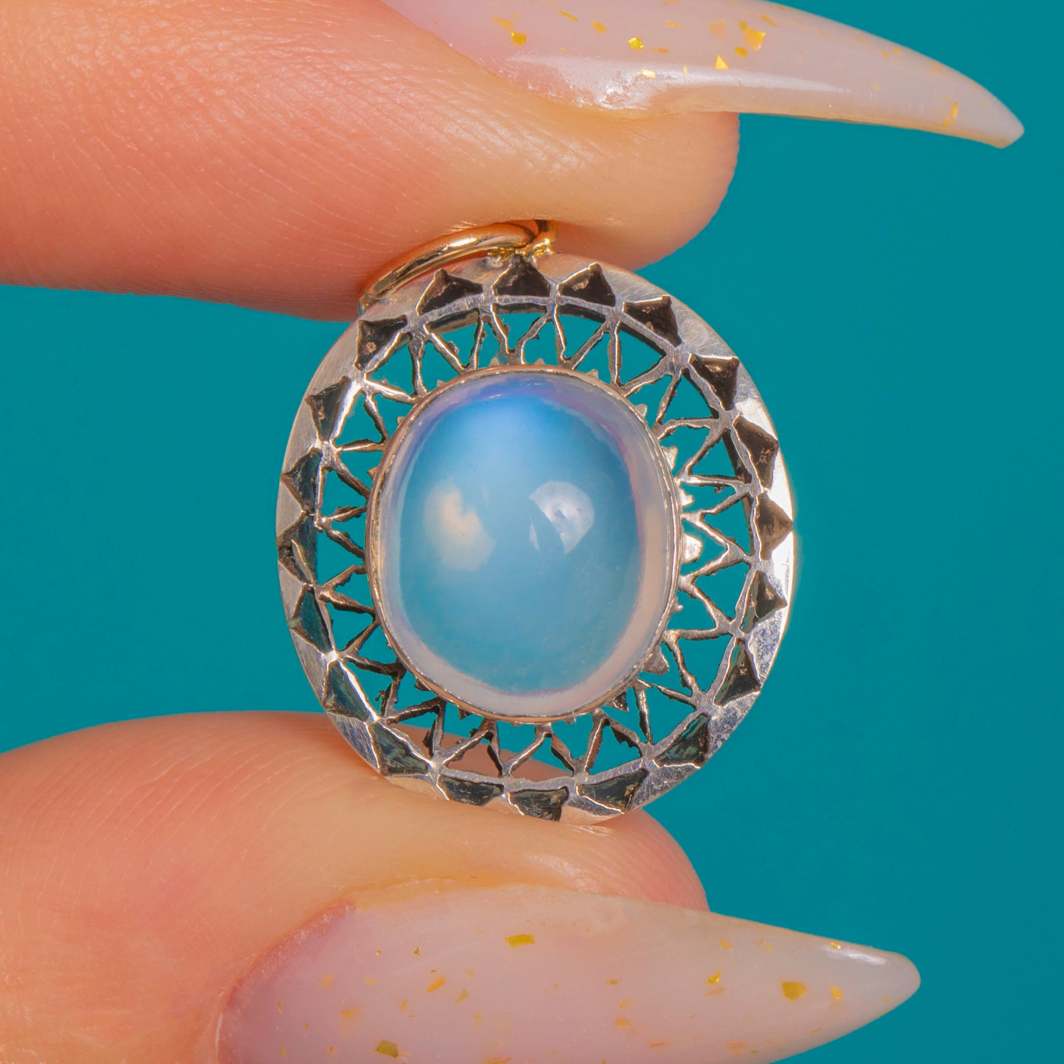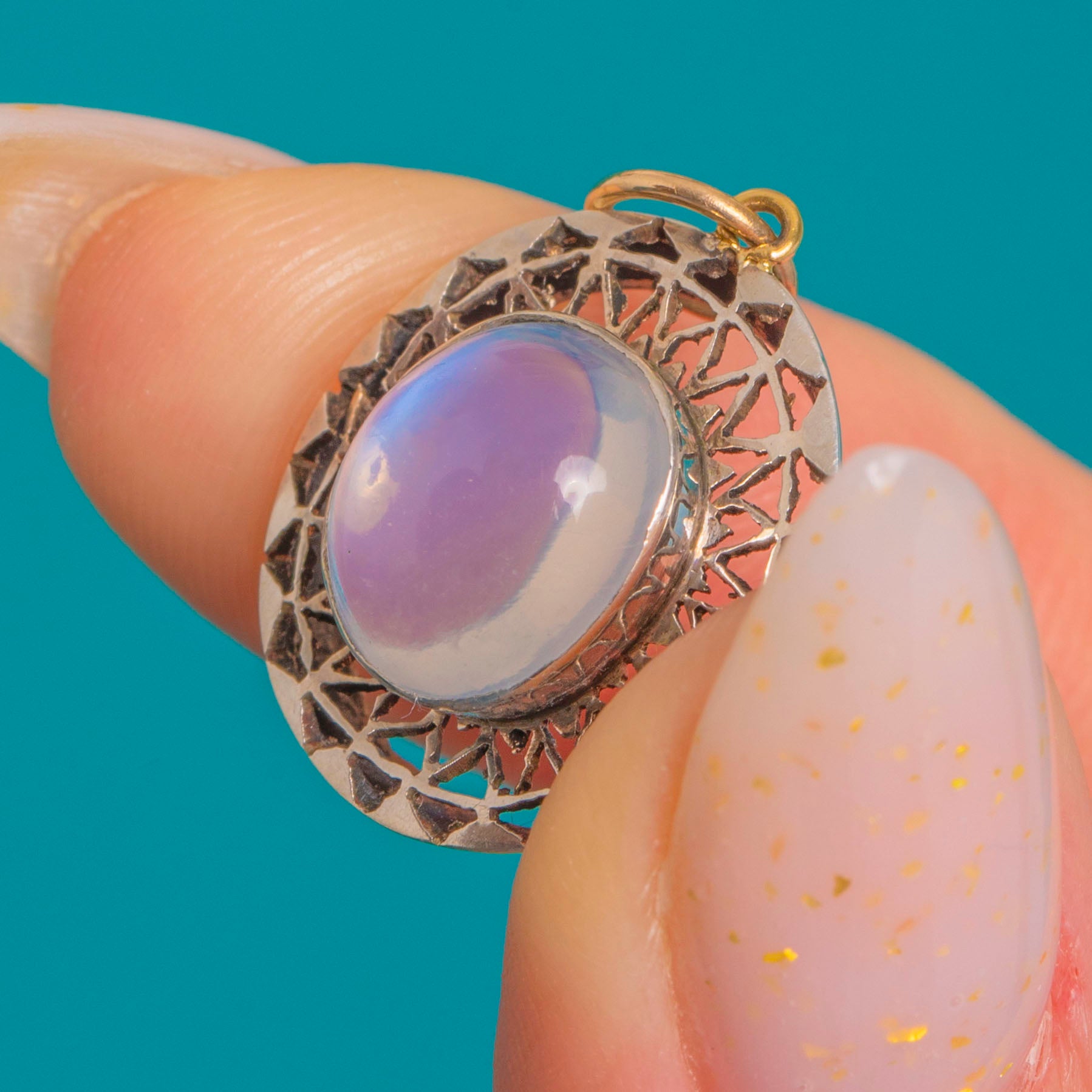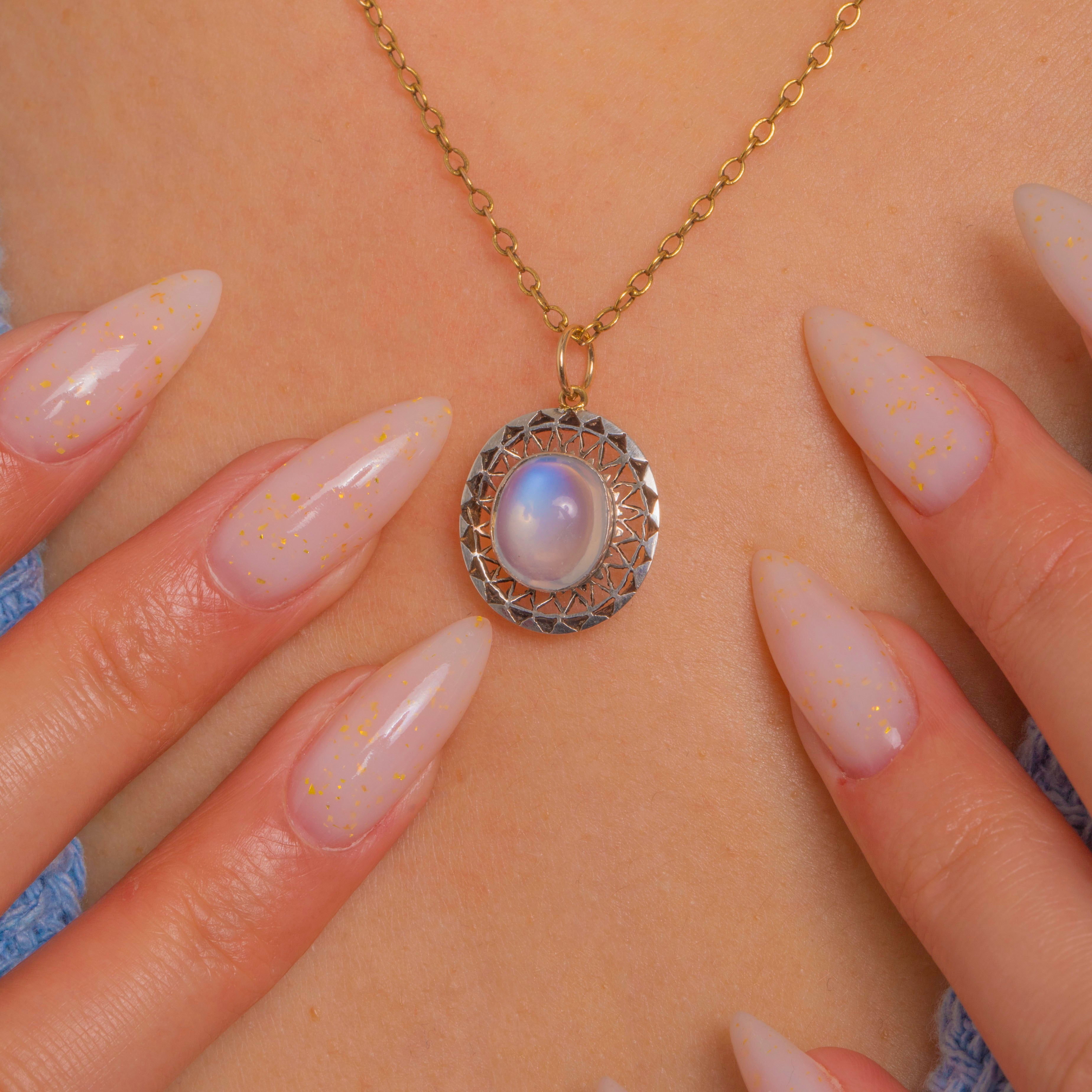 Glowing with ethereal allure, this Edwardian Moonstone charm pairs a luminous 1.25ct cabochon with a crisp halo of Silver filigree. The domed Moonstone shimmers with that coveted blue-lilac adularescence, set securely in a smooth rub-over nezel for a sleek, refined finish.