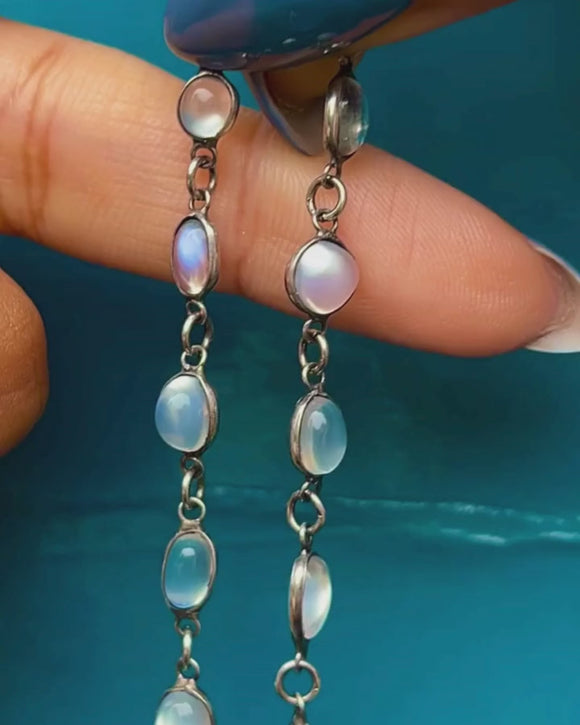 Calling all Moonstone lovers, this antique Silver Moonstone Riviere necklace could be just what your antique jewellery collection has been missing! Her 24" length is inlaid with a generous helping of Moonstones, with a combined carat weight of 28.45ct, emanating a soft blue schiller from their smooth cabochon surfaces. Encased in lustrous Sterling Silver settings, splendour is something this Victorian necklace has in abundance.