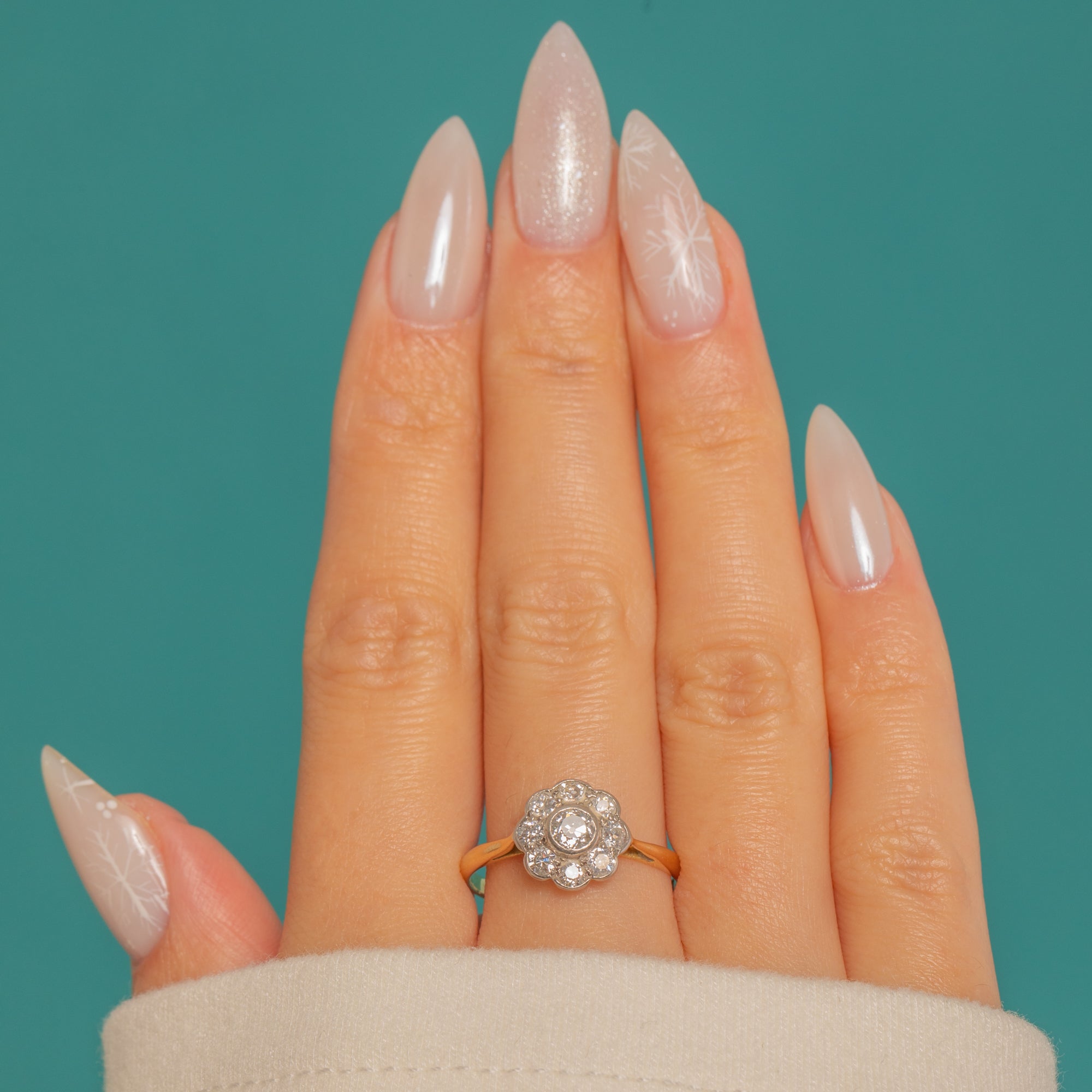 A refined Art Deco daisy cluster ring crafted in 18ct Gold with a Platinum scalloped head, set throughout with sparkling Old Mine Cut Diamonds. The central stone is hugged by a halo of eight matching Diamonds, each set in smooth bezels.