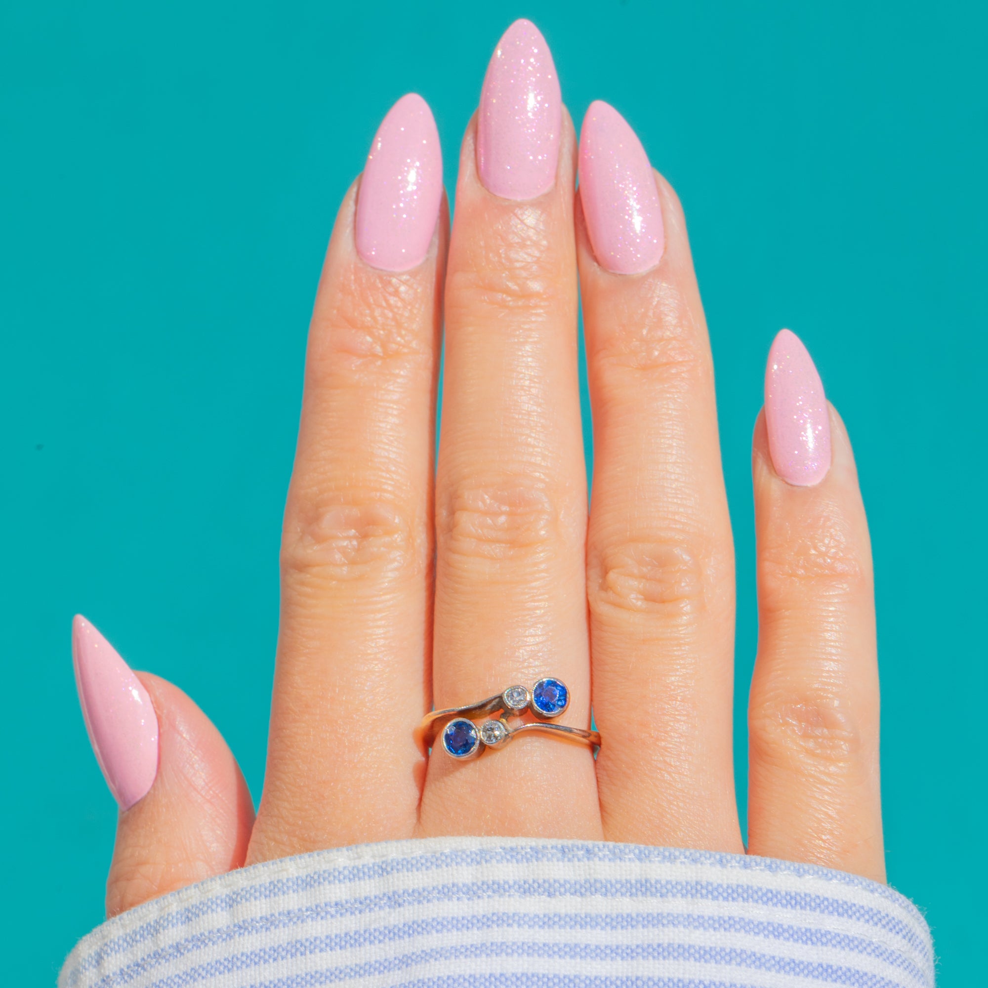 A classic Art Deco twist ring that marries warm 18ct Gold with cool Platinum for timeless contrast. Two round, velvety-blue Sapphires are set in low Platinum bezels and accented by petite Diamonds, forming an elegant, linear twist that glides across the finger.