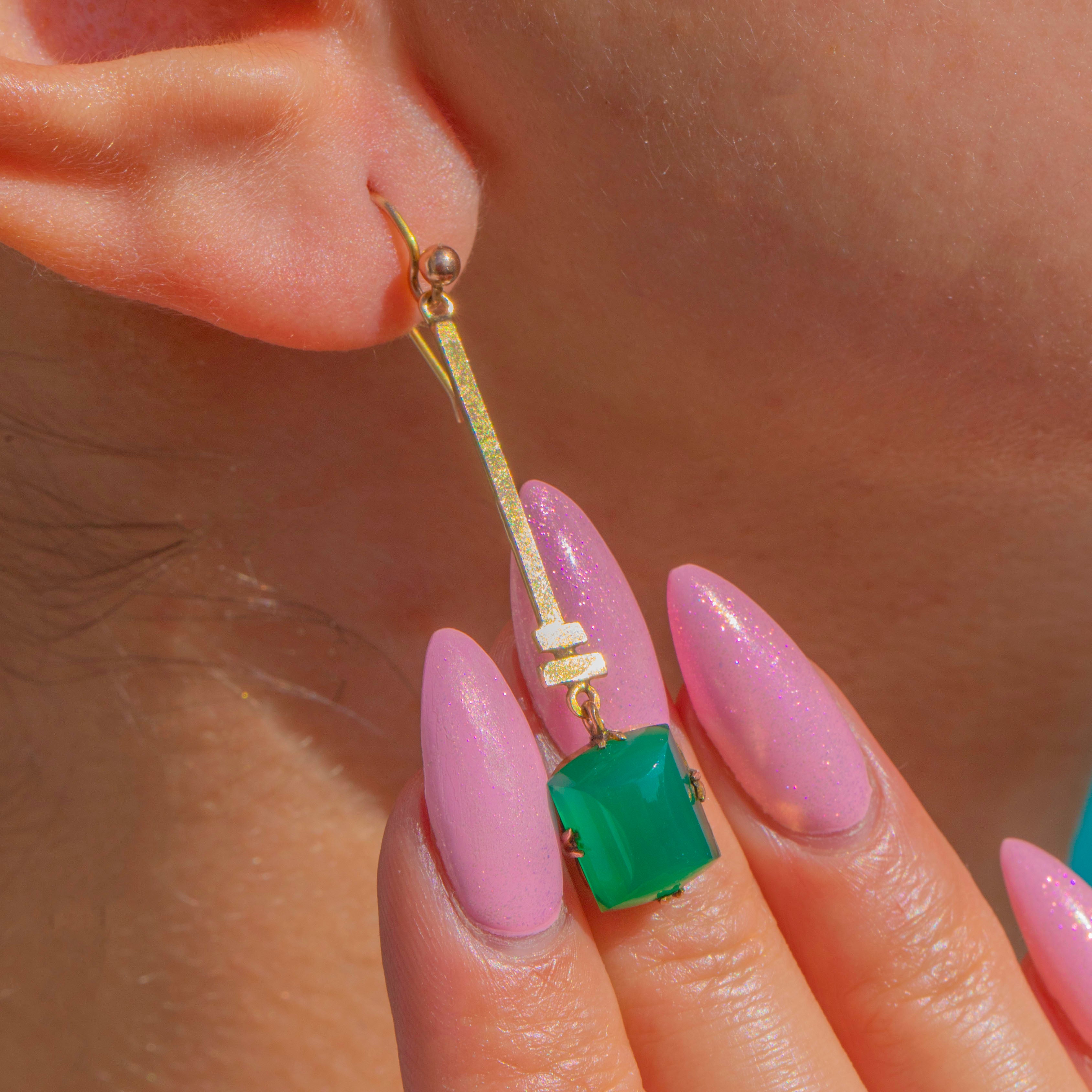 Sleek and sculptural, these Art Deco 9ct Gold drop earrings distil the era’s love of clean lines and vivid colour. A slender, textured bar leads the eye to a lush green Chalcedony drop, the saturated hue glowing beautifully against warm Gold.