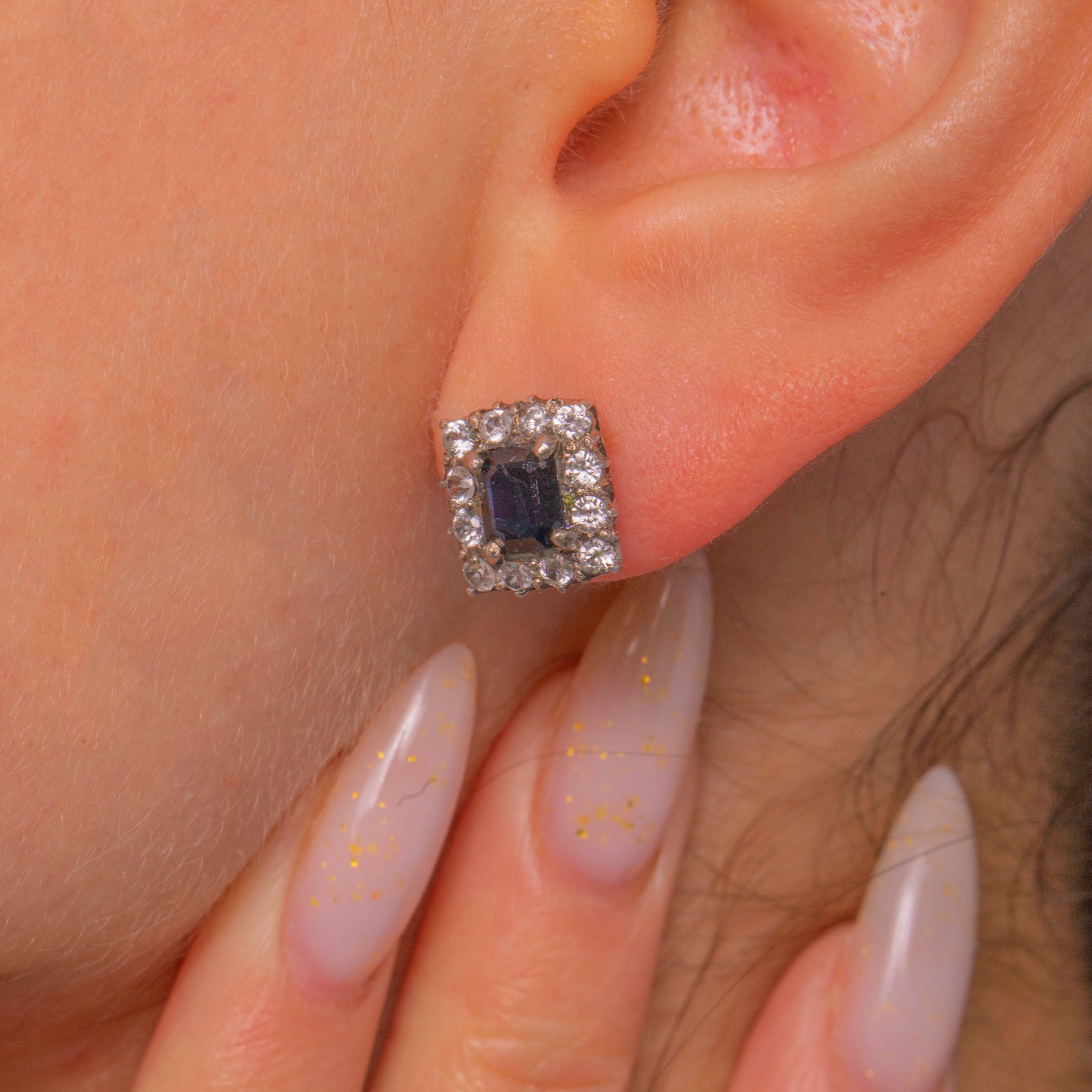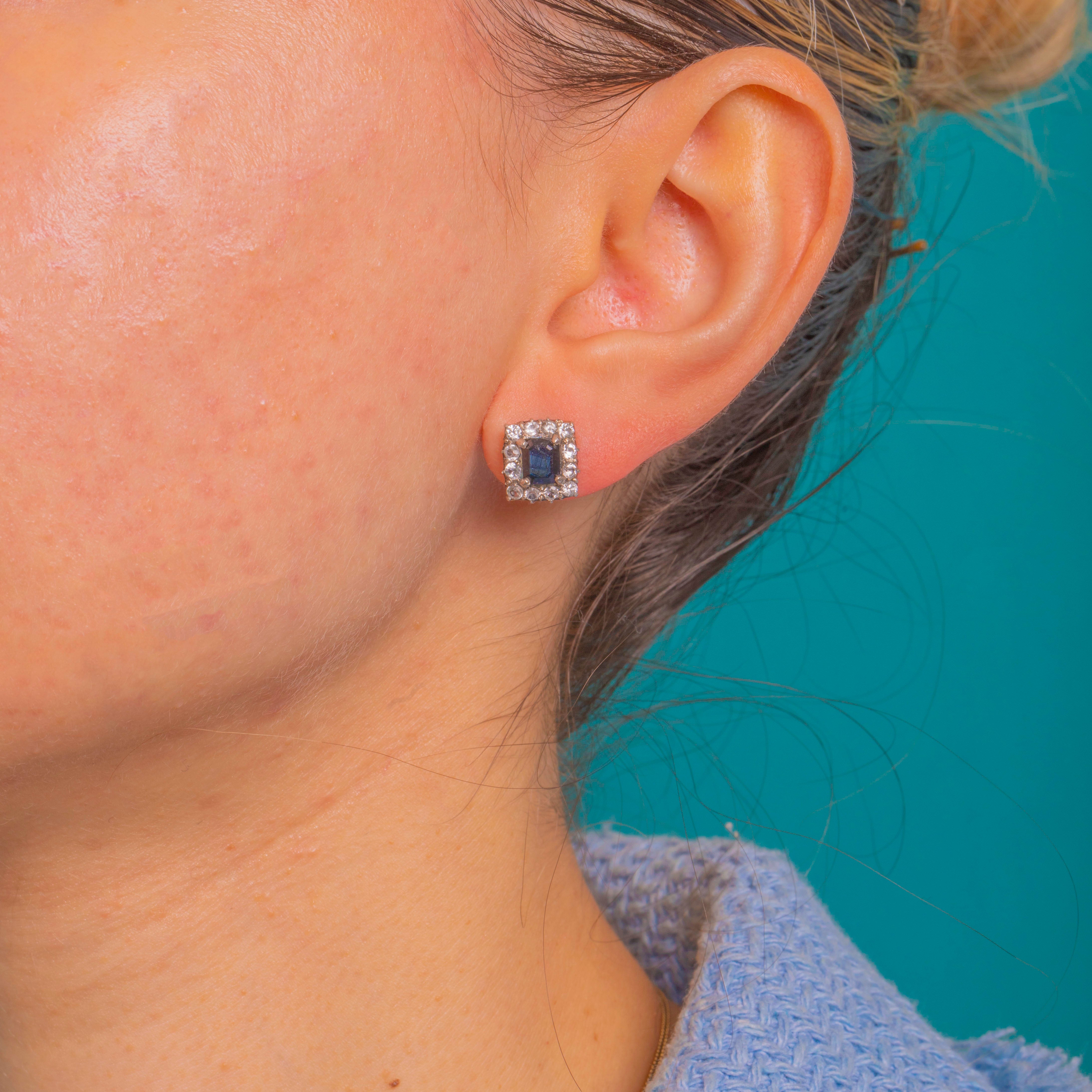 Elegant and architectural, these square halo stud earrings channel a chic Deco mood with crisp geometry and a luminous two‑tone palette. Each earring centres an emerald‑cut Natural Blue Sapphire in a white‑topped Sterling Silver setting, framed by a scintillating halo of White Sapphires for that perfect hit of sparkle against rich 9ct Gold. The step‑cut centres bring inky, midnight depth, beautifully contrasted by the bright, icy halo.