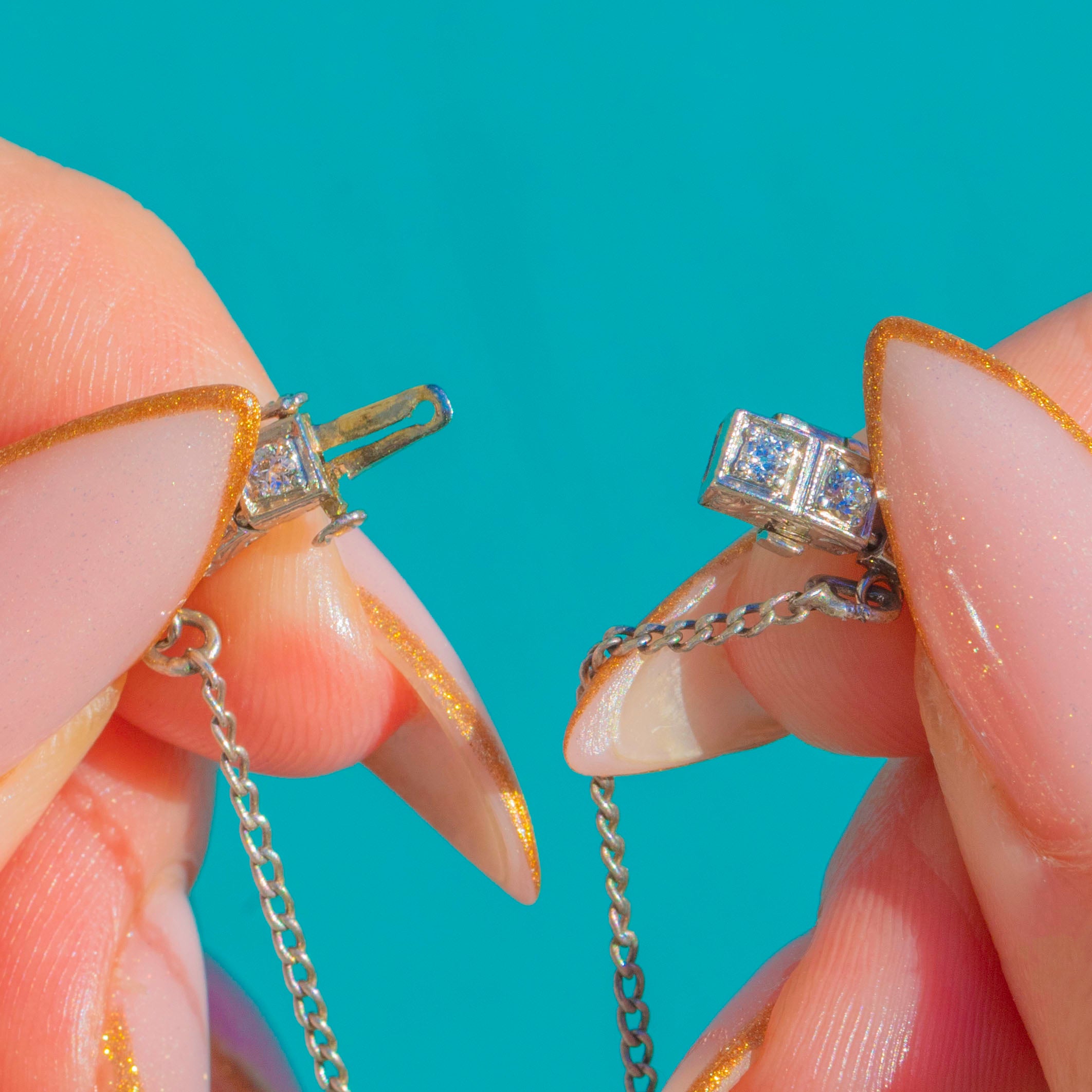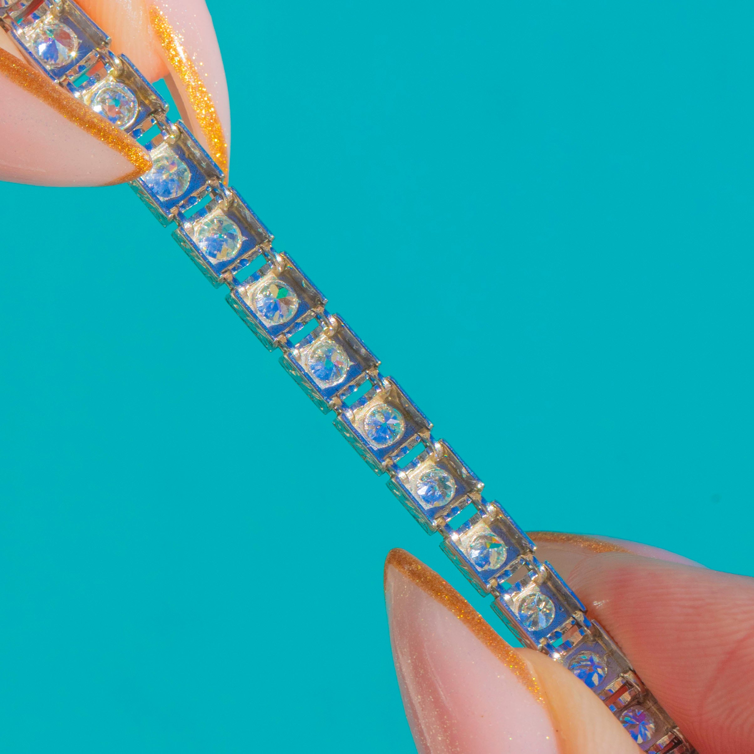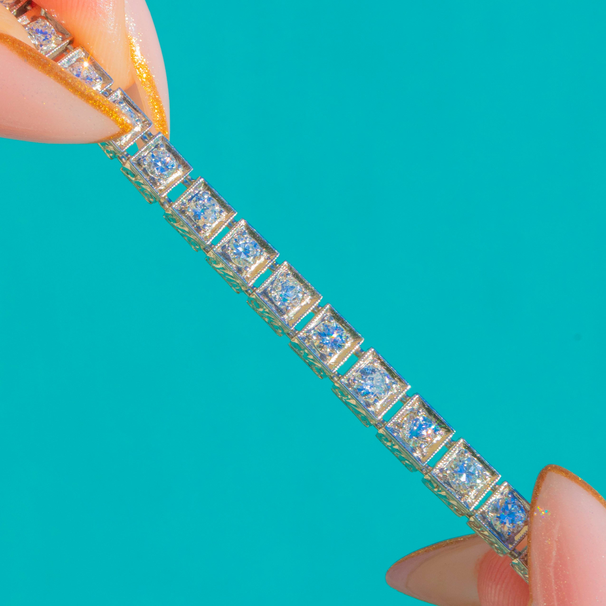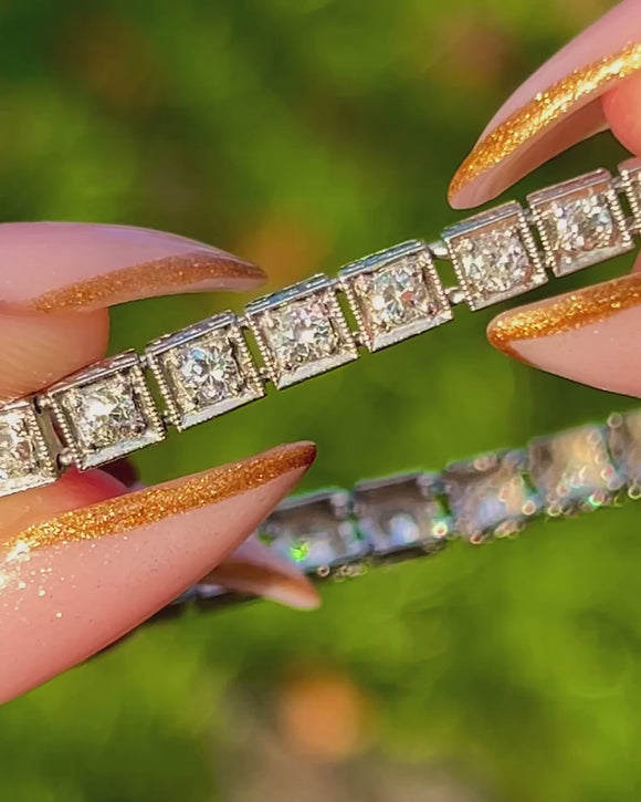 The Diamonds are bright & beautifully matched. Full of fire, giving the bracelet that iconic Deco sparkle from every angle. At 7 & 2/4" long, it drapes elegantly across the wrist with timeless sophistication. (Can be shortened if needed!)