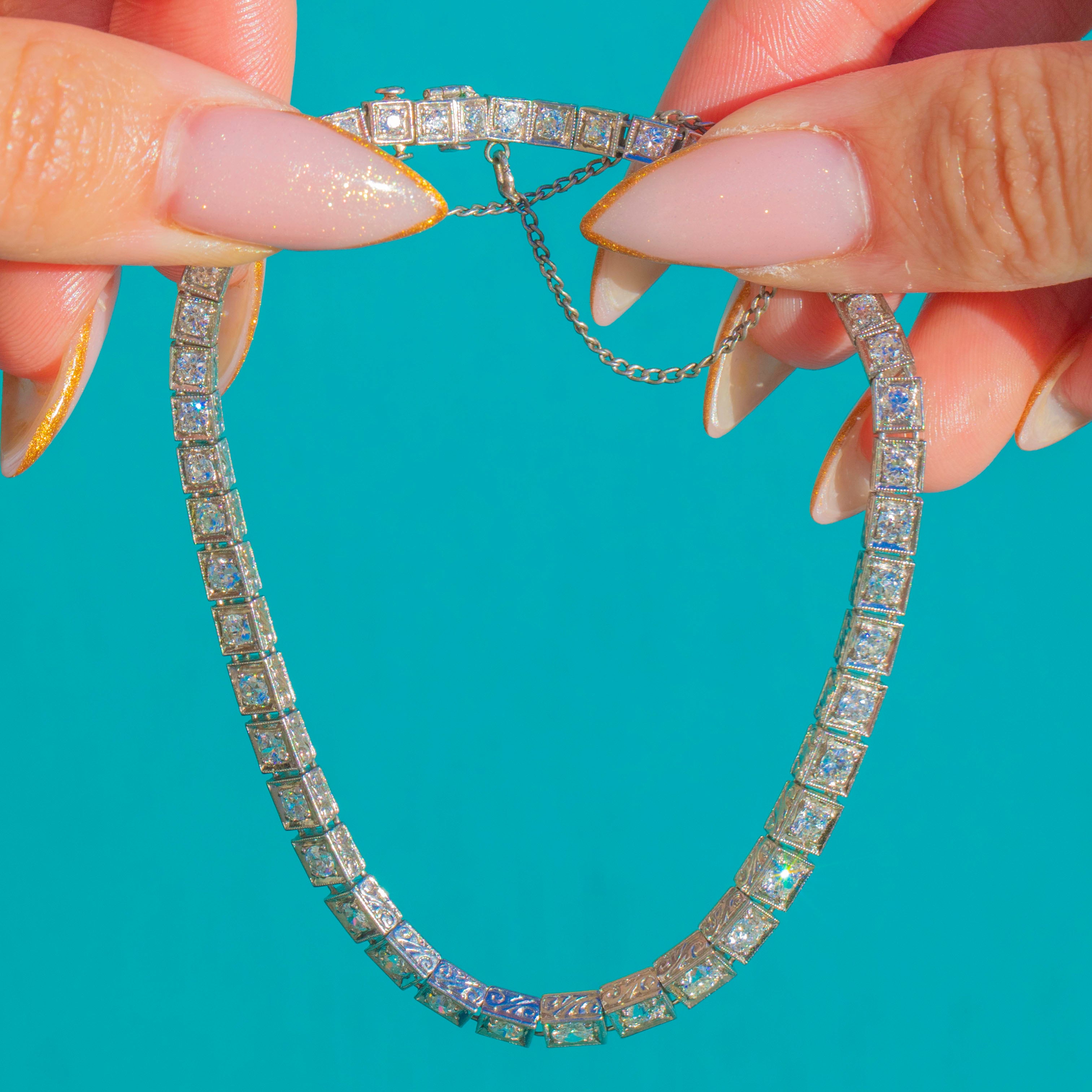 EXCELLENT: The Old European Cut Diamonds are bright and lively with no chips or noticeable abrasions. The Platinum links are crisp and well-articulated with minimal antique wear. The clasp, safety clasp and safety chain are all secure and functioning perfectly. A pristine Deco bracelet.