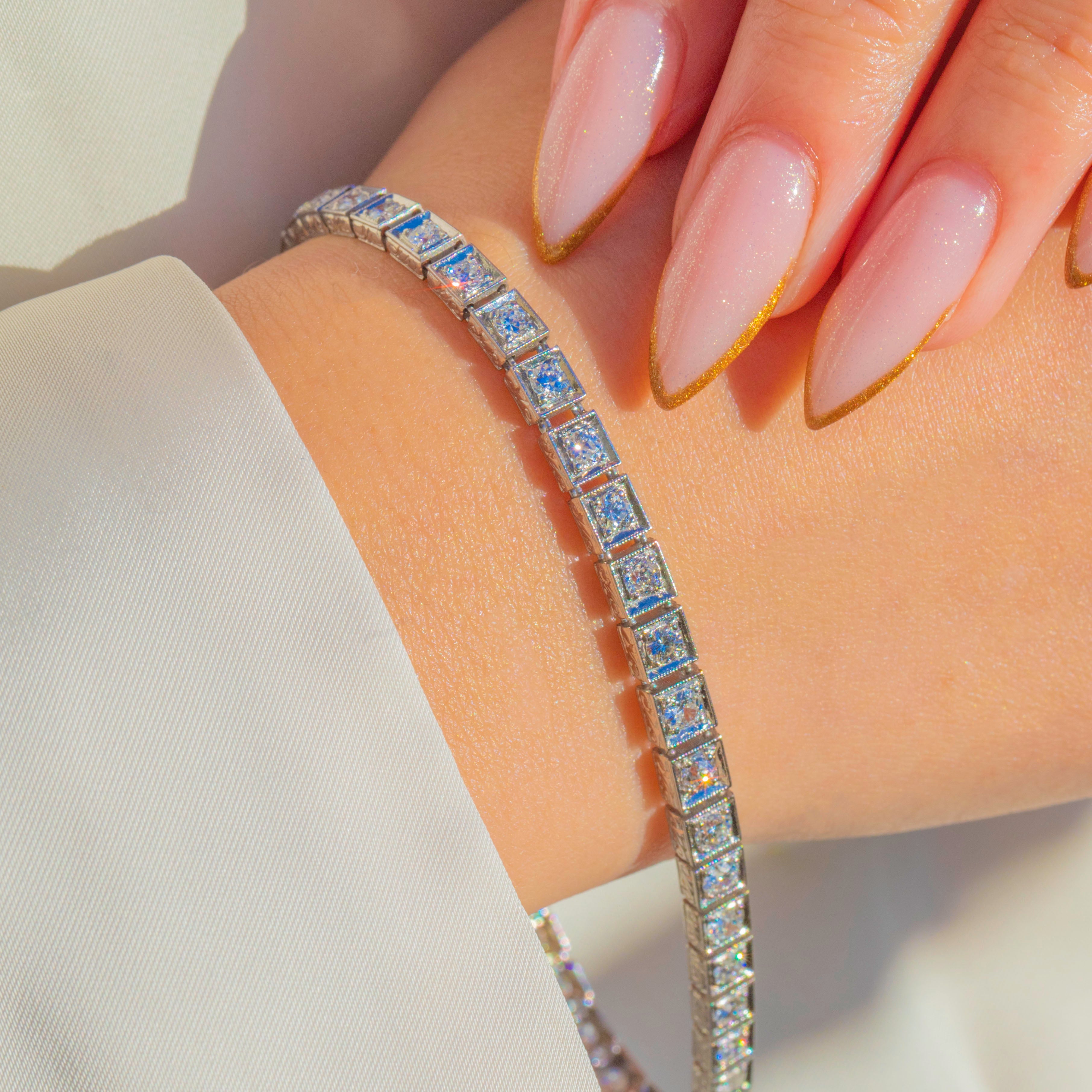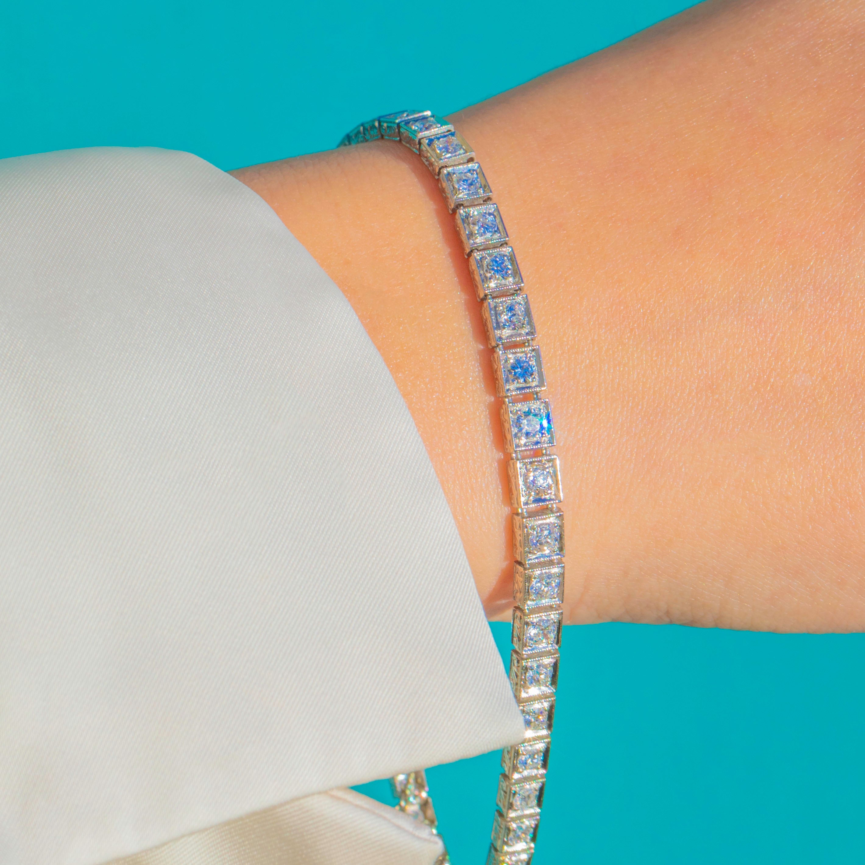 This spectacular Art Deco tennis bracelet showcases a glittering line of Old European Cut Diamonds, each one set in crisp millegrain-edged solid Platinum.