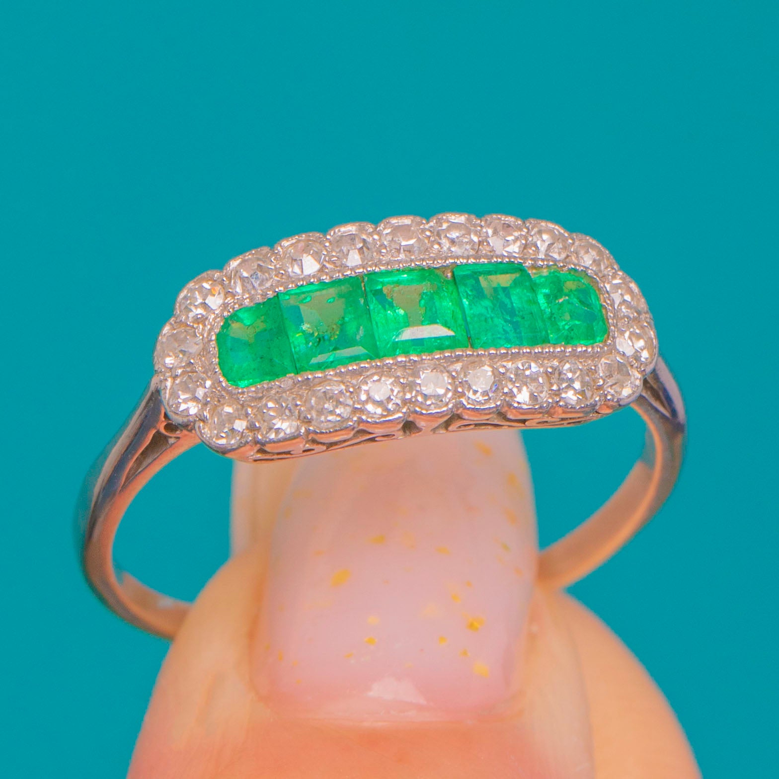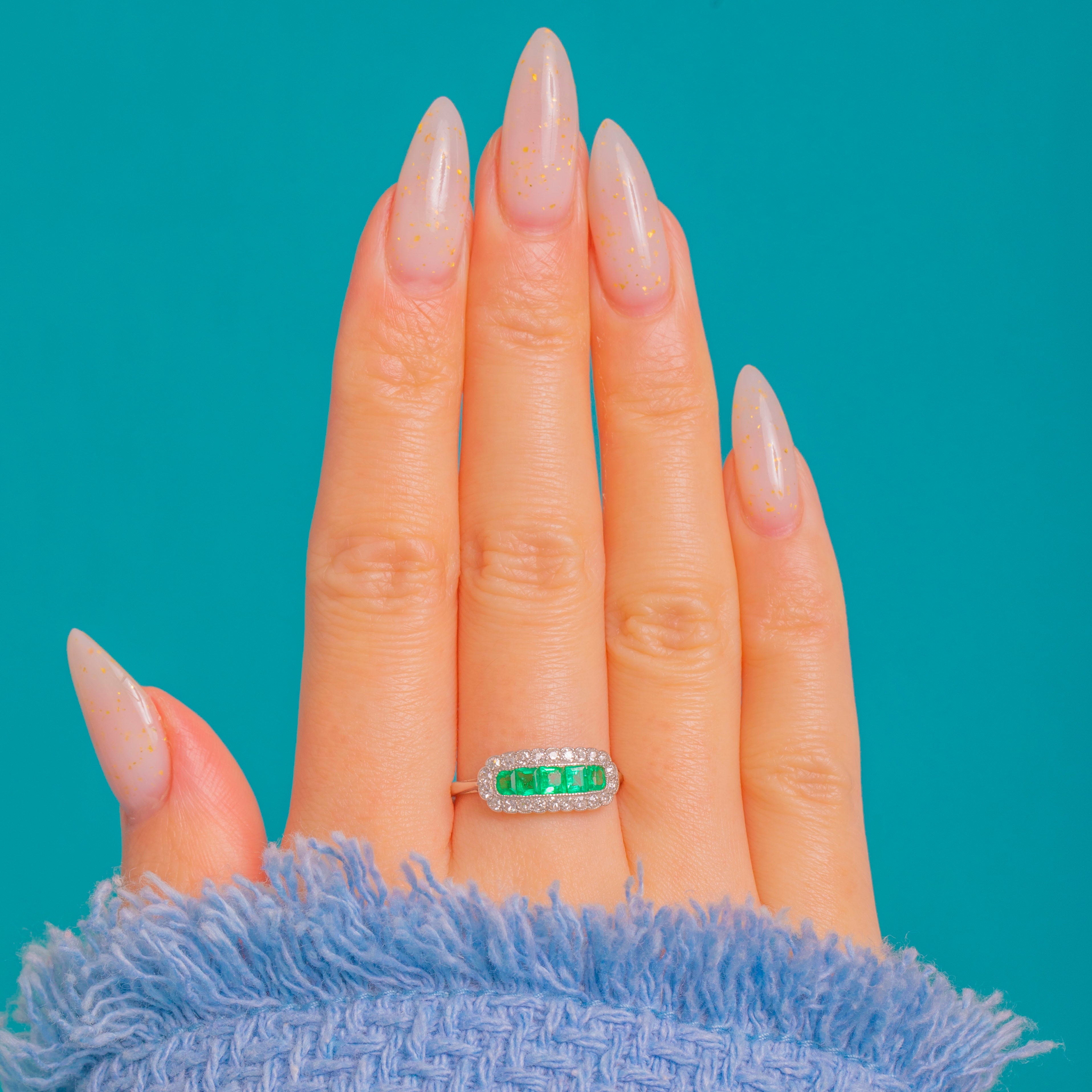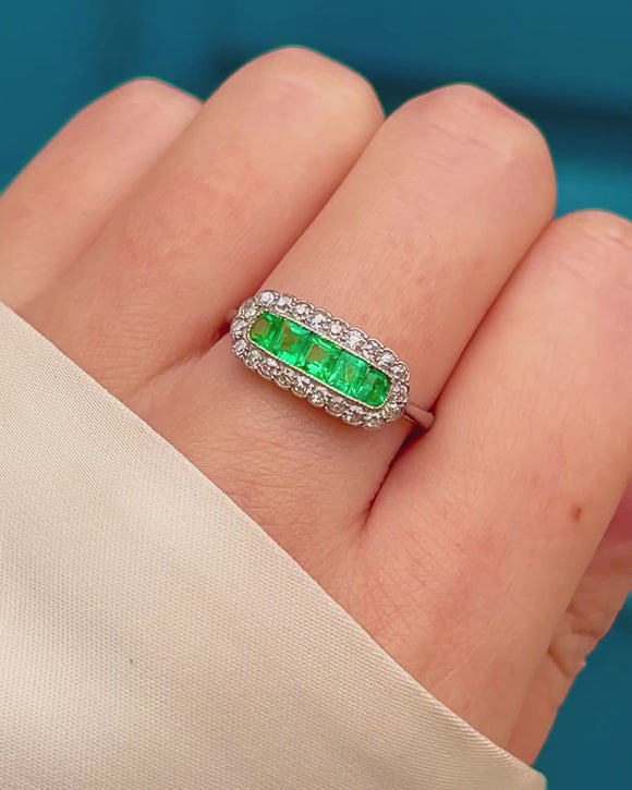Sleek, sculptural and undeniably Deco, this Platinum plaque ring centres a luminous row of bright green square Emeralds, framed by a halo of sparkling round Diamonds edged in fine milgrain. The elongated, rounded-rectangle silhouette gives elegant finger coverage, while the bead-set border and channel-set centre create a refined play of geometry and light.