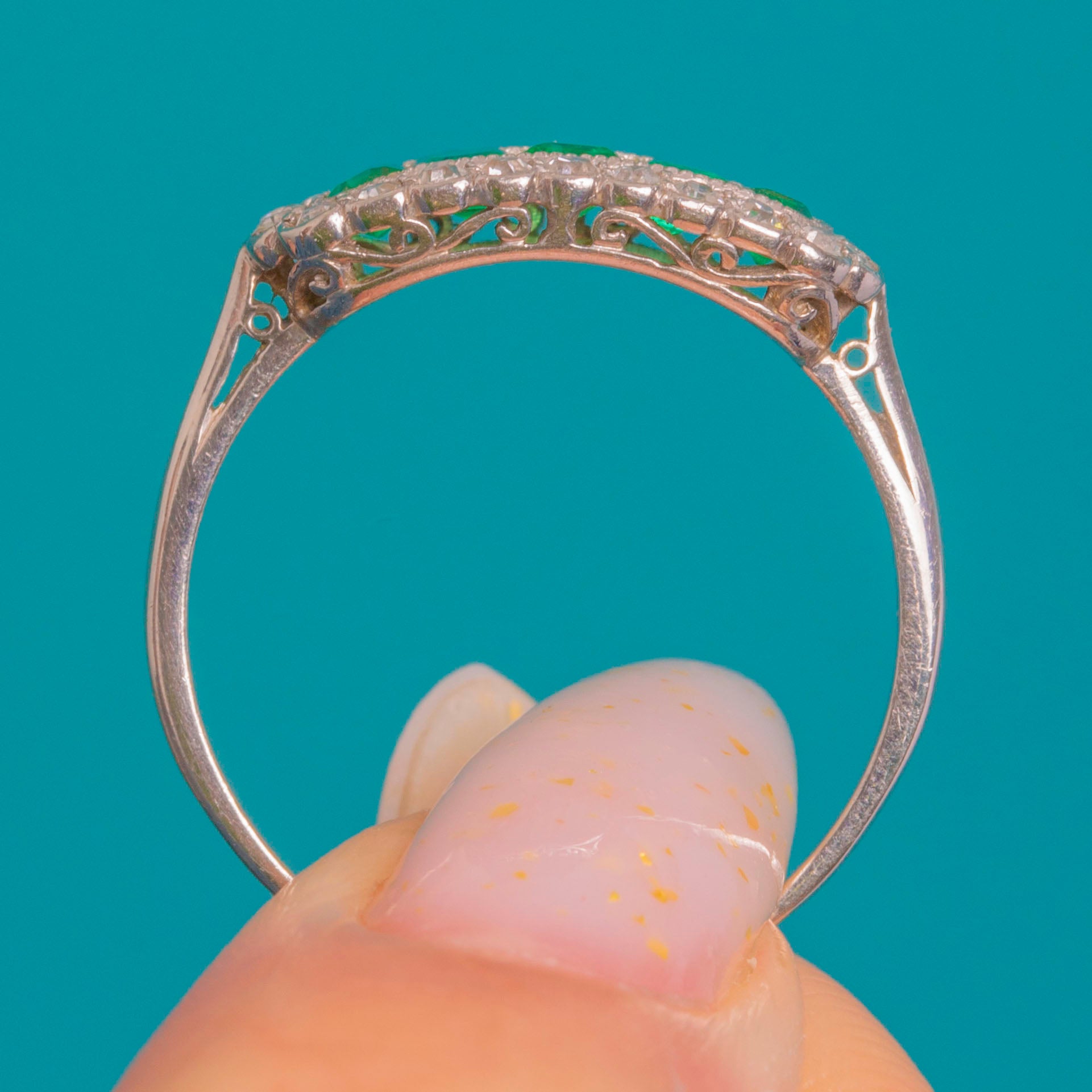 A pierced scrollwork gallery adds delicacy to the low–medium profile, allowing light to dance through the stones. A beautiful example of 1920s design, it marries crisp lines with artisanal detail for a look that’s both glamorous and timeless.