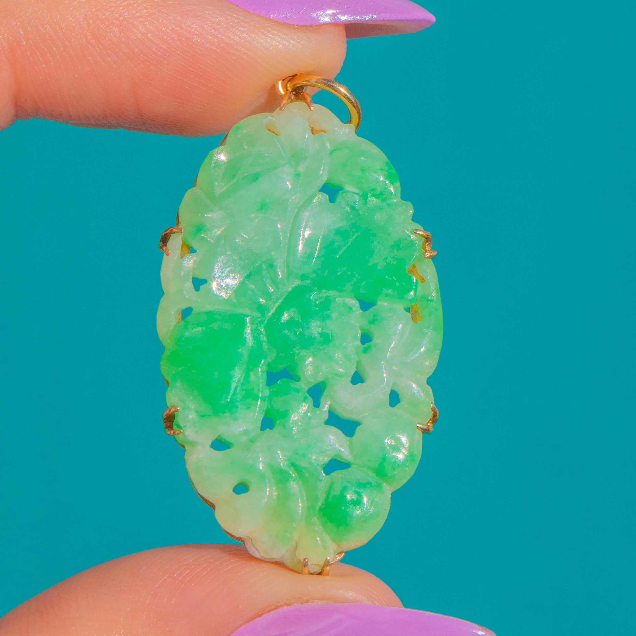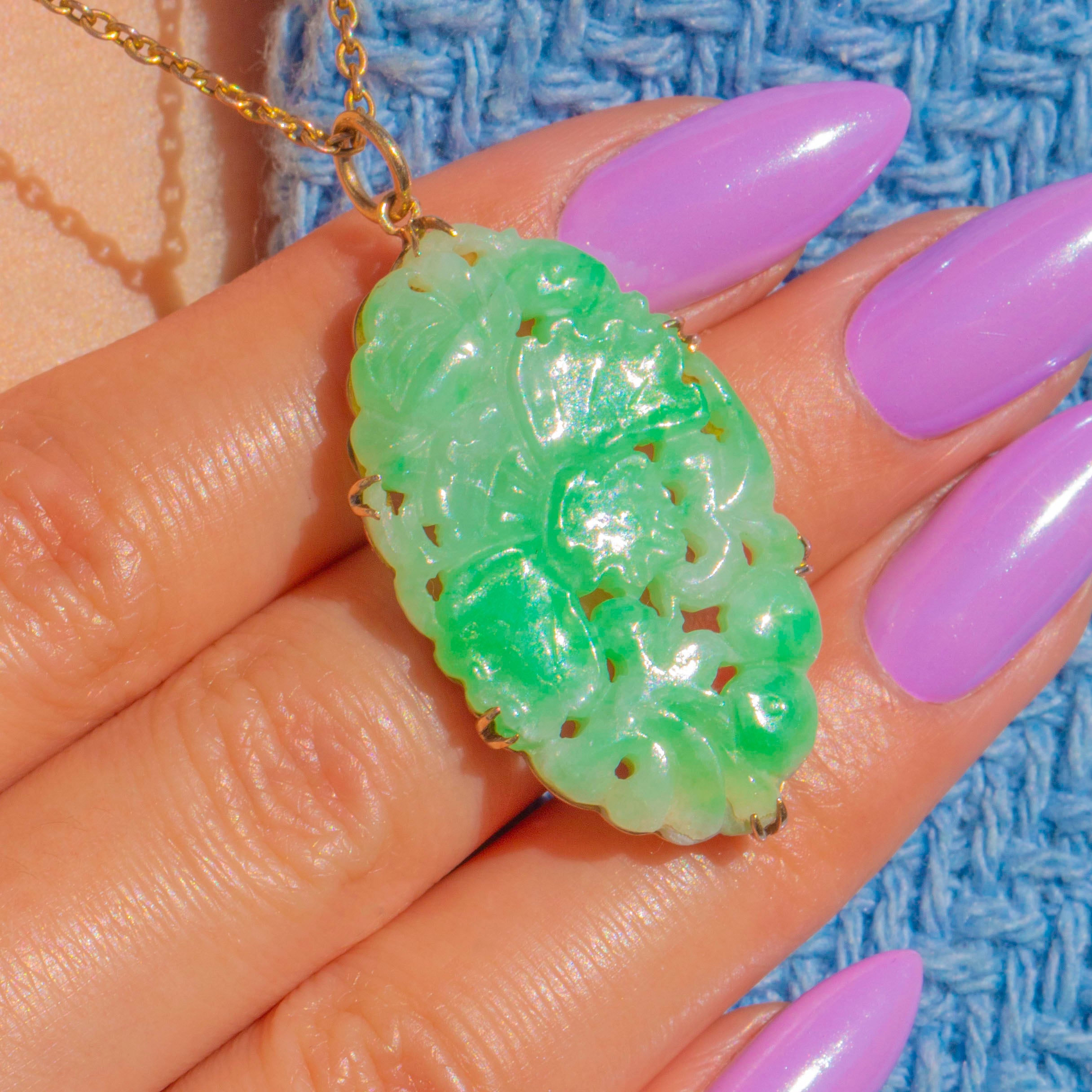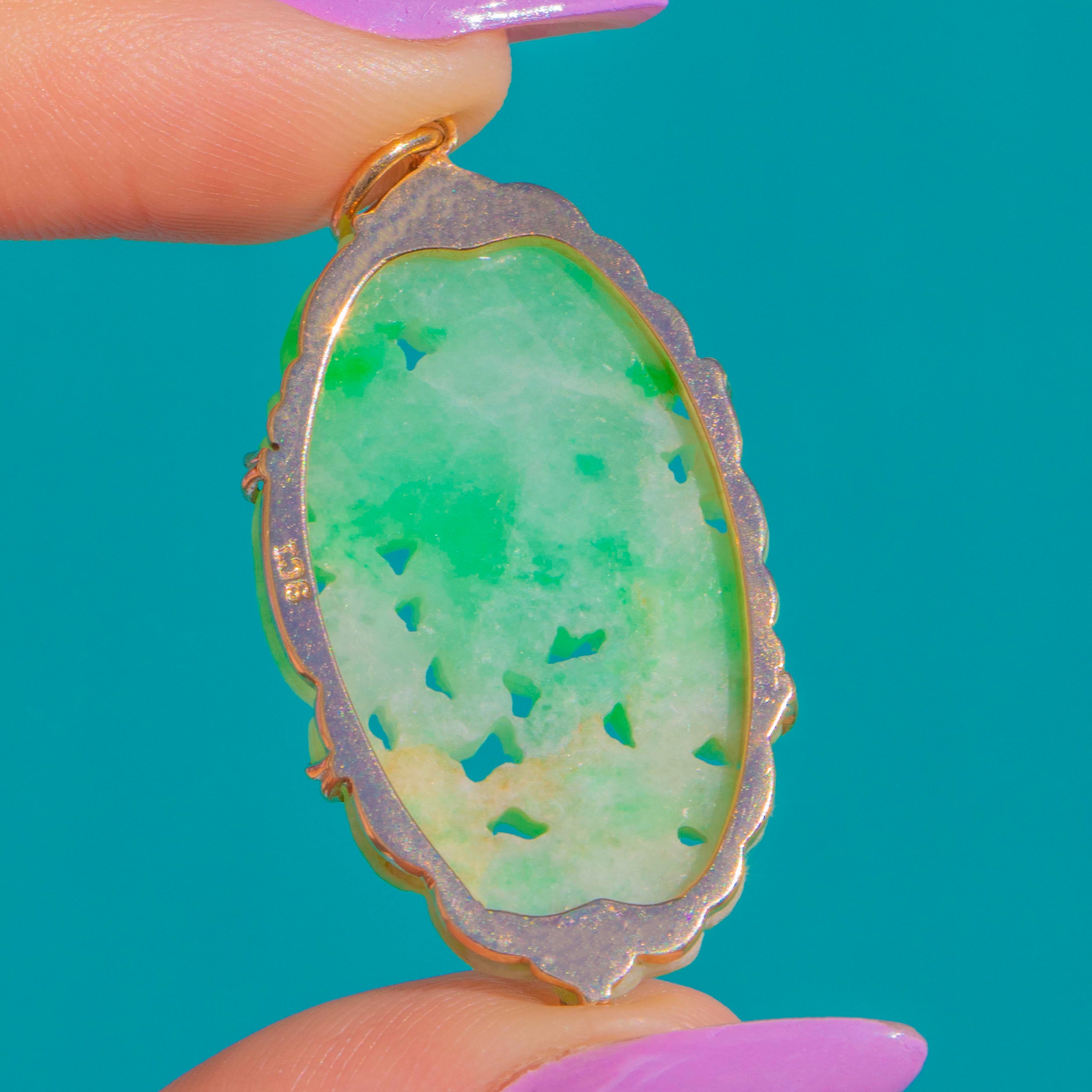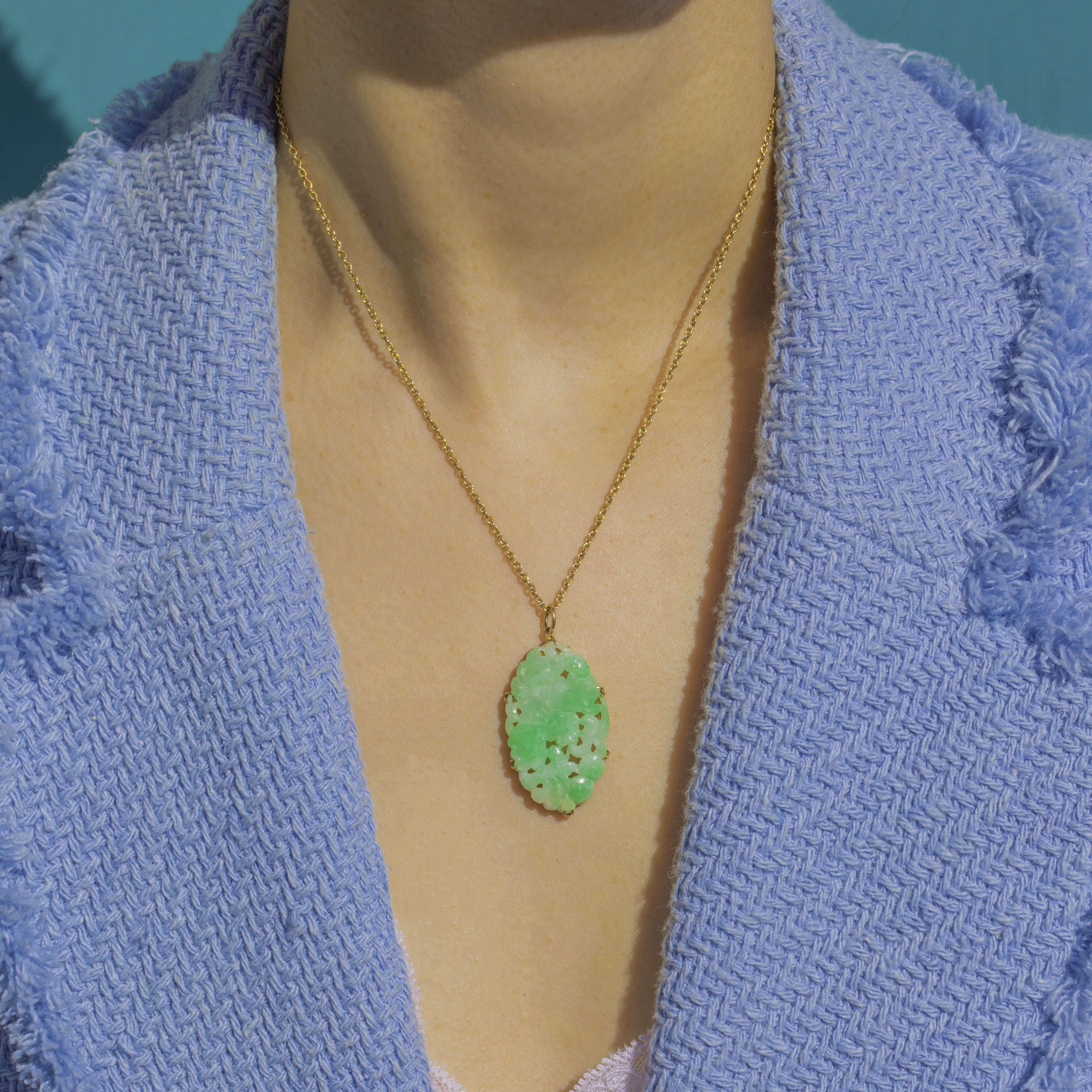 A beautiful Art Deco carved Jade pendant in warm 9ct Gold. The oval Jade plaque is intricately carved with floral and foliate motifs and pierced to create airy openwork, its surface alive with softly mottled celadon to apple-green hues. Framed by a scalloped, claw-set mount with a soldered jump-ring, it’s a timeless, elegant jewel with serene colour and exquisite detail.