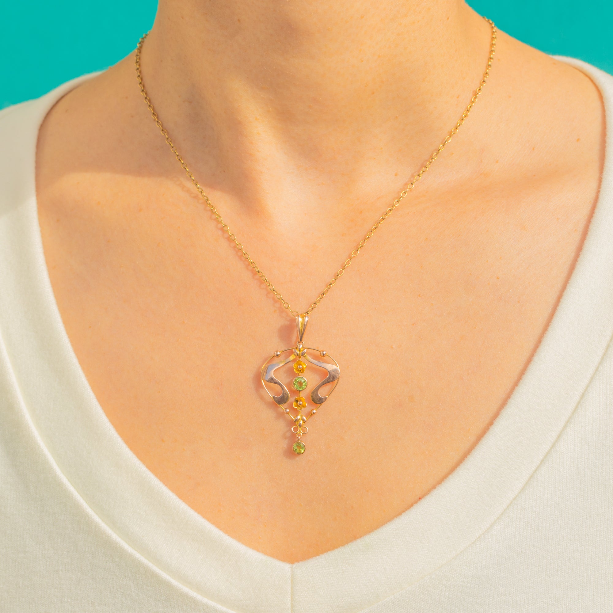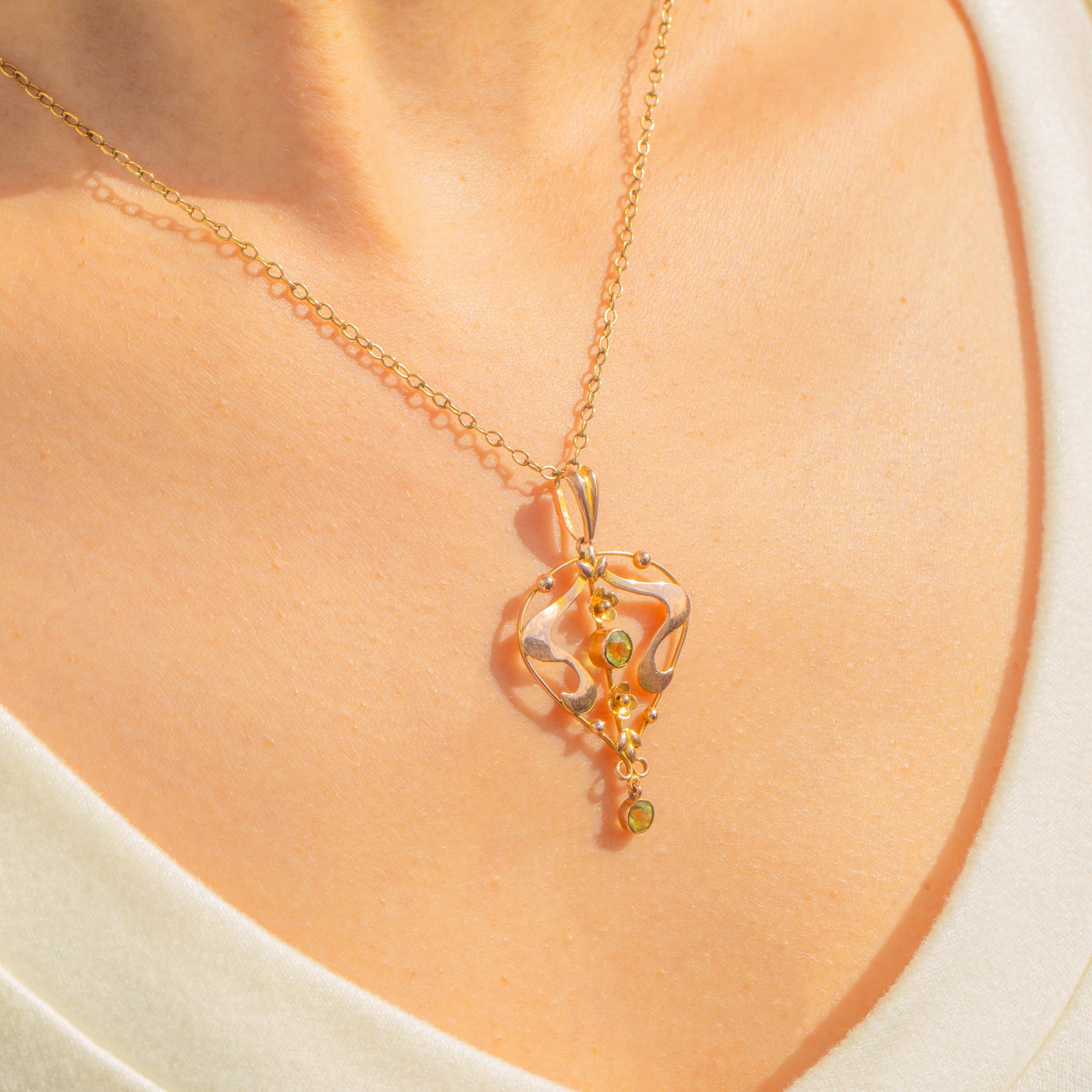 Evoking the fluid grace of the Art Nouveau era, this openwork pendant in 9ct Gold unfurls with elegant whiplash curves, delicate foliate detailing and a softly articulated drop. Two bezel-set round Peridots glow a fresh, light green—one at the centre and one suspended below—bringing a lively sparkle to the piece.