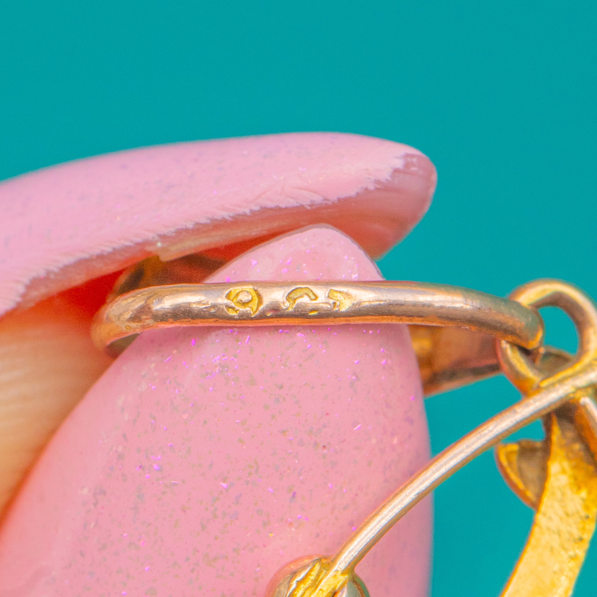 Polished panels and pierced scrolls play with light and shadow, while tiny floral granules add a refined, handcrafted touch. Stamped 9ct, this poetic jewel captures the era’s love of nature and movement with timeless ease.