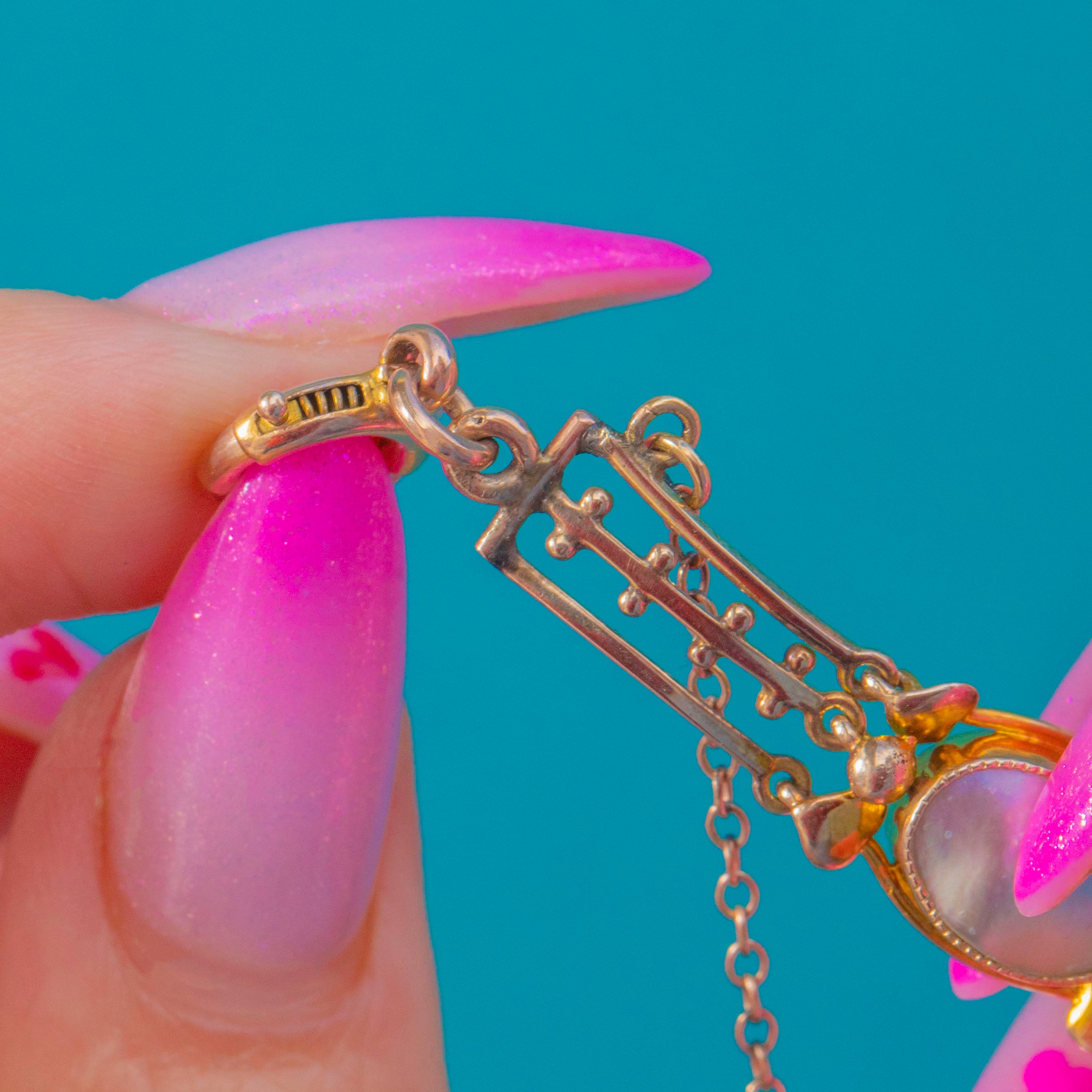 She's gracefully Art Nouveau.. articulated 9ct Gold bracelet pairs vivid green Peridot ovals with softly iridescent organic Mother-of-Pearl disk. Each stone rests in a decorative millegrain bezel with tiny bead accents and foliate terminals, the stations linked by slender parallel bars for beautiful movement and drape. The alternating colour play is romantic and refined, capturing the era’s fluid lines and naturalistic charm.