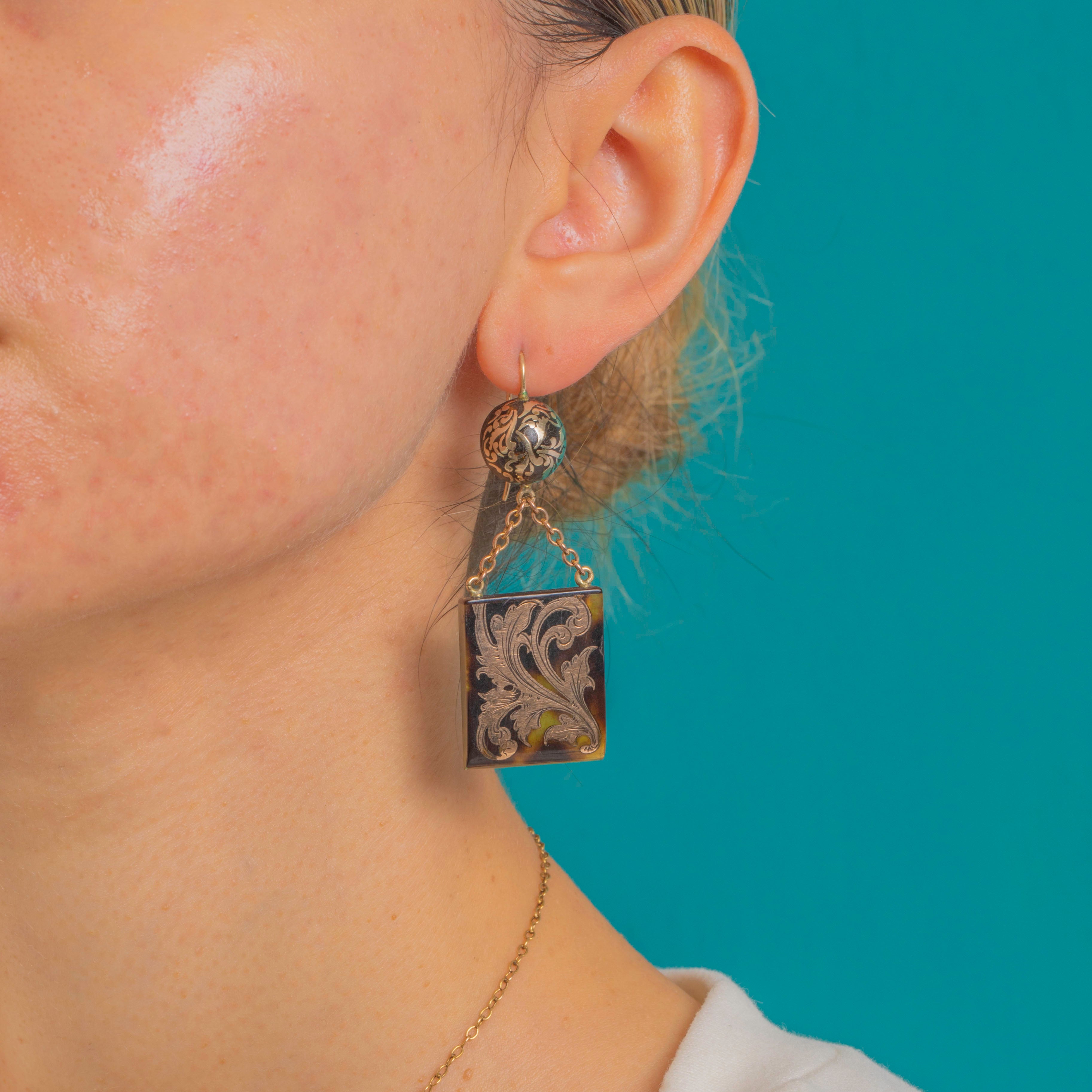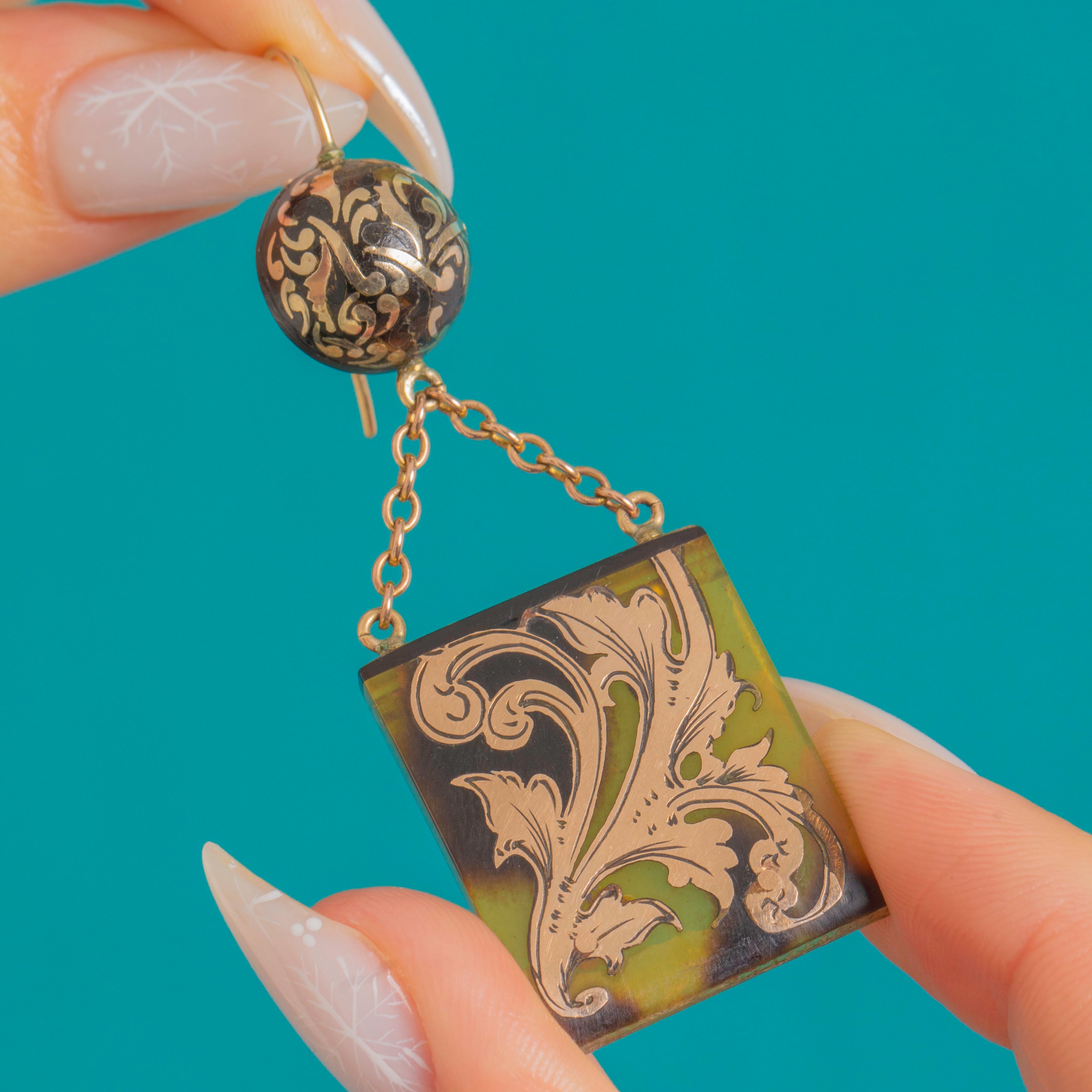 A striking pair of Art Nouveau Piqué drop earrings, alive with sinuous foliate scrolls in shimmering Gold set against a deep, glossy ground. Each earring is crowned by a decorated bead and finishes in an ornate rectangular panel, articulated by short twin chains for beautiful movement and drama on the ear.