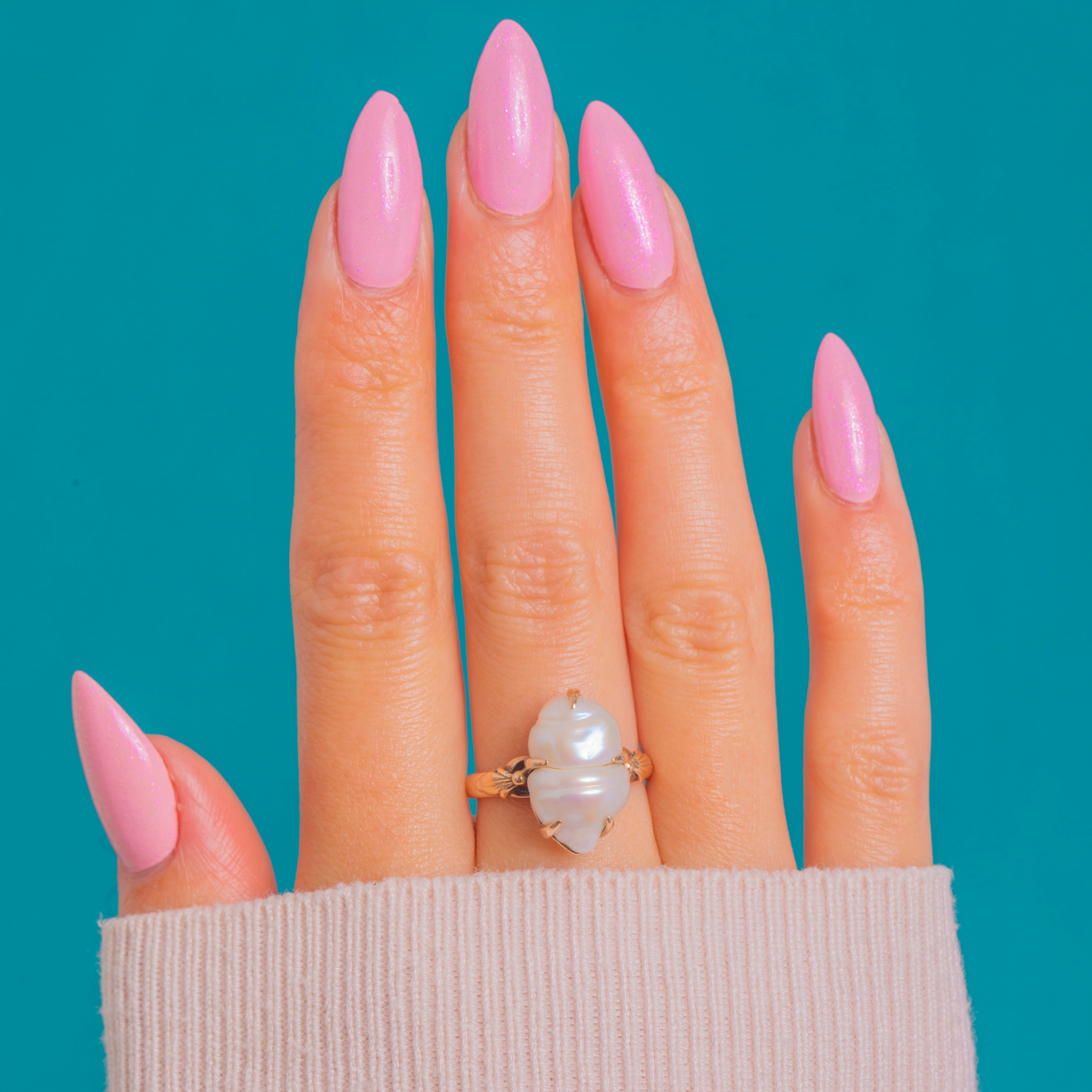 VERY GOOD: The Baroque Pearls display incredible lustre with natural surface texture and no obvious chips or cracks. The 14ct Gold setting, prongs and shank show light surface wear consistent with age and are in very good order; there is a small amount of movement to the pearls, but they remain safe and secure. Evidence of a previous resizing to the shank, and the ring can be sized again if needed.