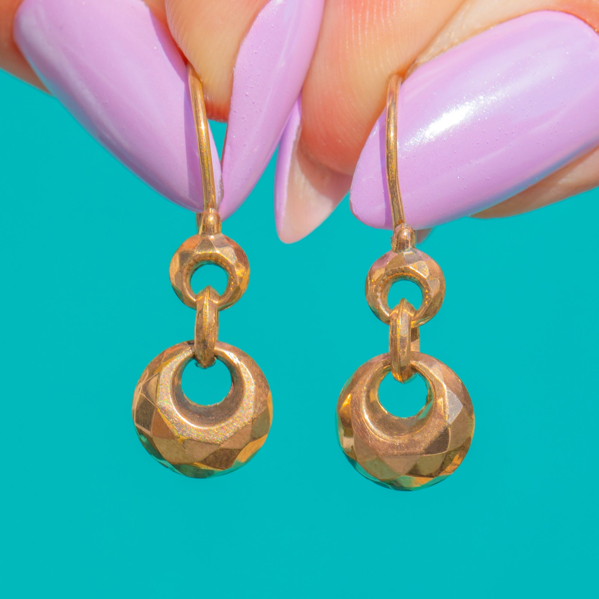 Dainty and deliciously refined, these Victorian 9ct Gold drop earrings marry minimalist geometry with antique charm. The slender French hooks lead to a petite faceted ring, finishing in a gleaming faceted rondelle that dances with every movement.