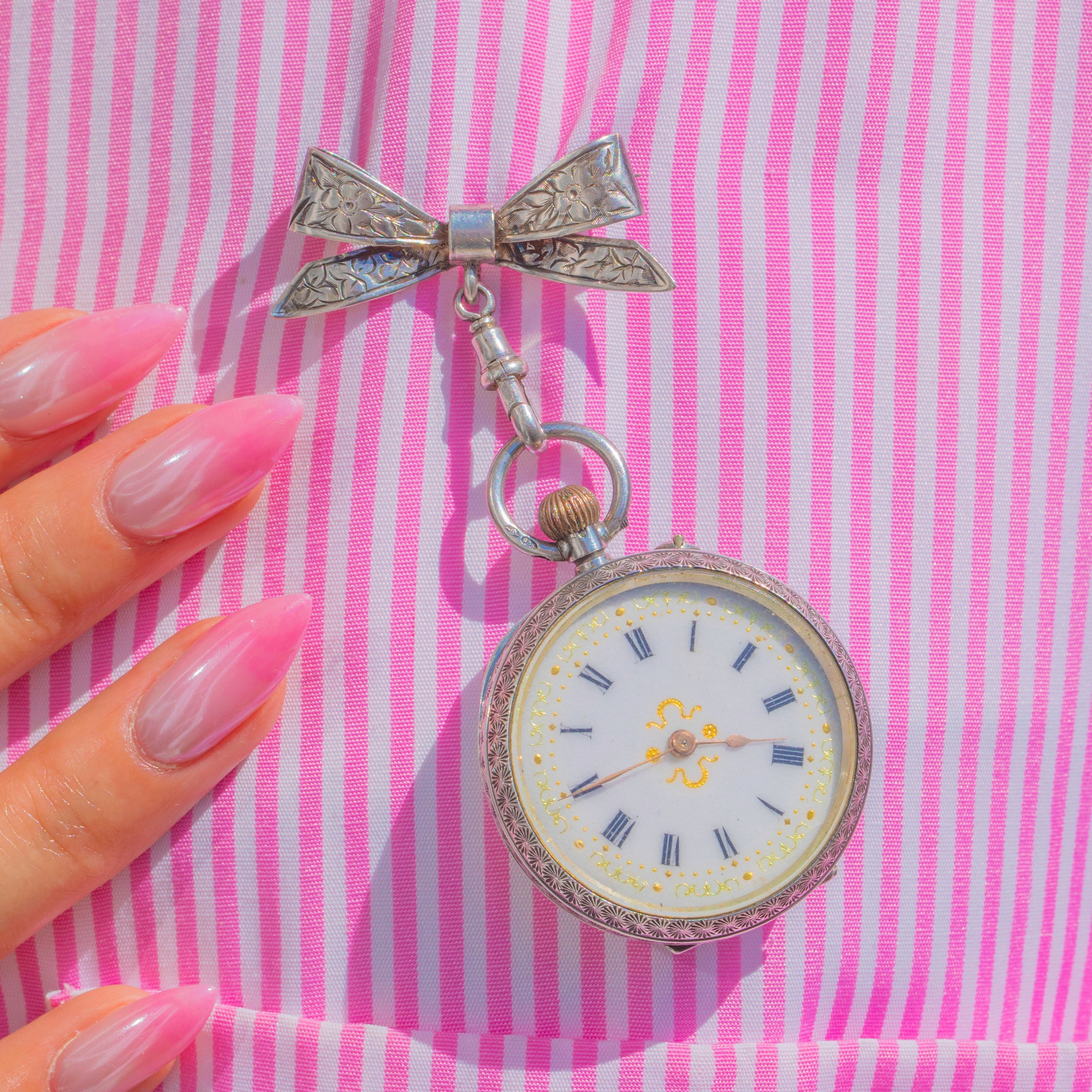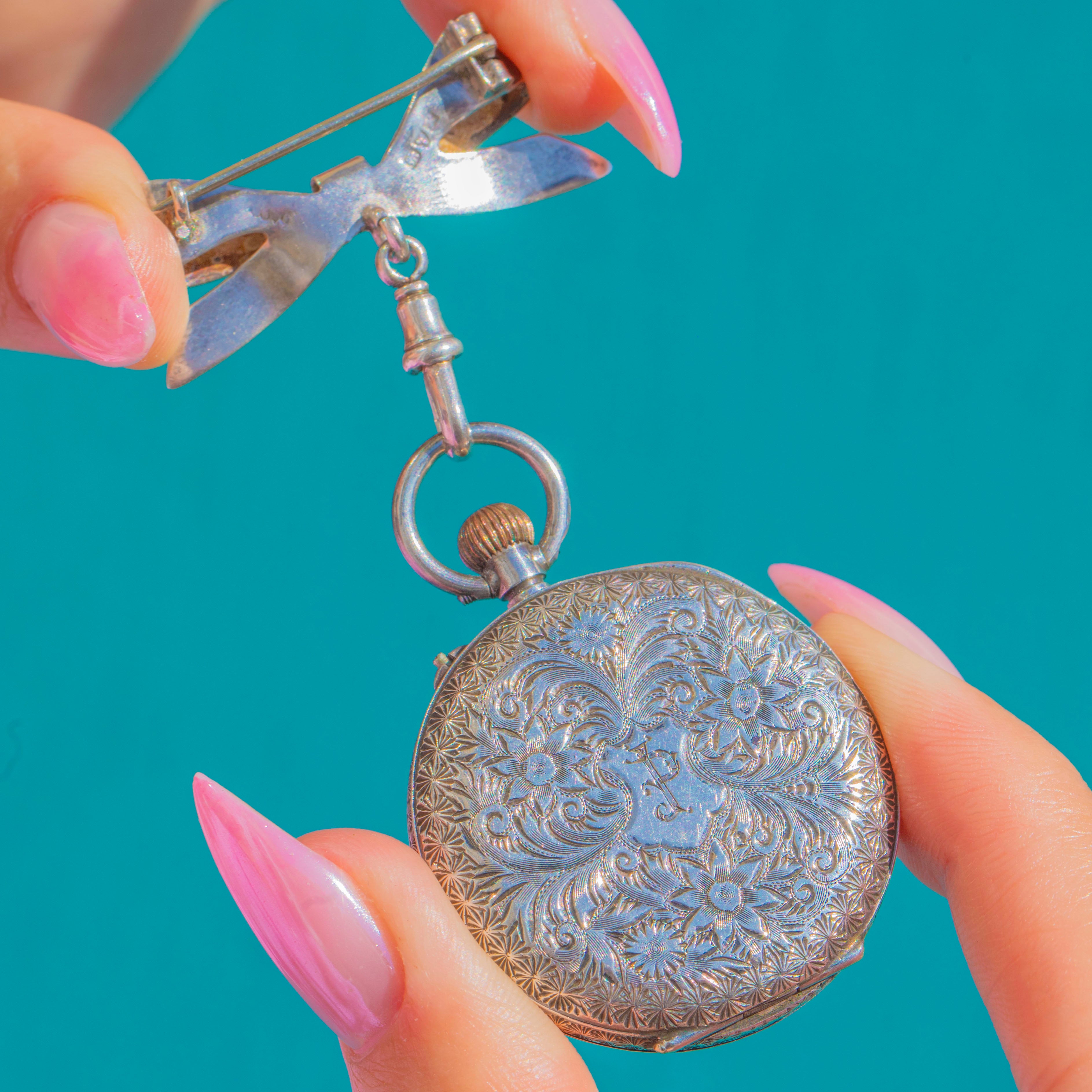 A romantic Edwardian treasure, this Sterling Silver bow brooch suspends a petite pendant watch in a graceful articulated drop. The bow is richly engraved with foliate detail, while the watch case is framed by an engine-turned border for a subtle guilloché-like shimmer. A white Enamel dial with black Roman numerals, delicate gilt scrollwork and elegant Gold hands completes the picture, with a warm gilt crown adding a final flourish.
