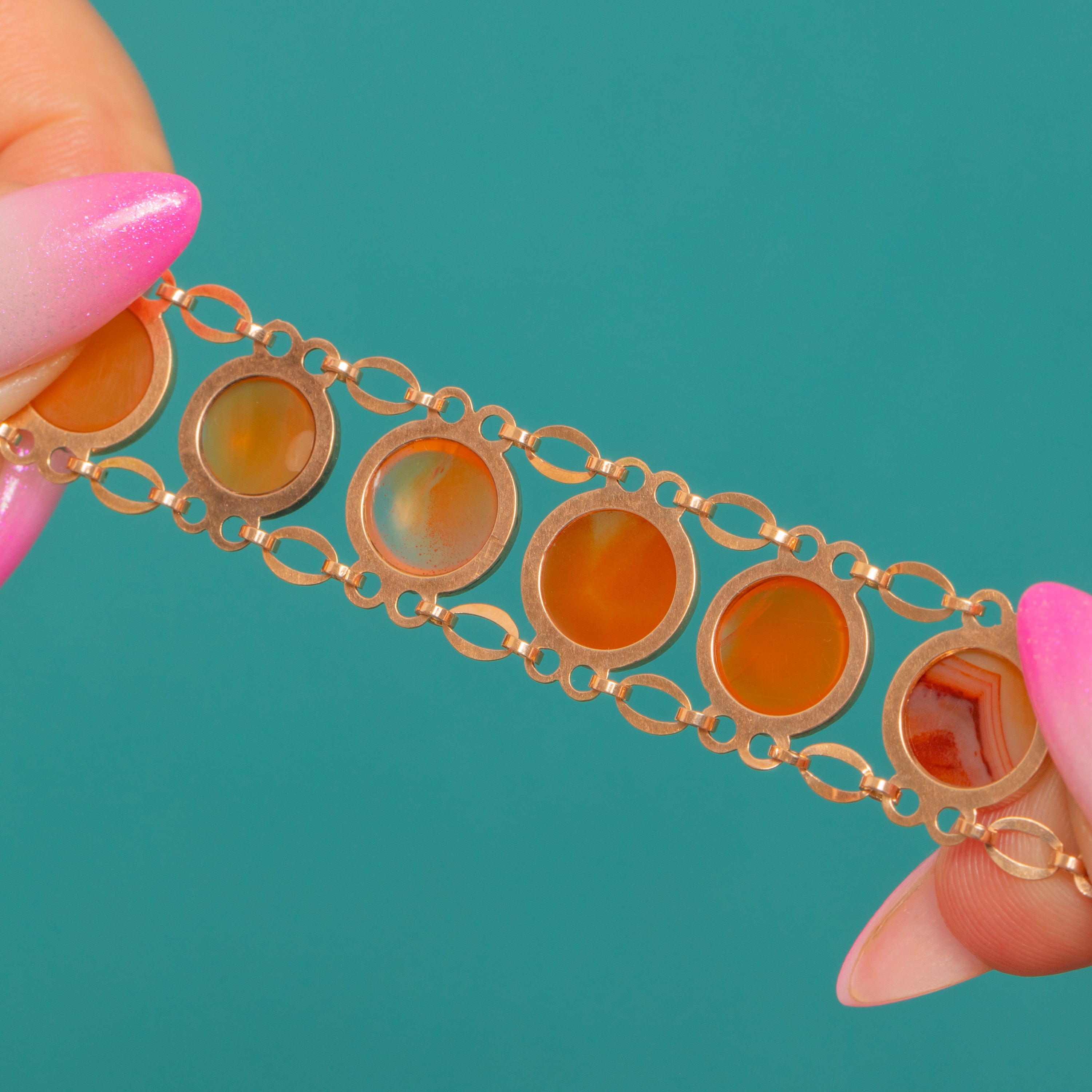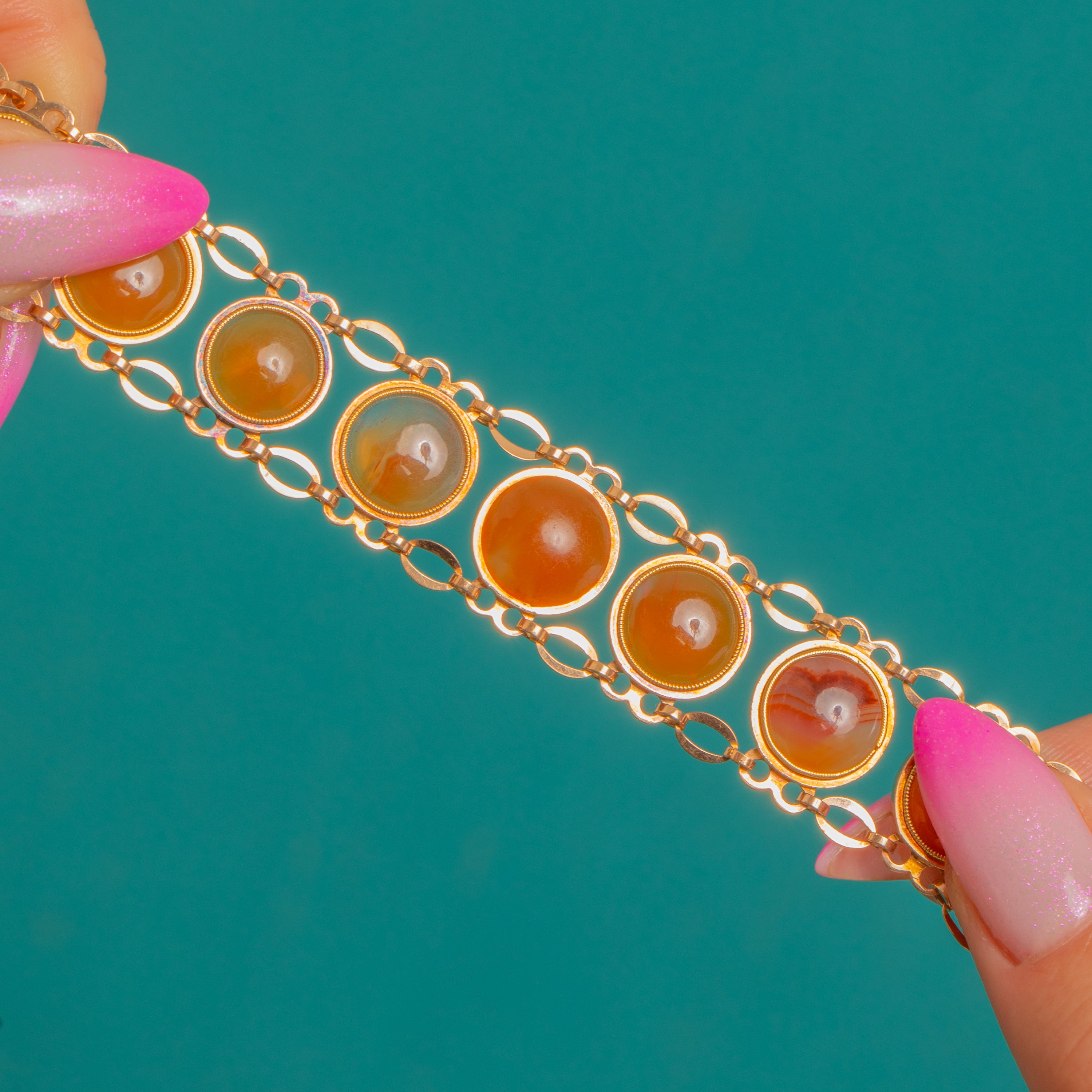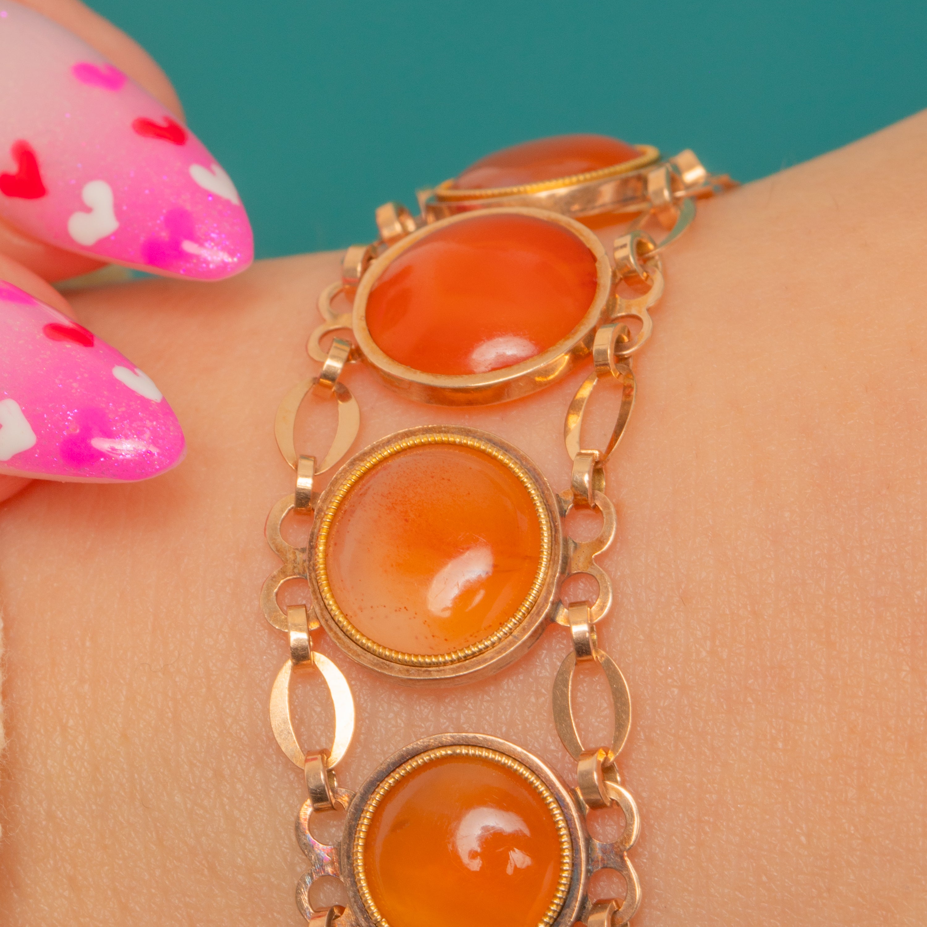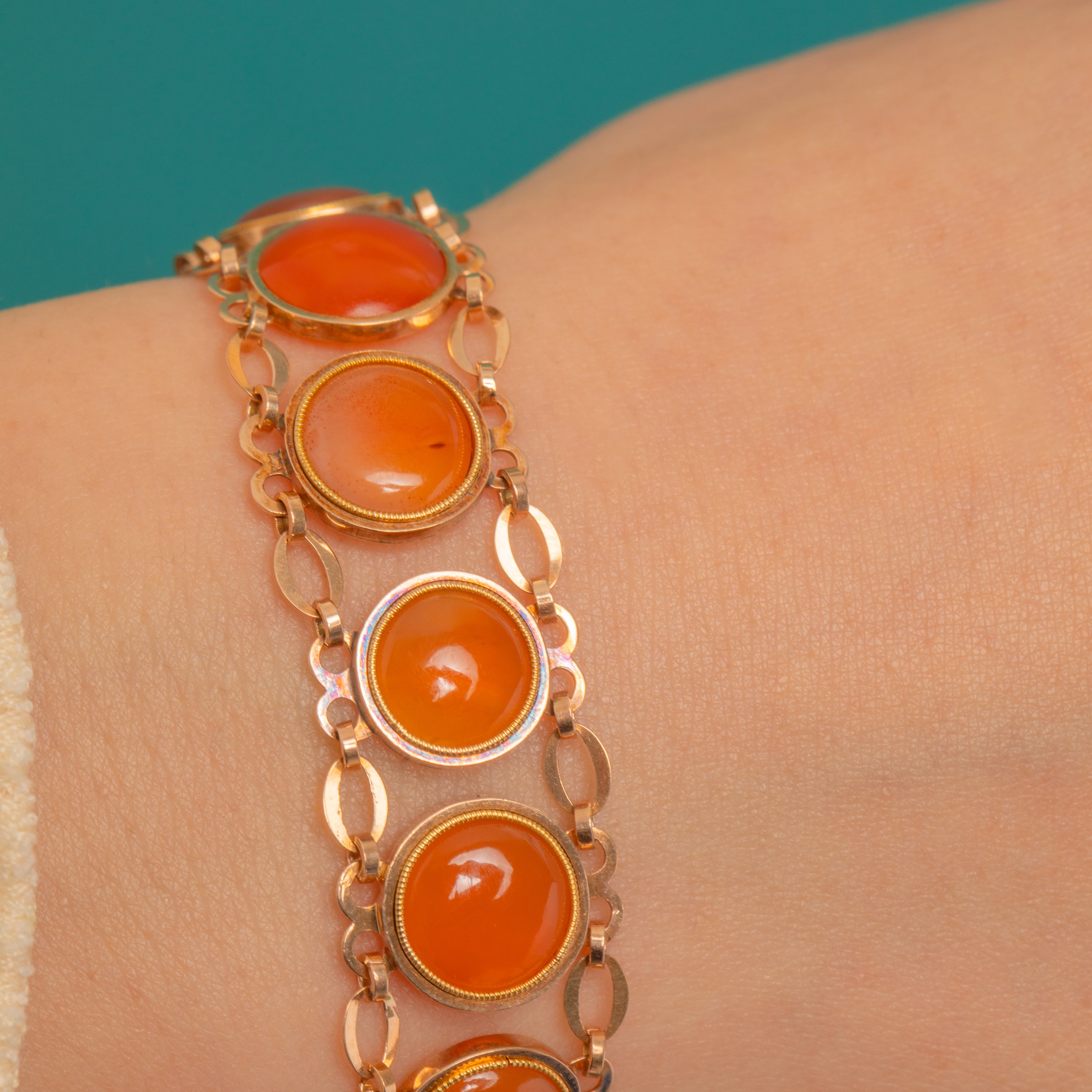 EXCELLENT: Carnelian cabochons are bright with only light, age-appropriate surface wear visible under magnification. The Gold settings and articulate links are crisp and well-preserved with minimal signs of wear. No evidence of repairs or alterations; the piece has been carefully maintained.