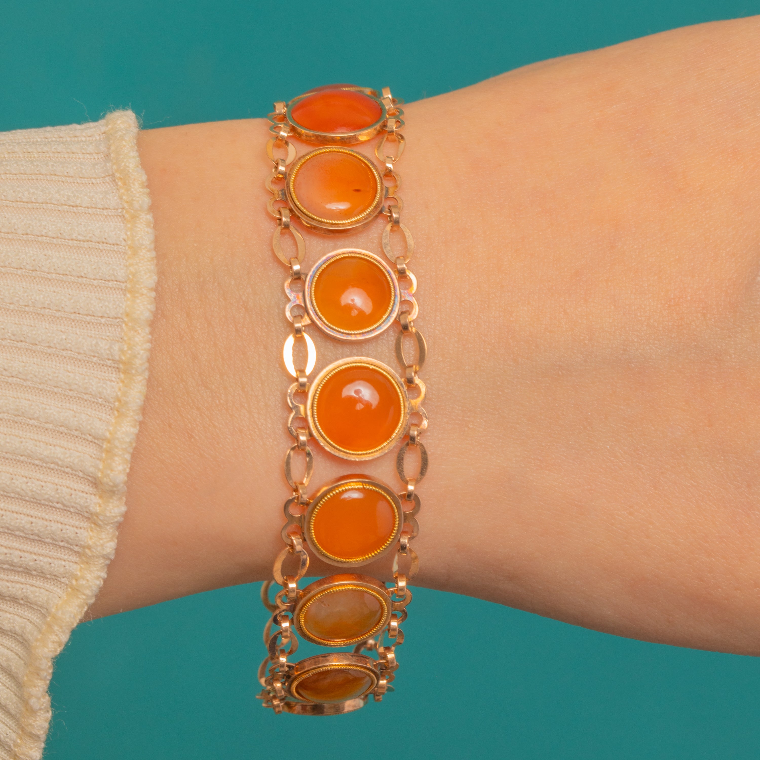 A glowing ribbon of Carnelian cabochons in sumptuous 15ct Gold, this early 19th-century Georgian bracelet is a classic study in warmth and rhythm. Each high-domed, honeyed-orange Carnelian is framed by finely beaded bezels and linked for a supple, articulated drape on the wrist.