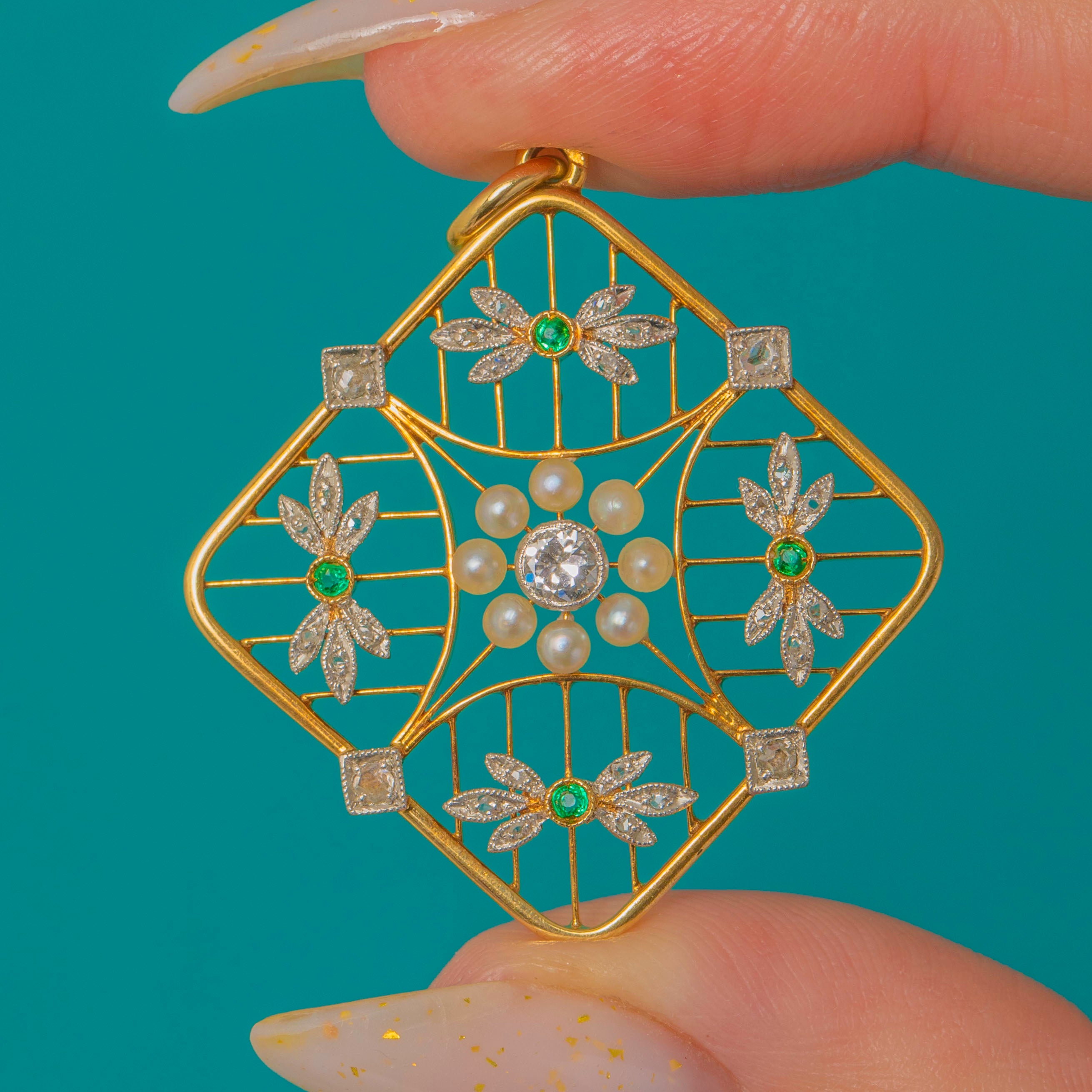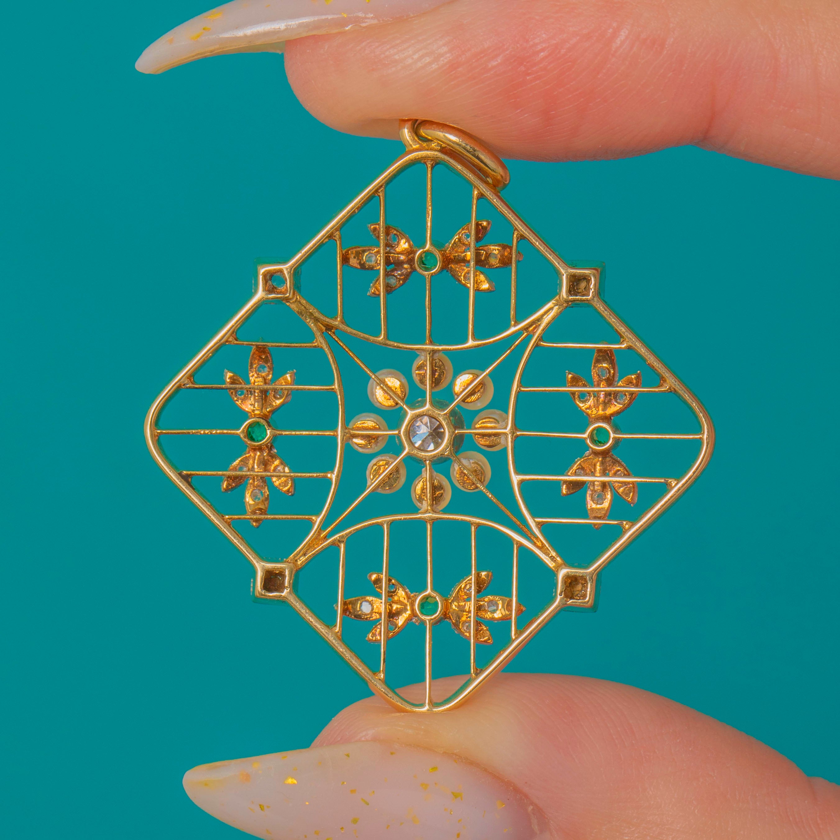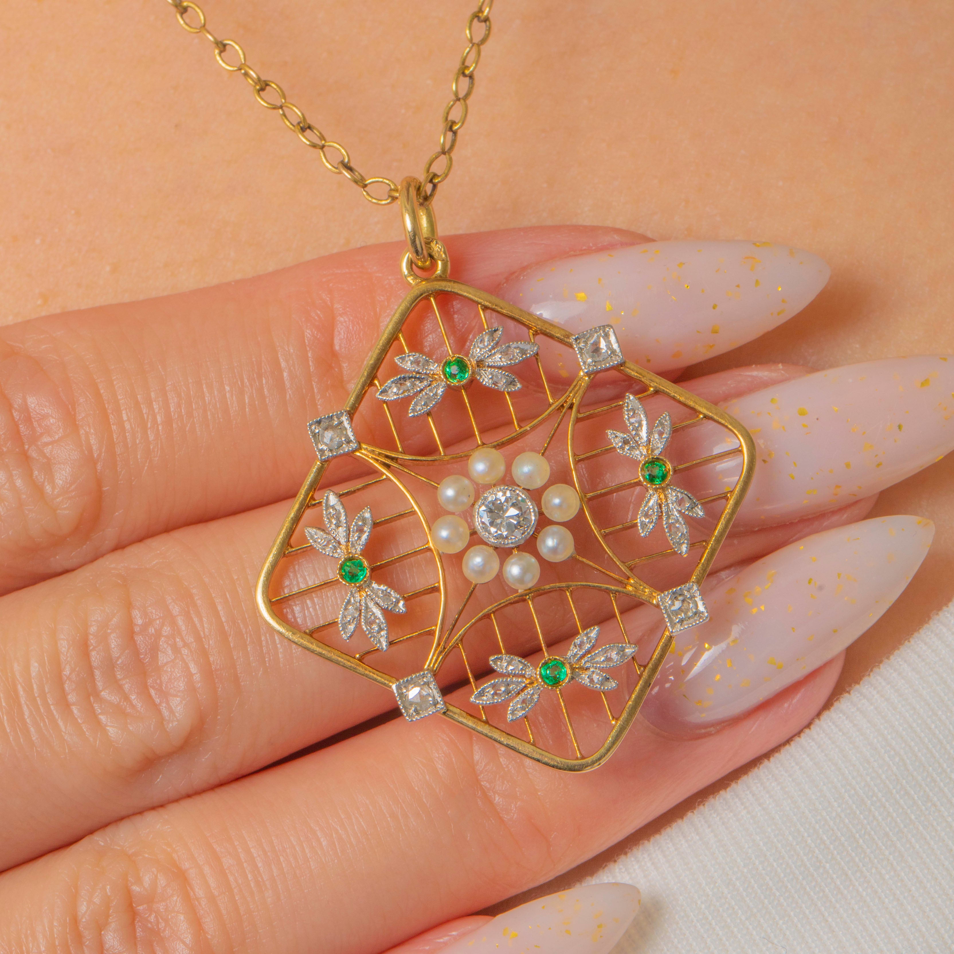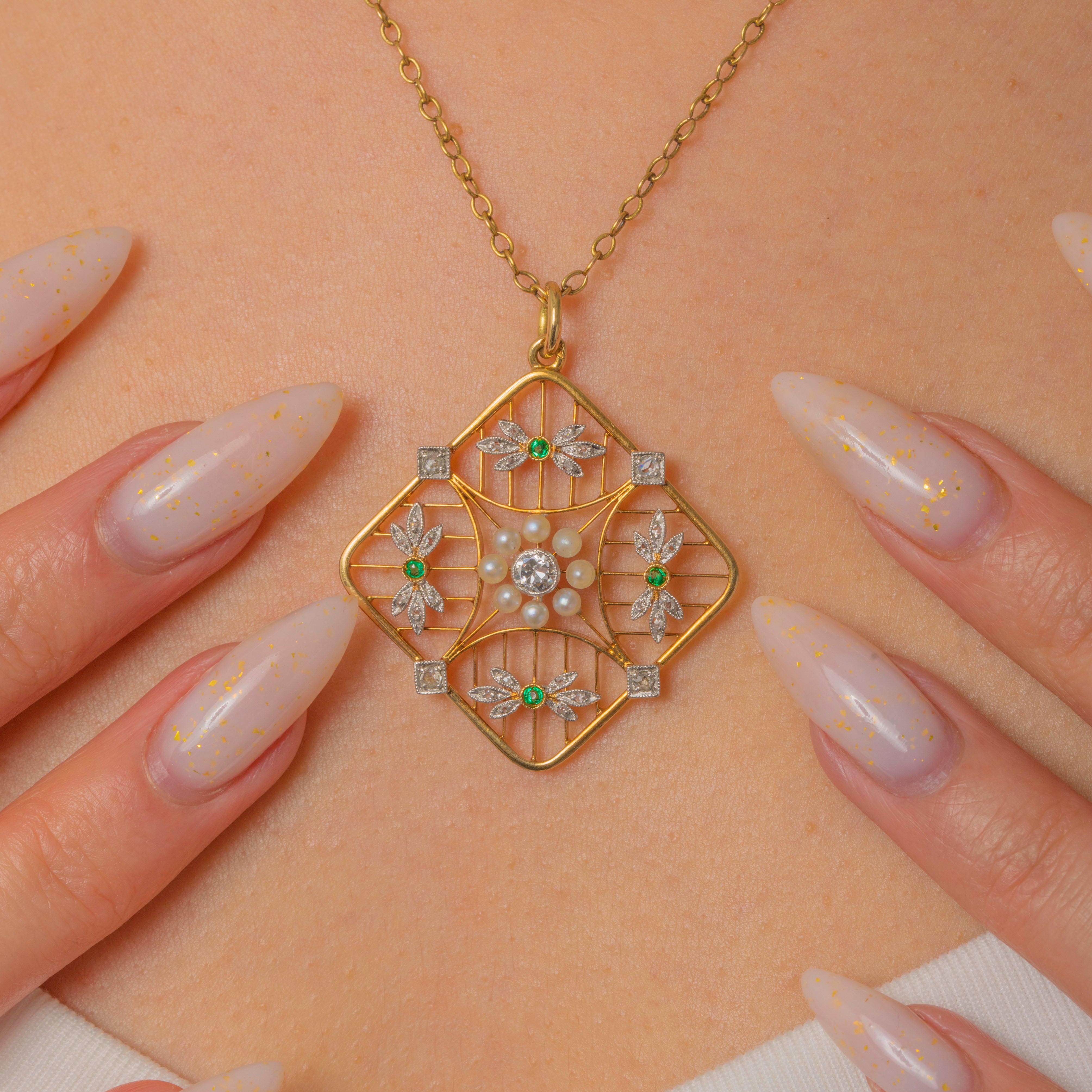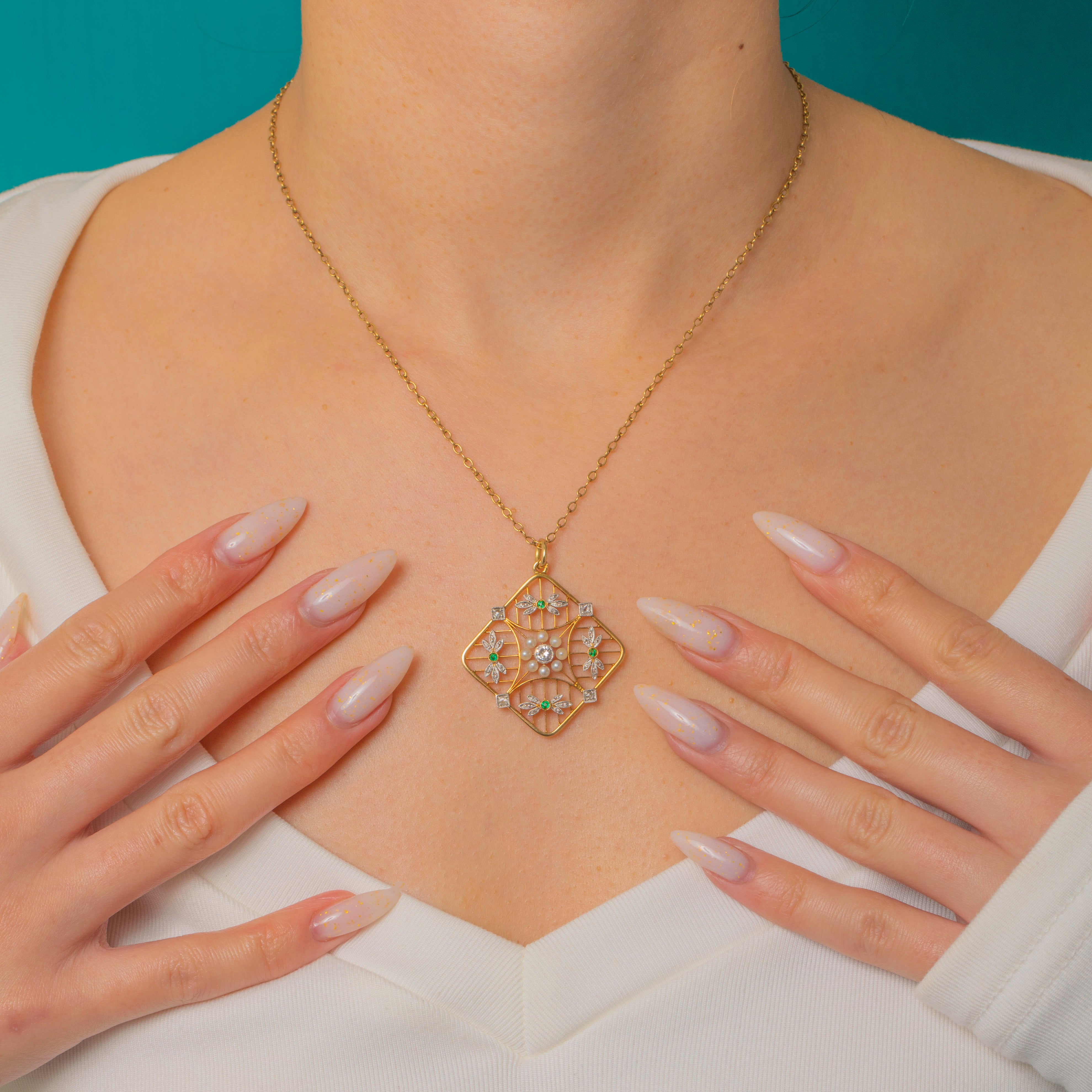 A jewel of poise and delicacy, this Edwardian pendant unfurls in an elegant lozenge silhouette crafted in rich 18ct Gold, its Diamonds set in cool Platinum for a refined two‑tone finish. At the heart sits a bright 3mm Diamond of approximately 0.10ct, encircled by a halo of creamy seed Pearls that lend softness and lustre. Four vivid green Demantoid Garnets glint from foliate sprays, while additional glistening Diamonds accent the openwork lattice and milgrain details, giving the piece a light, lace‑like radiance.