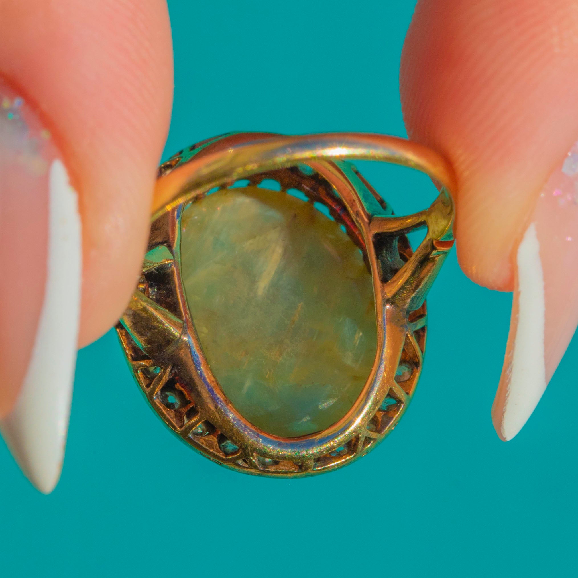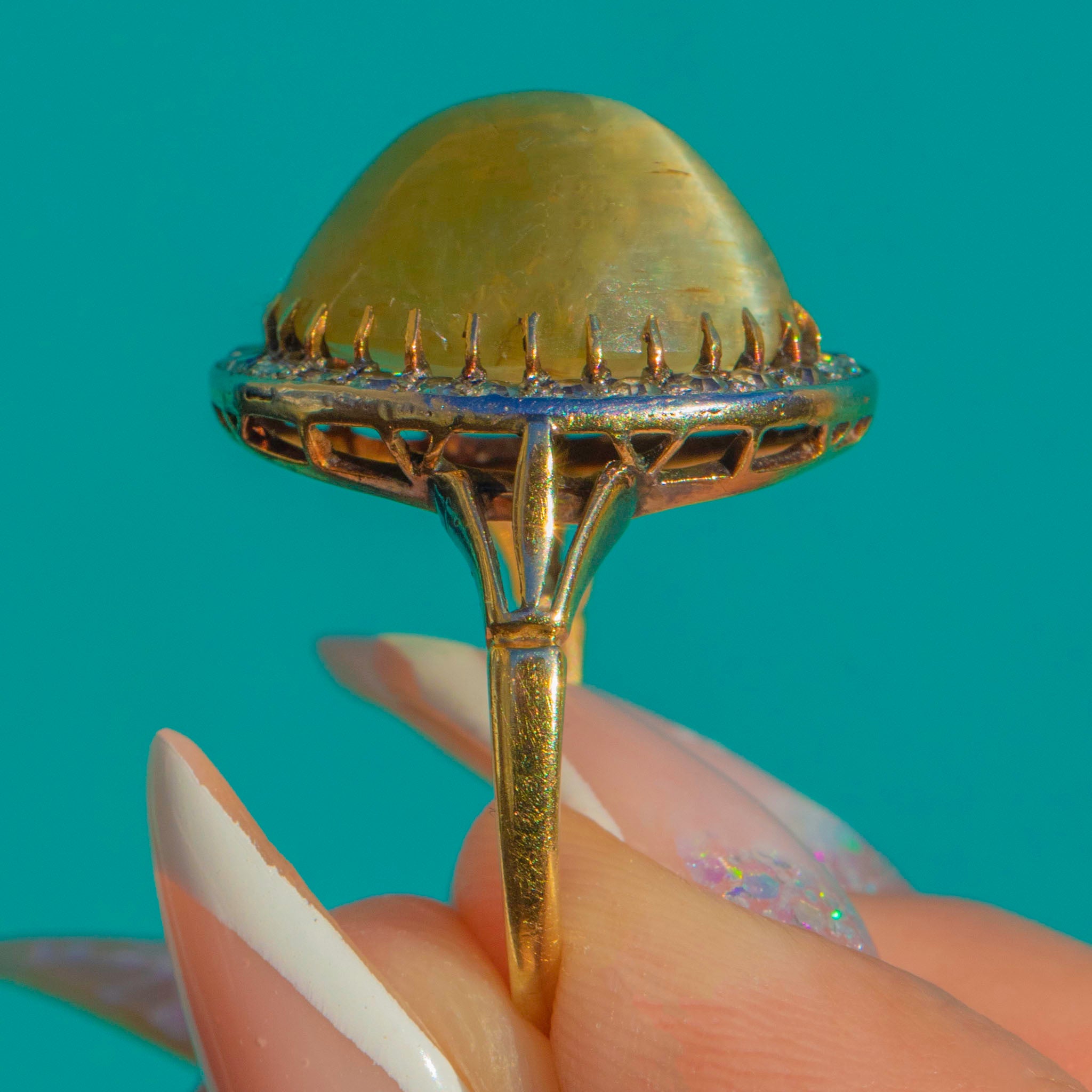 Bold yet exquisitely balanced, the large, sculptural cabochon dome plays beautifully with the scintillation of the Diamond surround. An enduringly chic oval halo silhouette, crafted with that airy late Victorian finesse!
