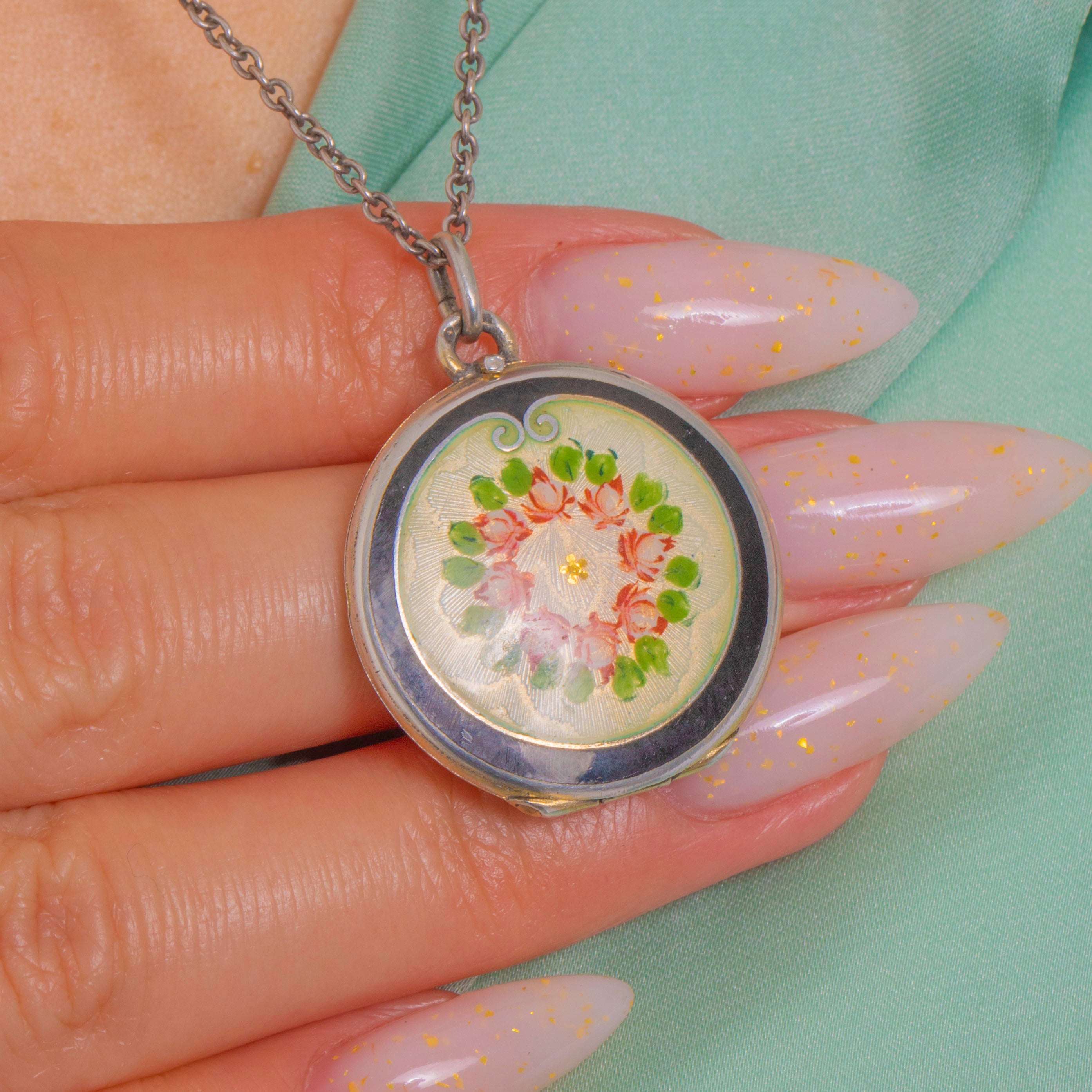 A delicate Edwardian Guilloché Enamel locket, its round face adorned with a hand-painted floral wreath of soft pink blossoms and fresh green leaves on a pale cream-mint, engine-turned ground. A glossy black Enamel ring frames the scene with a tiny scroll flourish at 12 o’clock, all set within a smooth Silver bezel and finished with a fixed hasp and jump ring.