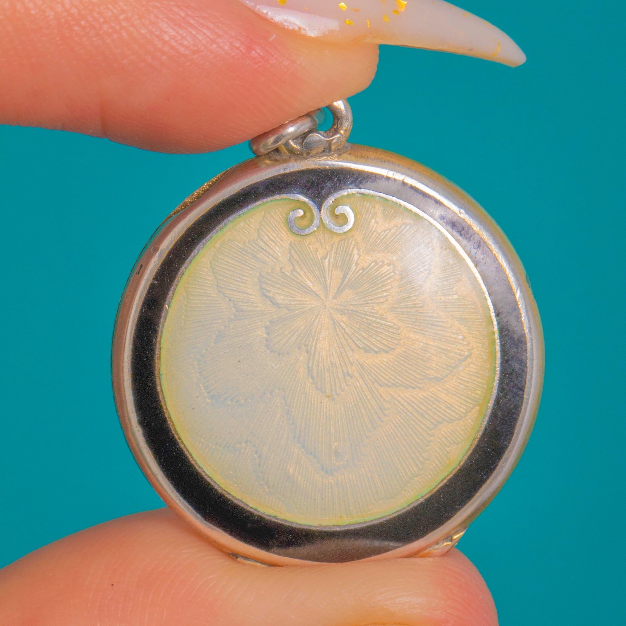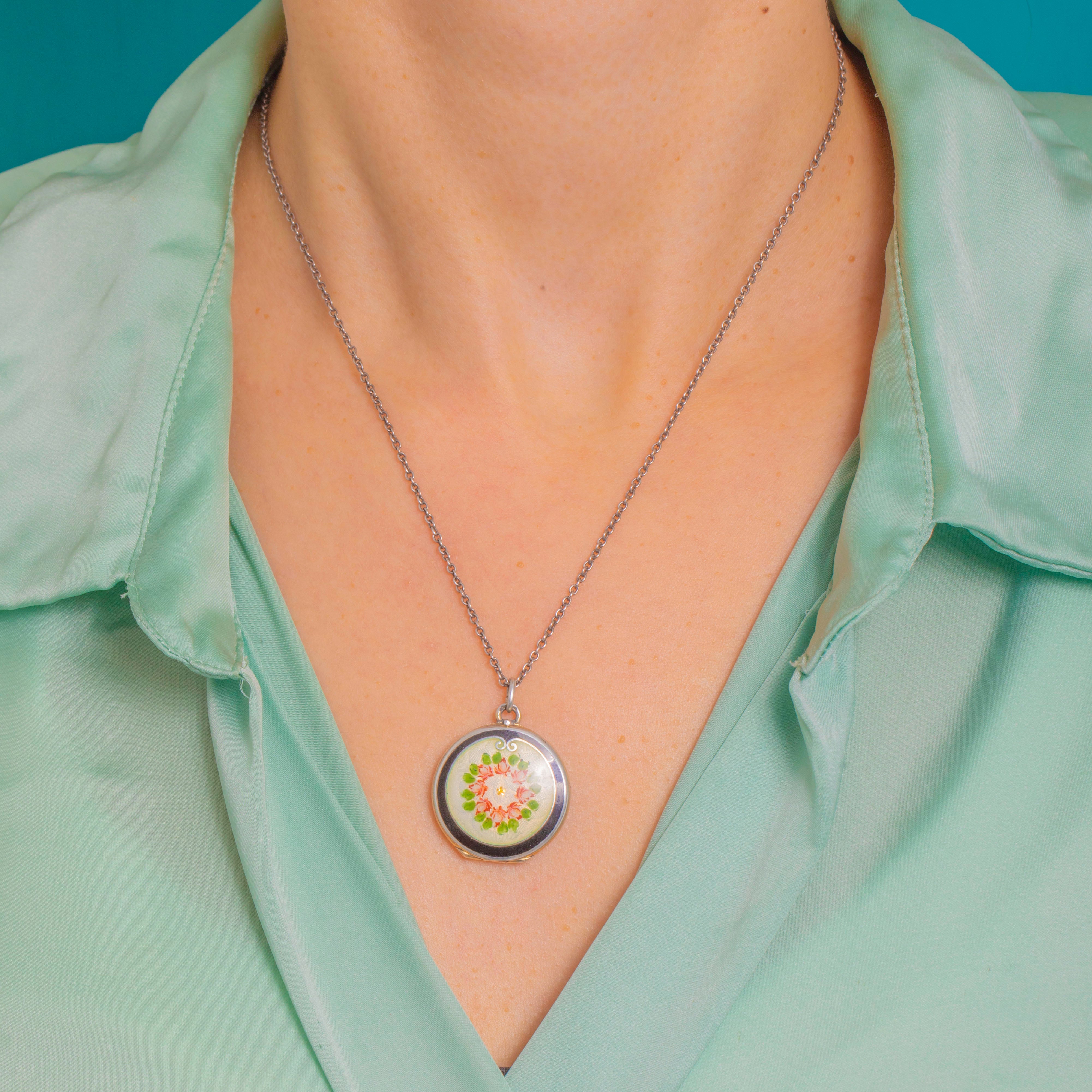 The two-part hinged locket opens to reveal a warm 9ct Gold-gilded interior. Refined, romantic and exquisitely detailed, it captures the light with that unmistakable Guilloché shimmer so loved in the early 20th century.