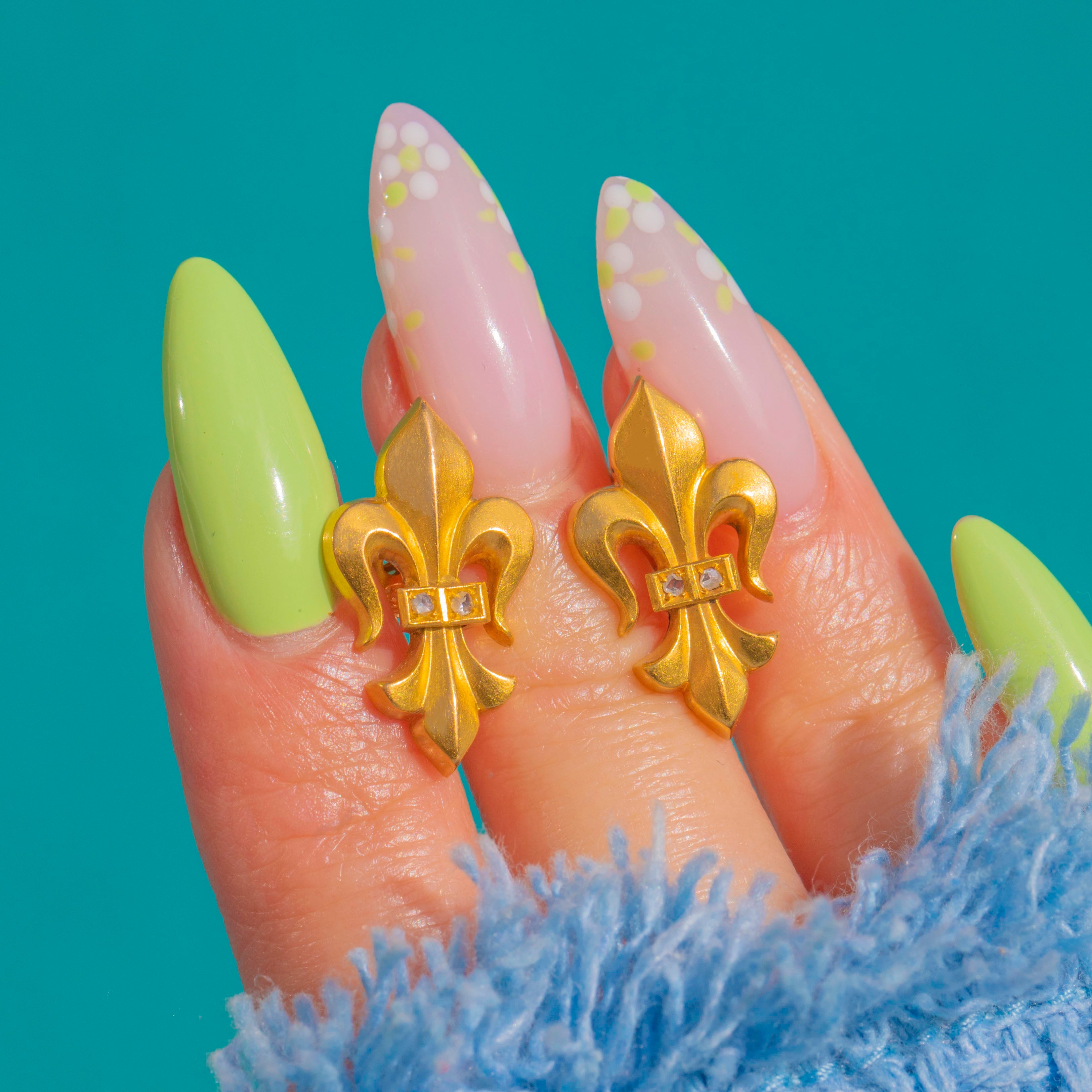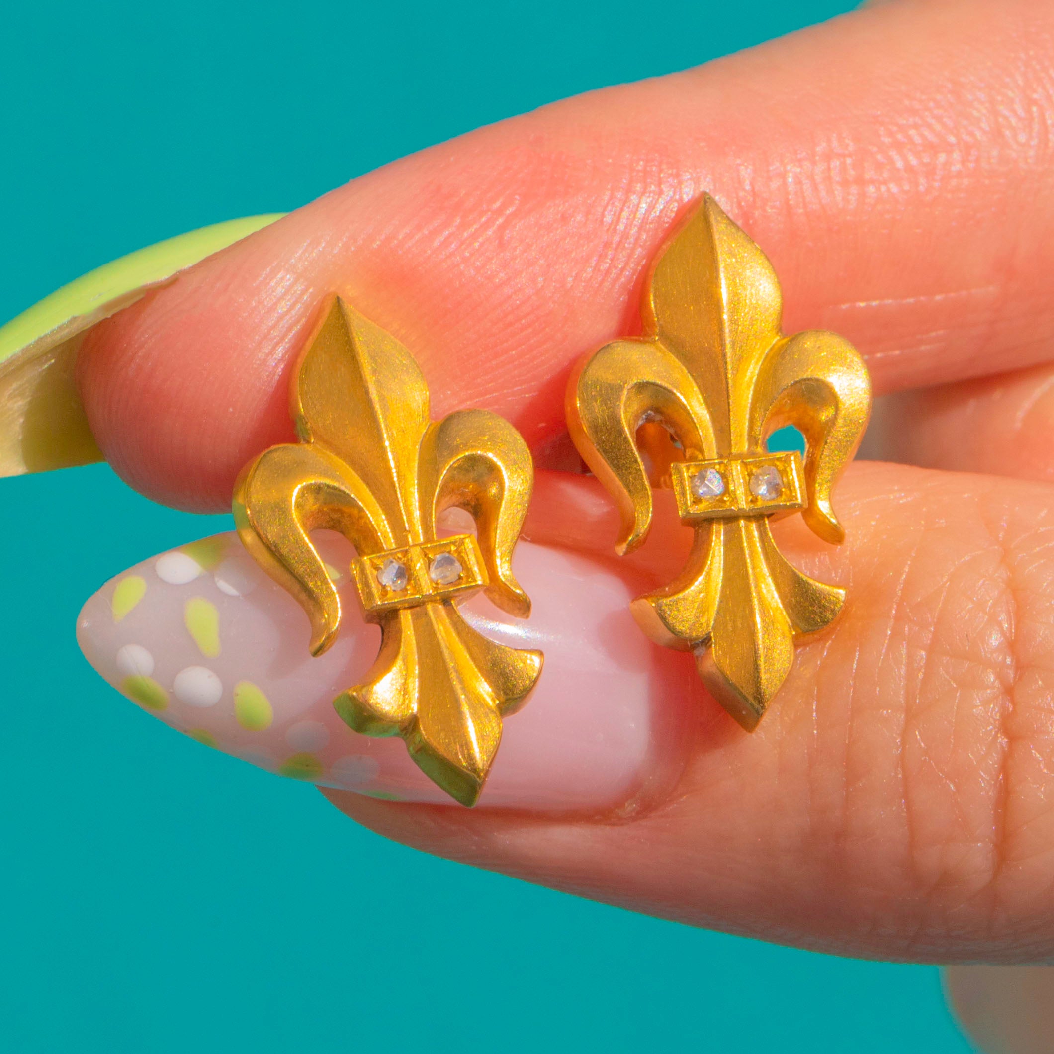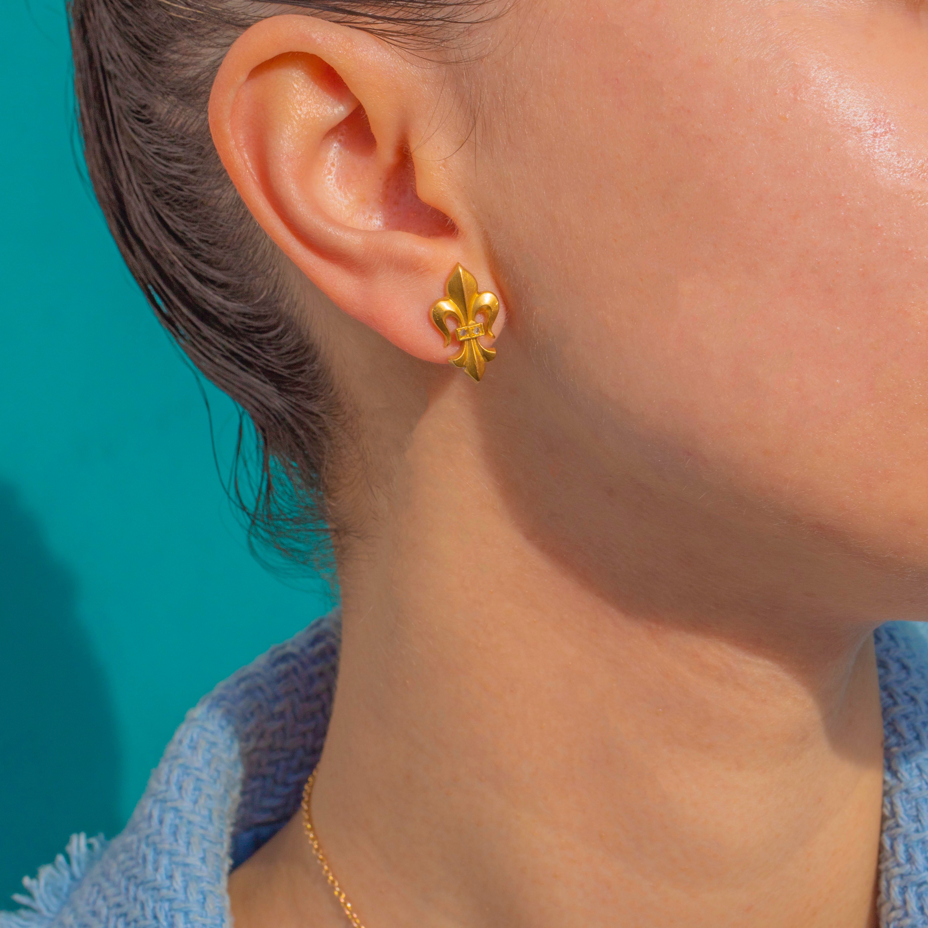 Evoking the elegance of the Second Empire, these French Victorian Fleur-de-Lis stud earrings are crafted in rich 18ct Gold and highlighted with glittering rose-cut Diamonds. The iconic lily silhouette is crisply modelled, its soft curves and sculpted detail brought to life by the warm glow of high-carat Gold.