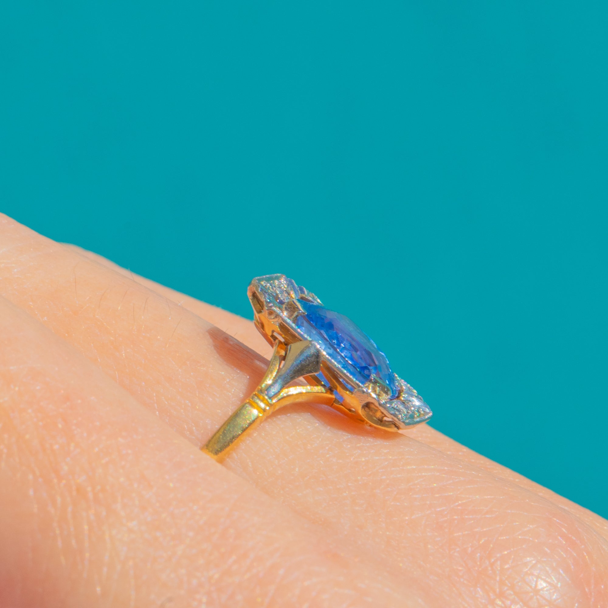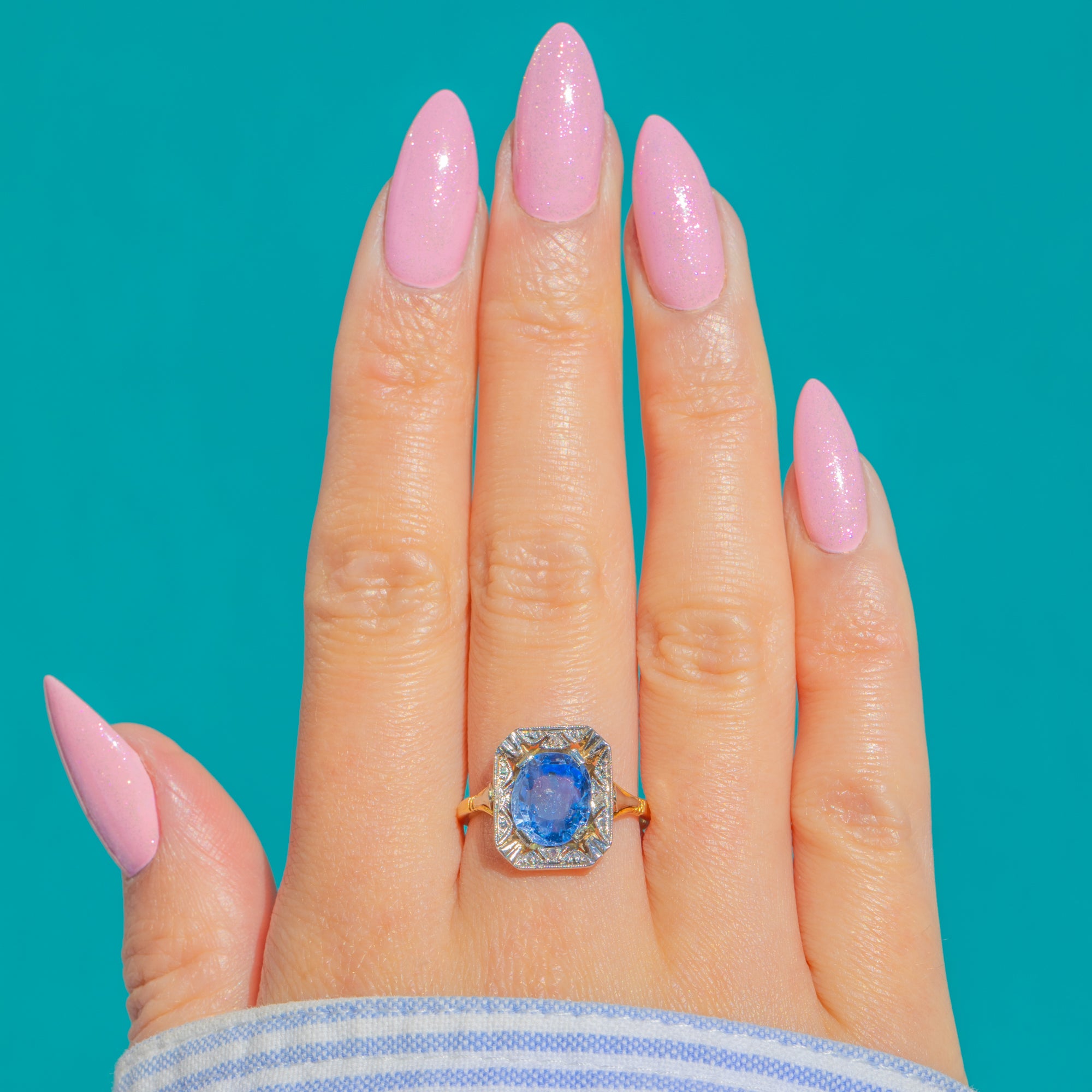 A glorious French Art Deco ring, alive with crisp geometry and a luminous cornflower hue. At its heart glows an approximately 2.70ct Natural no heat Sapphire, antique faceted and set within a Platinum-topped rectangular cluster traced with fine milgrain. Small Diamond accents add a delicate sparkle to the frame, while an elegant openwork gallery lifts the stone to the light, all poised upon a warm 18ct Gold shank.