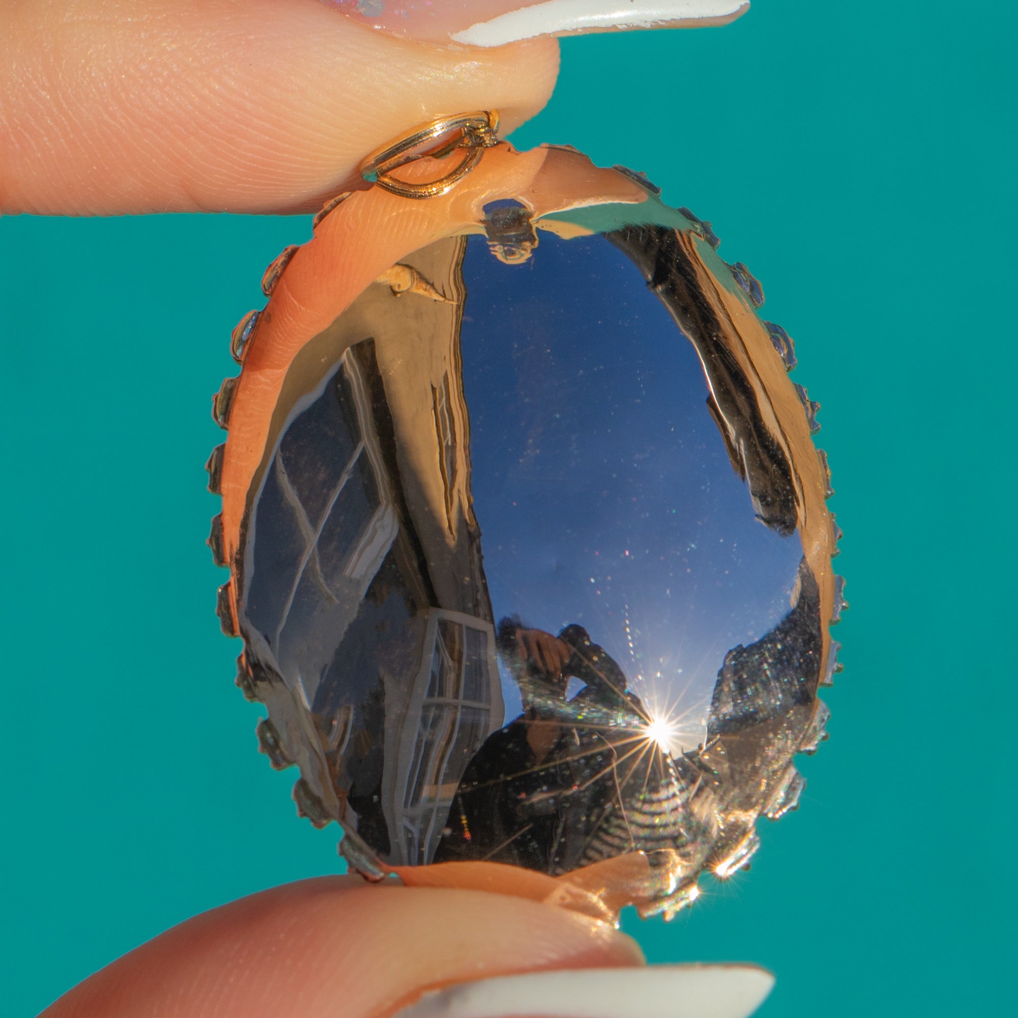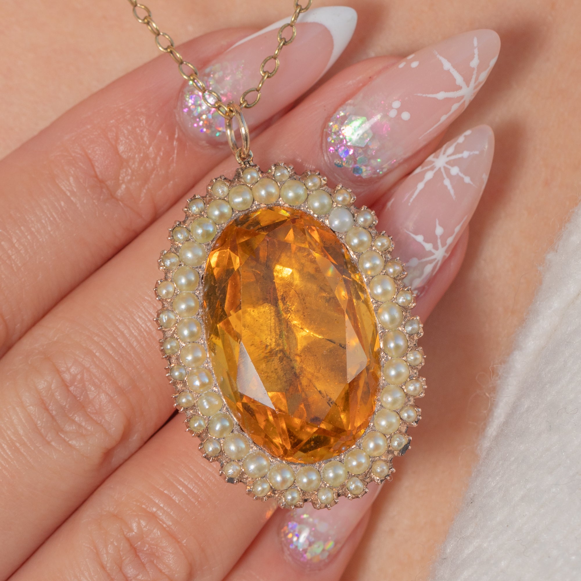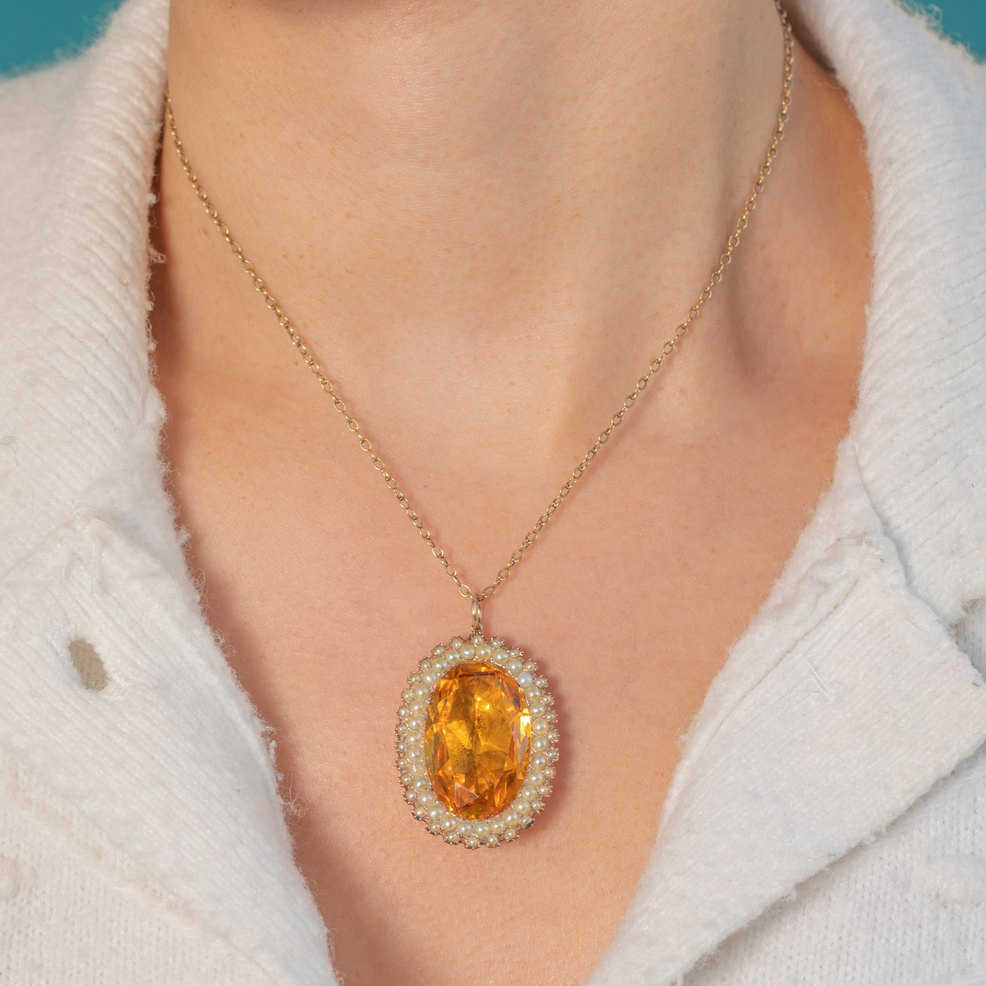 Glowing with Georgian romance, this statement pendant centres on a vivid foiled Citrine in a warm 15ct Gold collet, its honeyed fire intensified by the foil behind the stone. A close halo of graduating Pearls adds a soft, creamy lustre, while the scalloped perimeter brings an ornate yet refined flourish quintessential of the era.