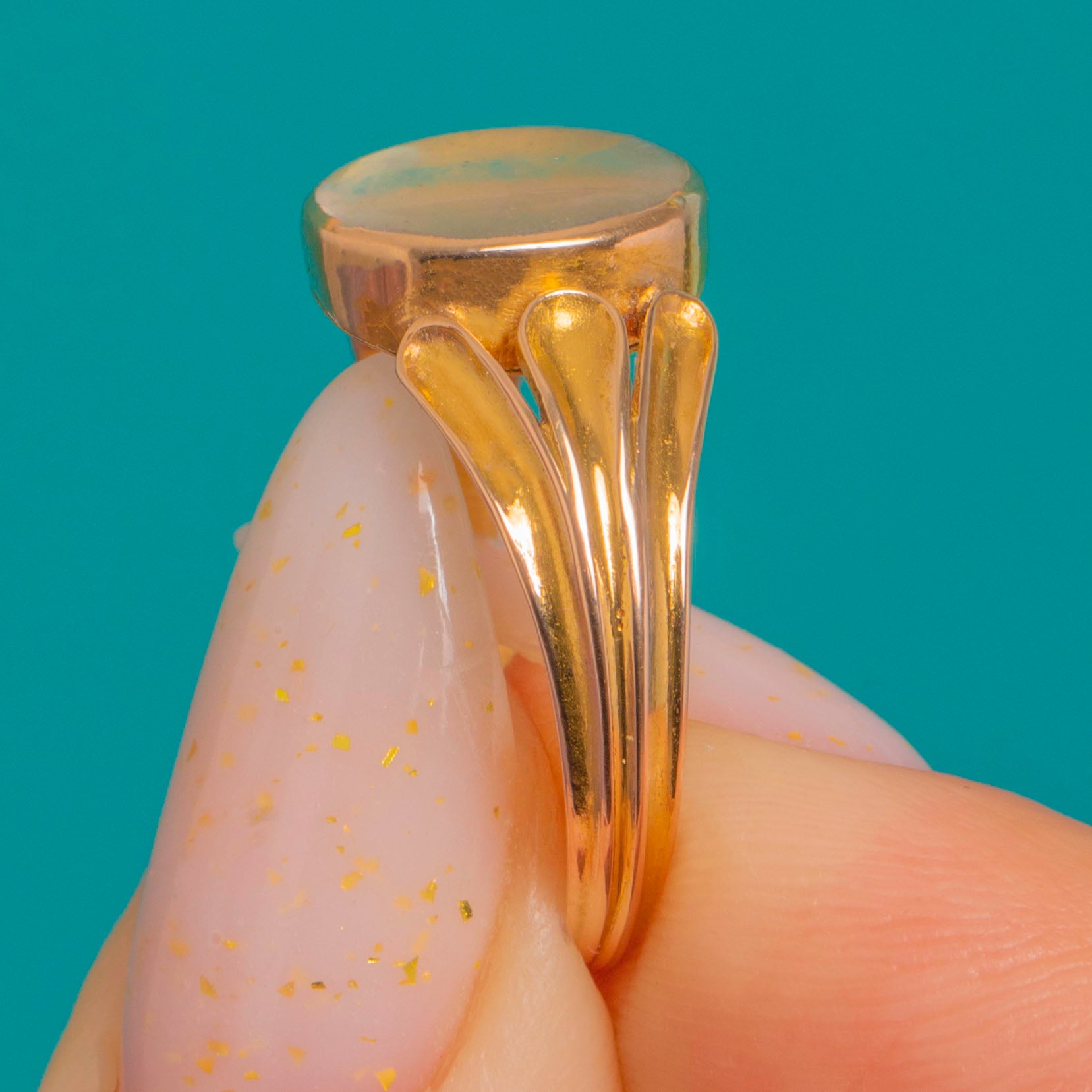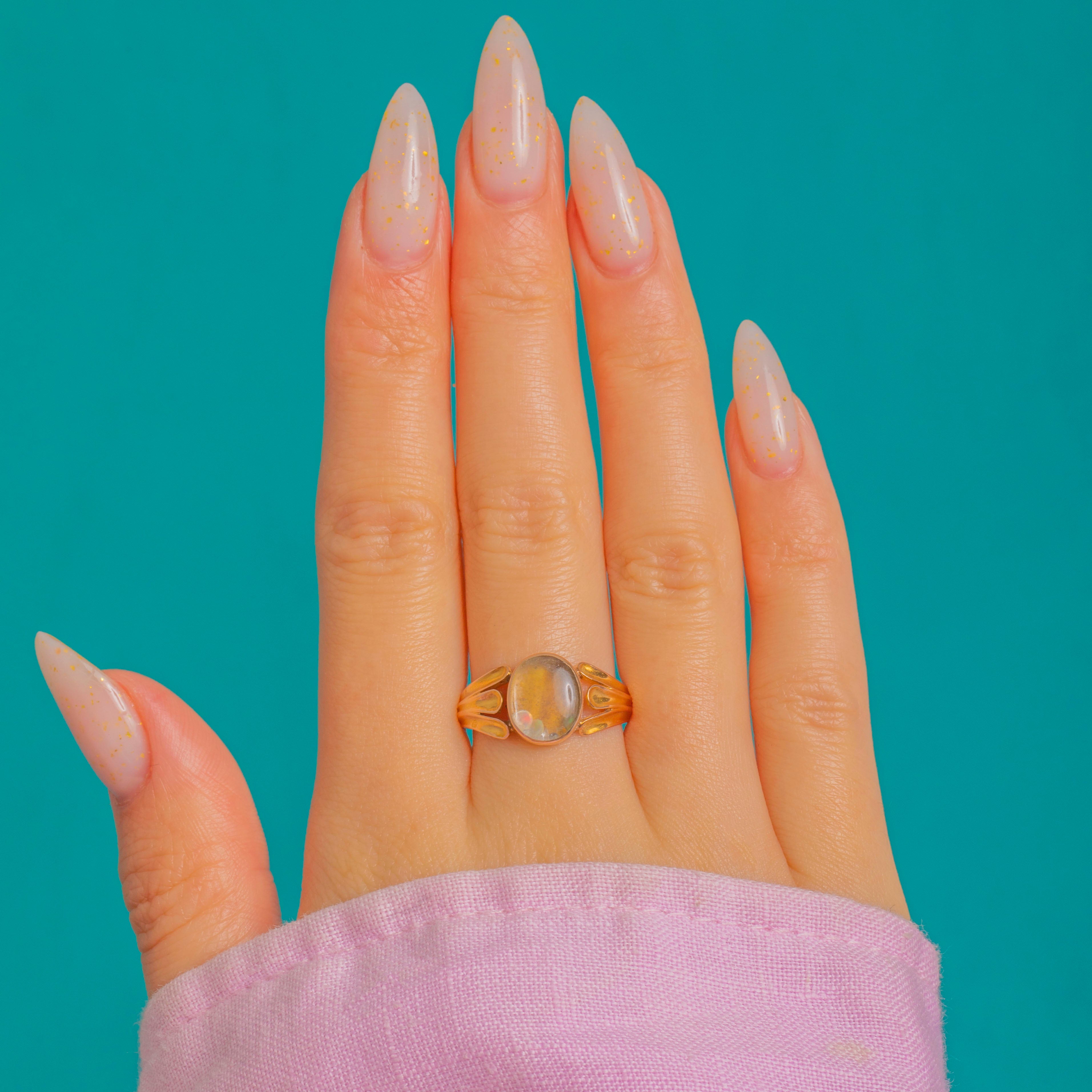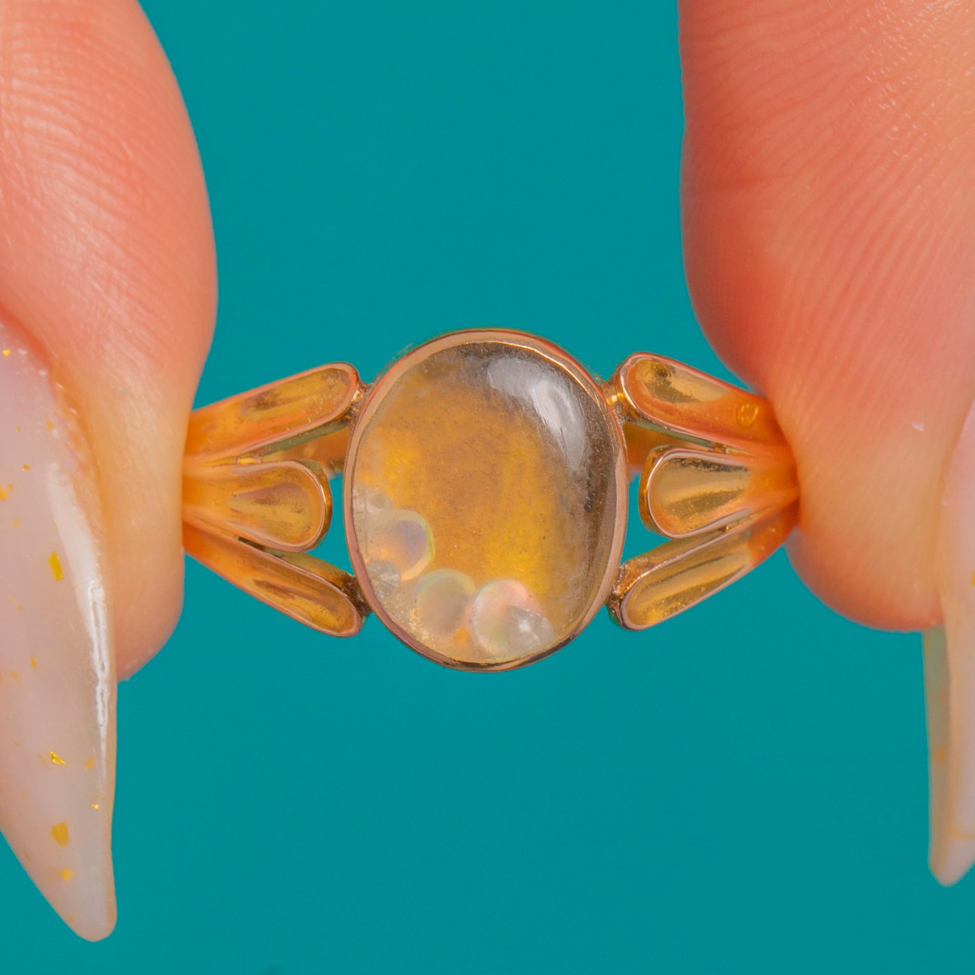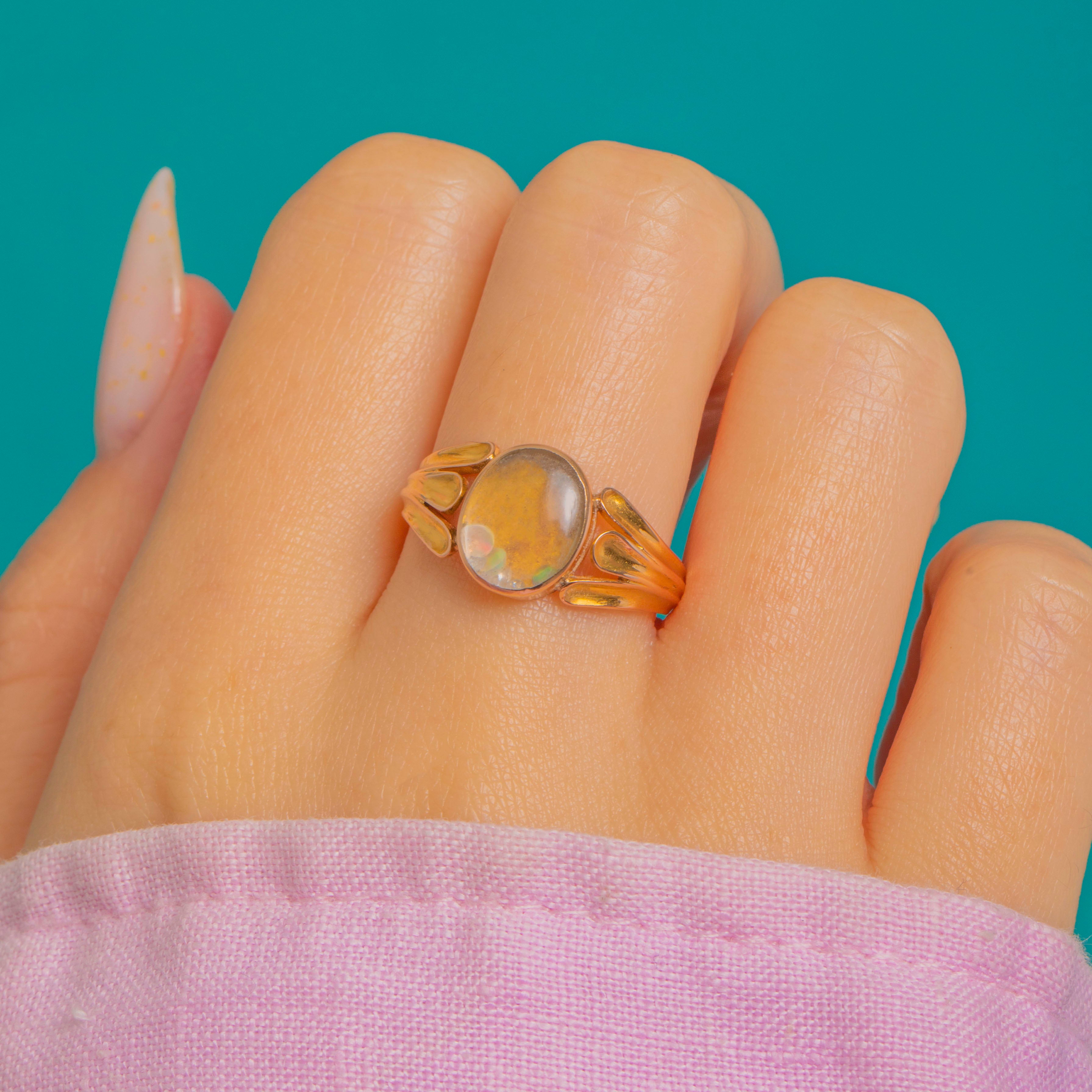 A captivating Georgian locket ring in rich 15ct Gold, crafted with softly split, foliate shoulders and a smooth oval bezel. The hinged twin‑lobe cover lifts to reveal a domed transparent compartment holding loose Diamonds (D colour VS clarity) and Opals that shimmer and dance with flashes of green, pink and orange as they move.