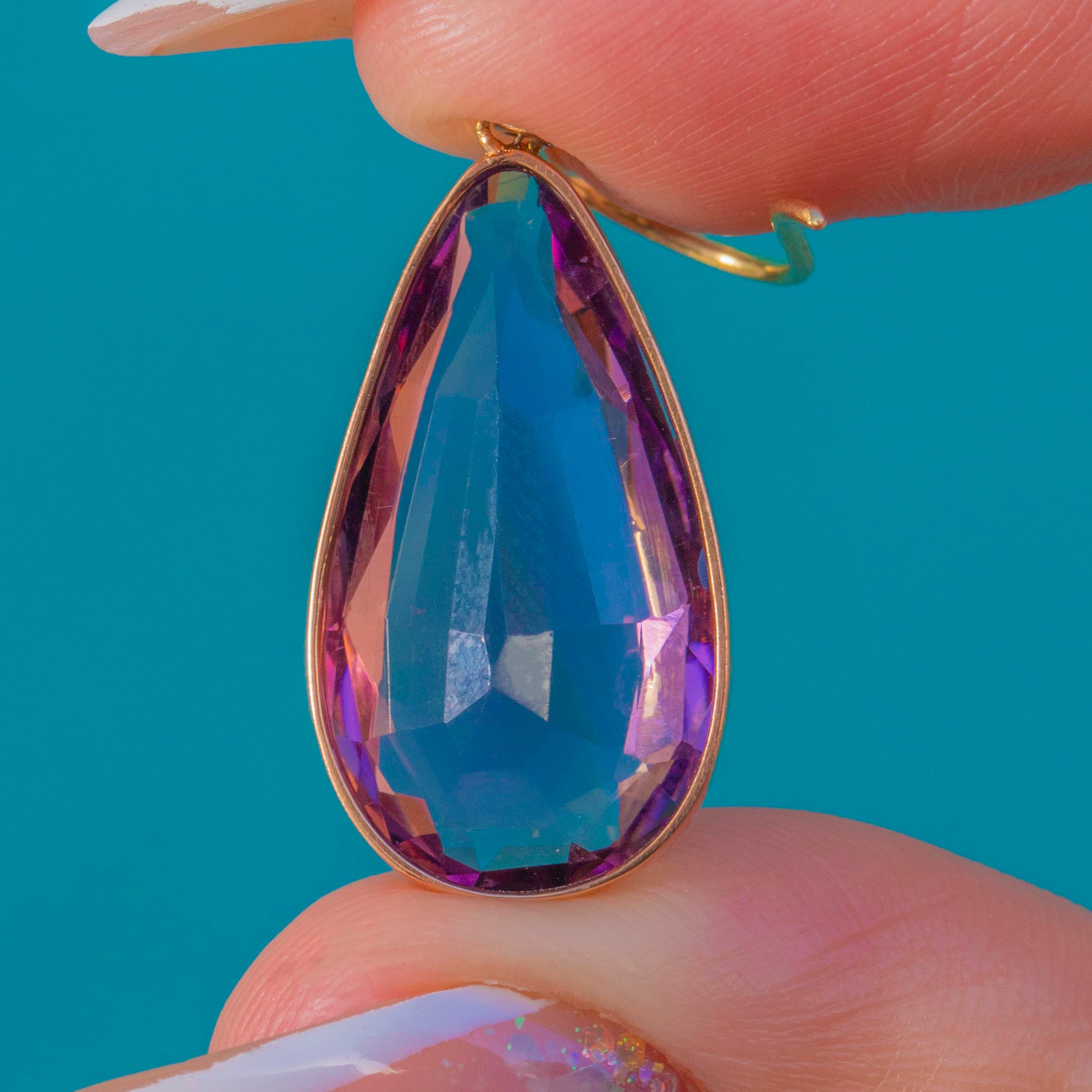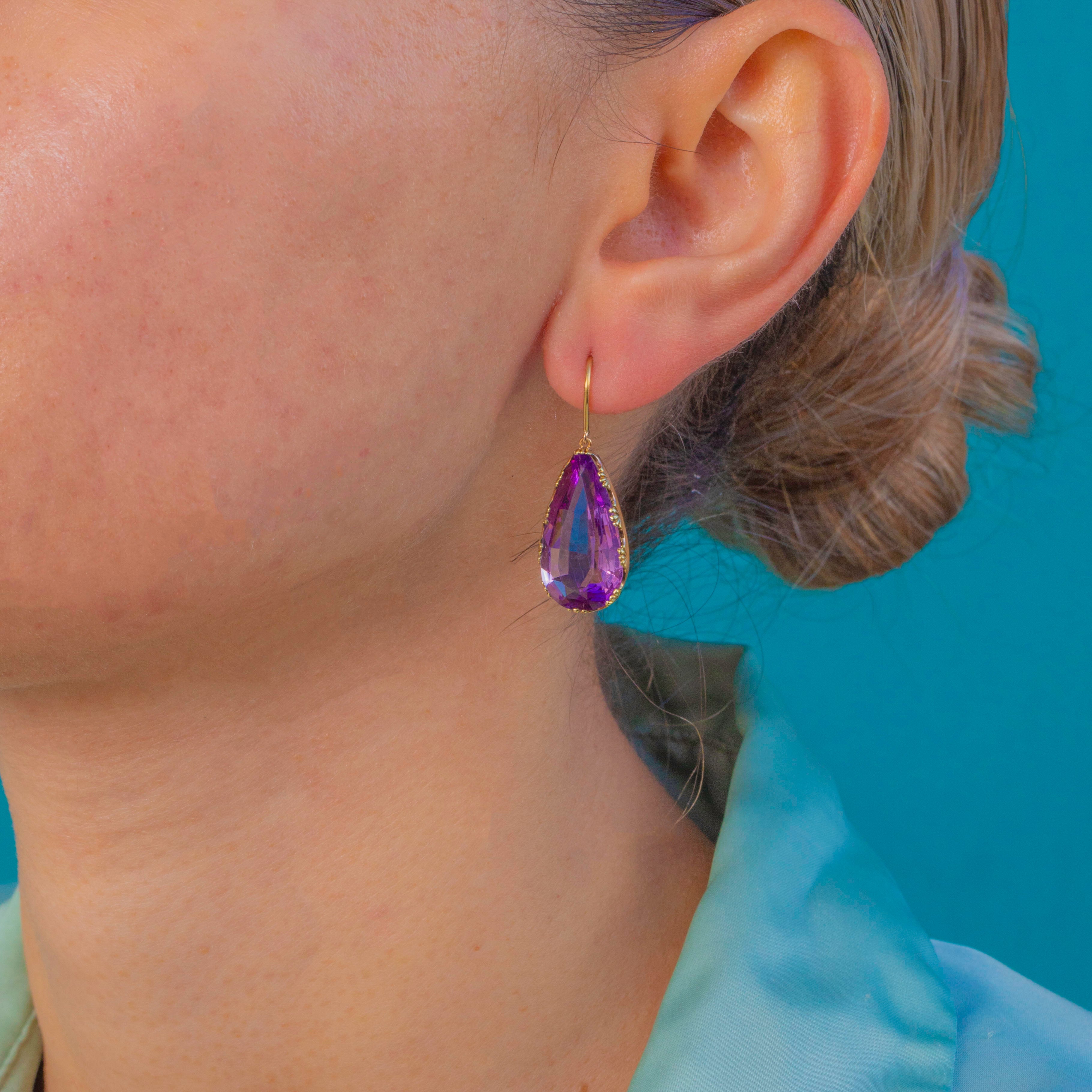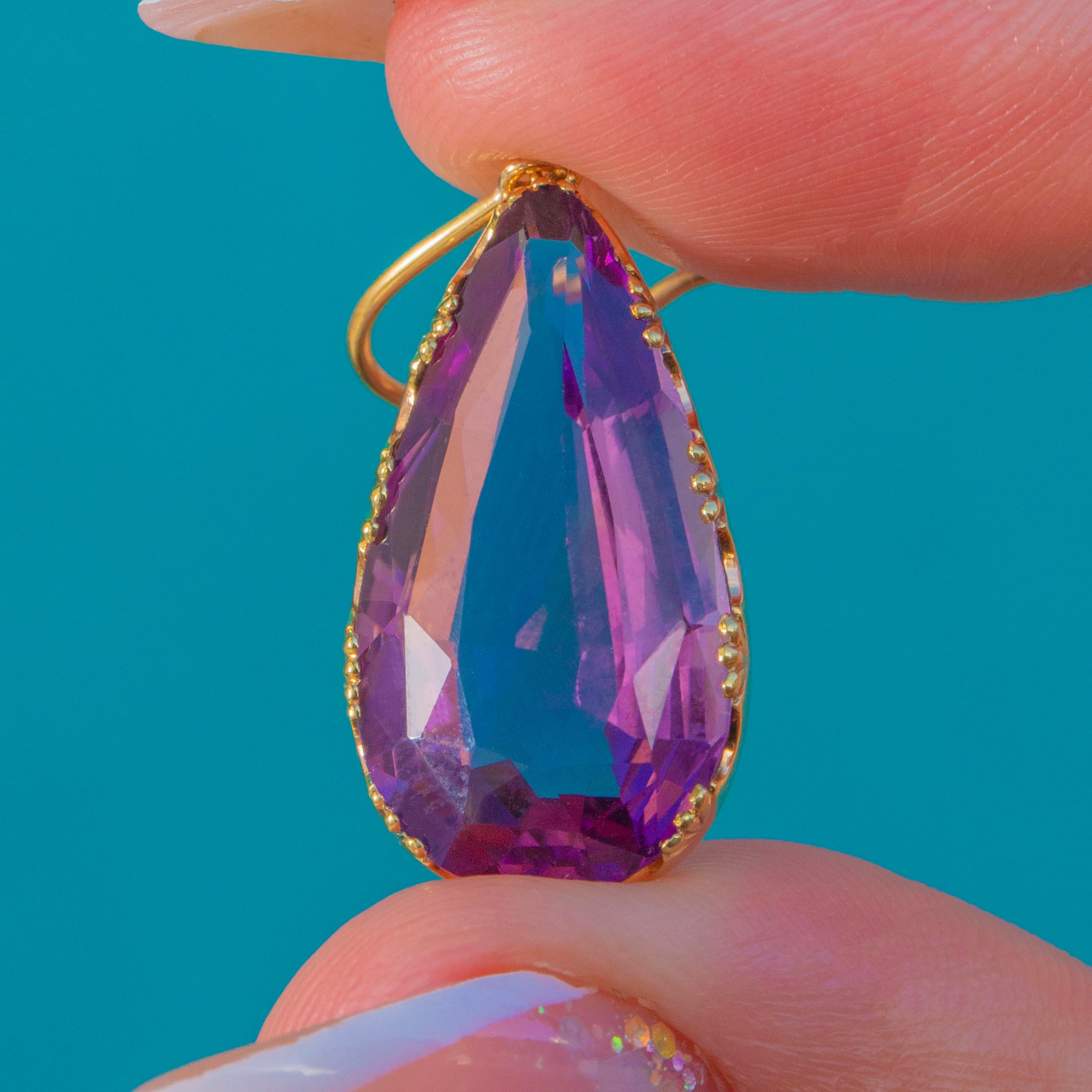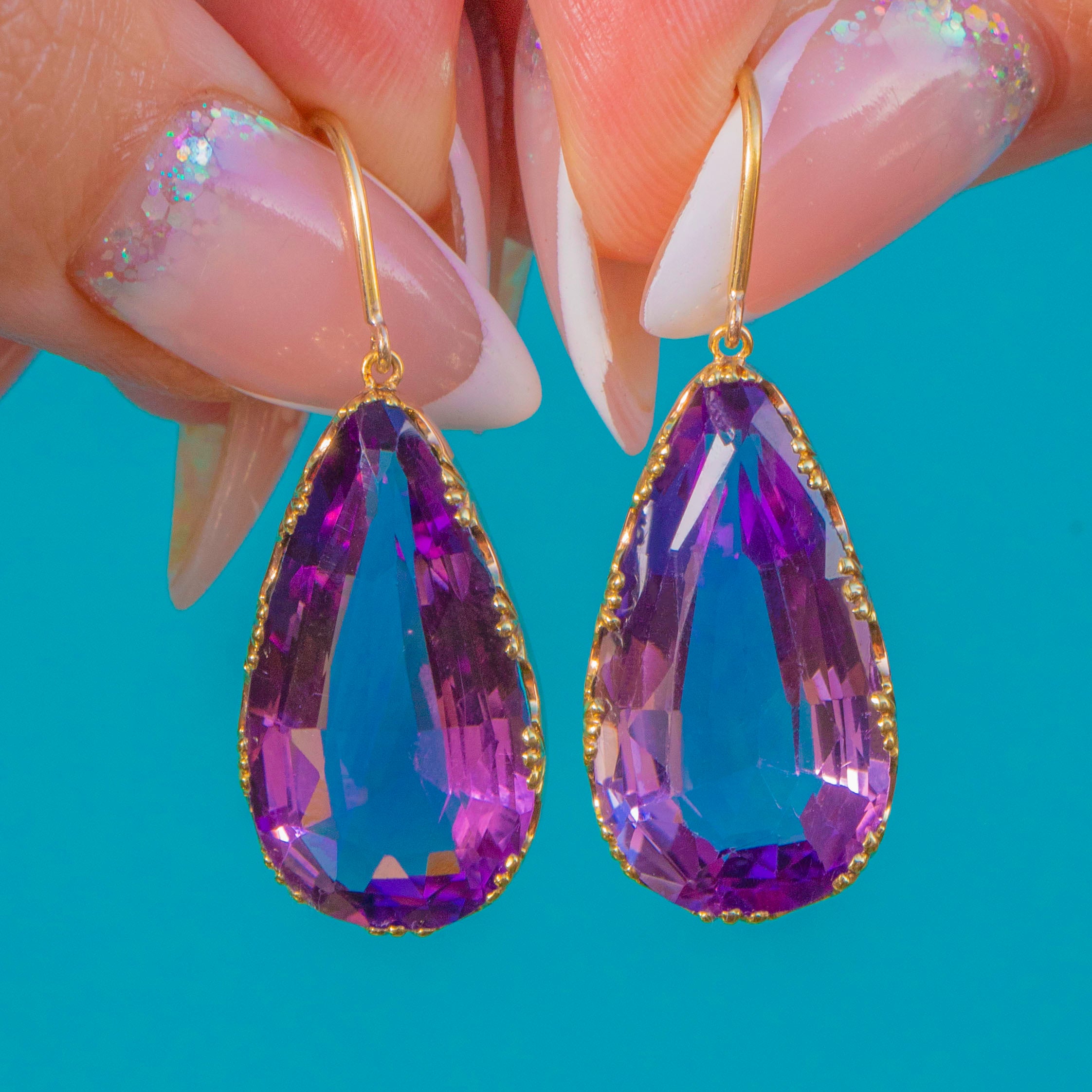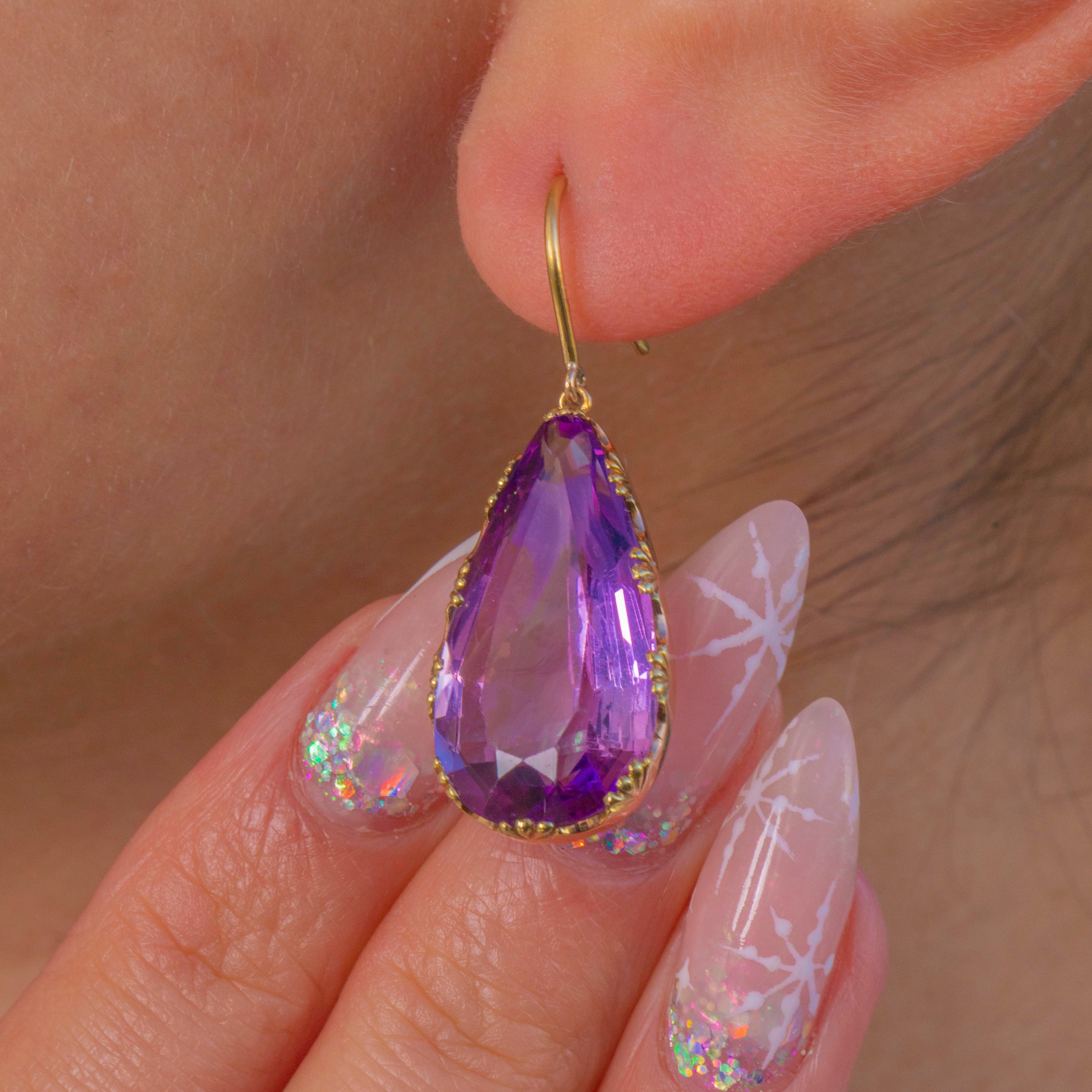 These magnificent Georgian Amethyst earrings are exceptionally feminine, showcasing large teardrop-cut Amethysts, with a combined weight of 6.45ct, set in warm 18ct Gold. The open-backed settings allow light to flood through the stones, bringing out their vivid lavender-purple fire and beautifully faceted sparkle.