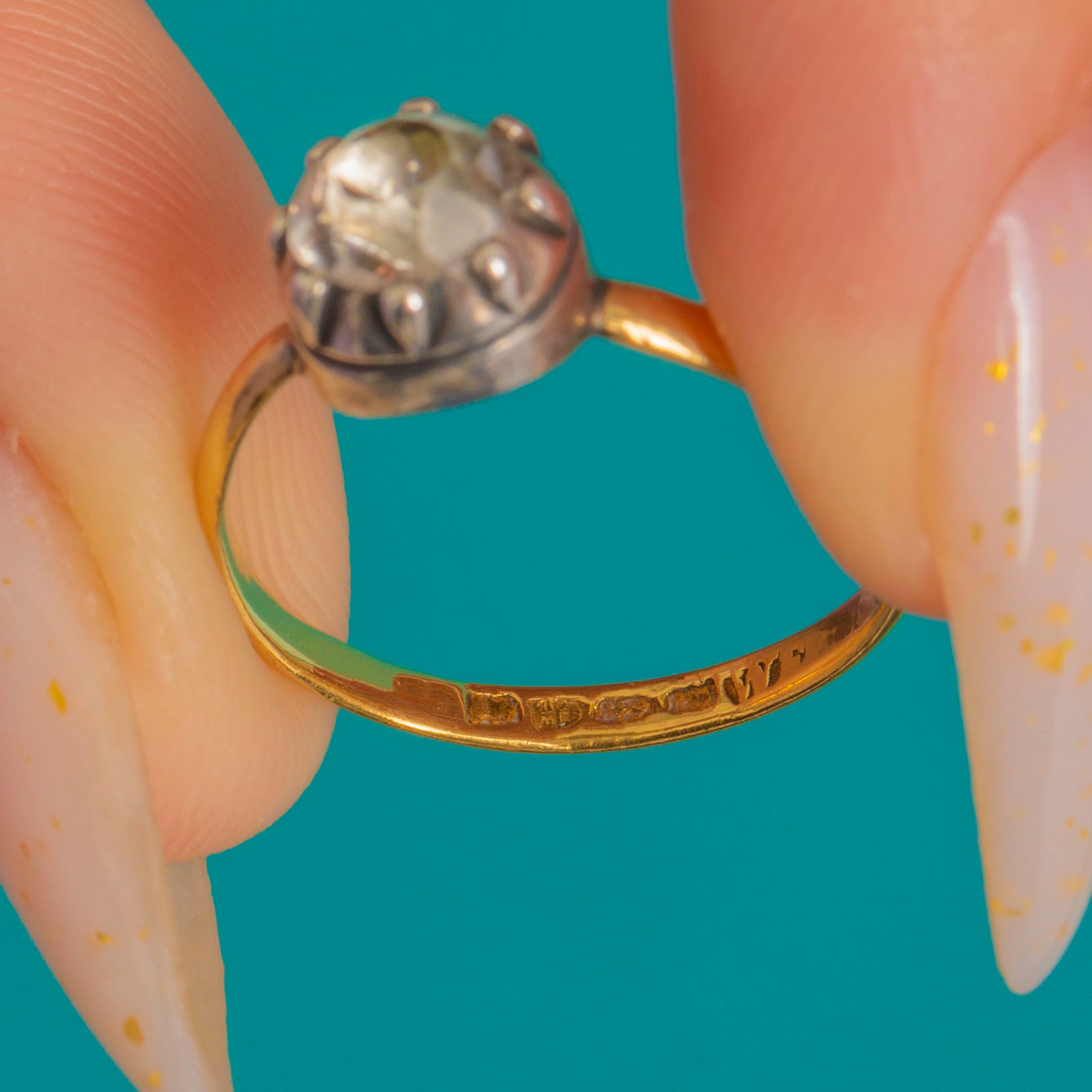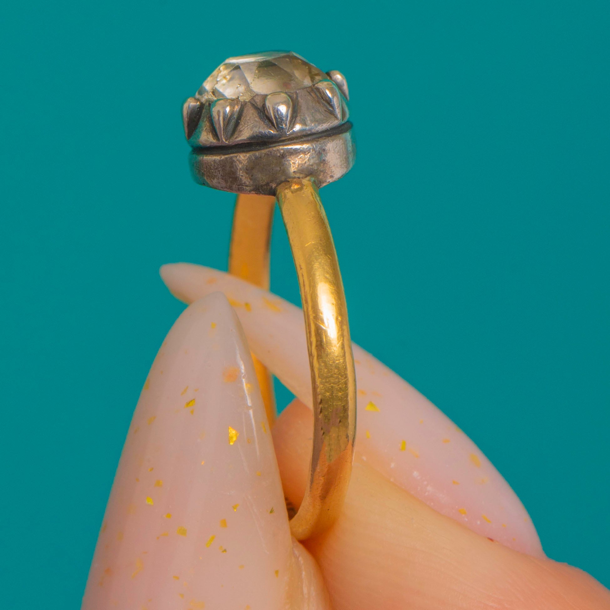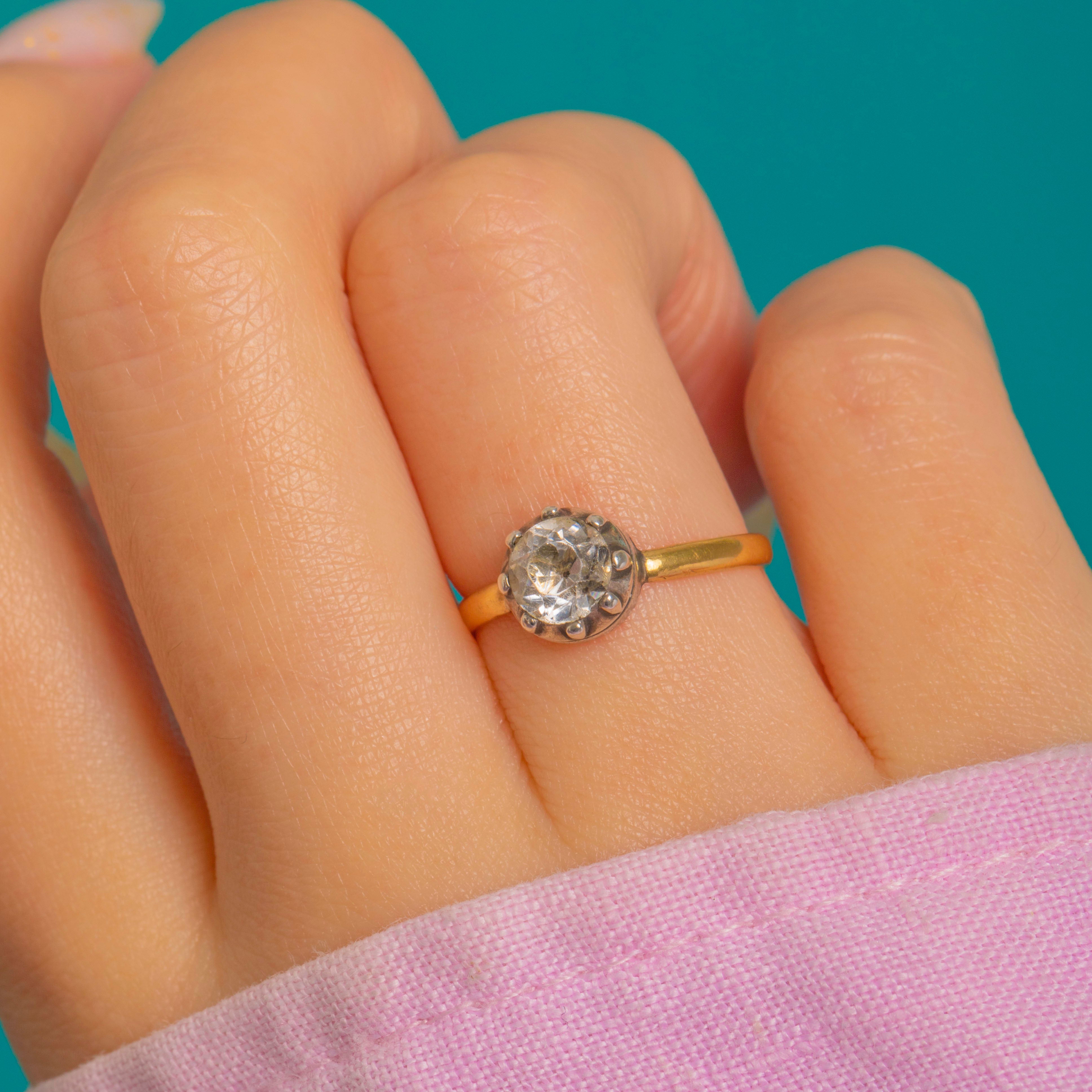 A delicate Georgian solitaire ring with all the charm of the era. Crafted in 18ct Gold with a Silver, piecrust setting, it holds a single Diamond Paste of domed, rose-cut character. The closed-back, crown-like head lends a soft glow to the stone and a refined, buttercup silhouette.