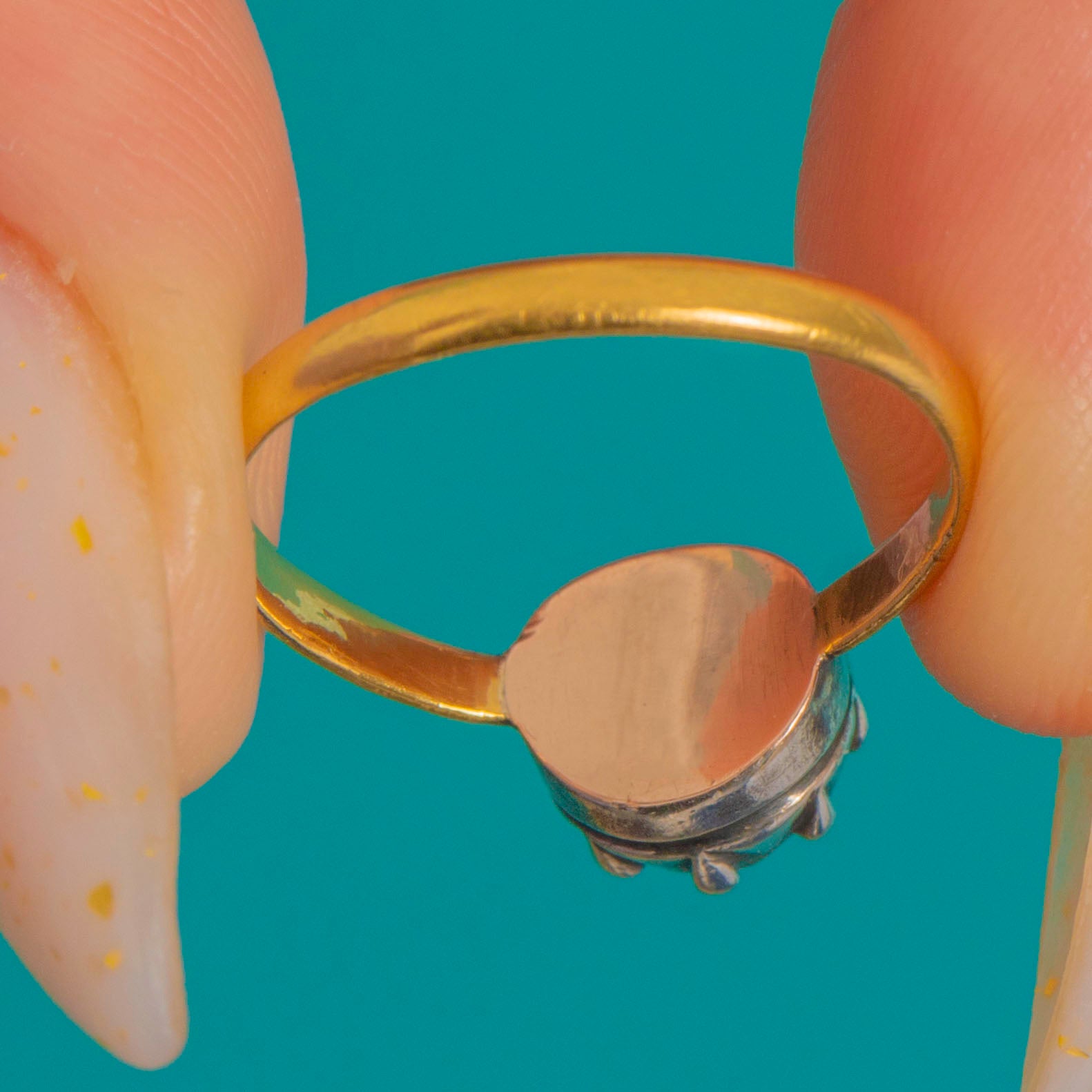 EXCELLENT: The Paste presents beautifully with only light age-related surface wear visible under magnification. The Gold shank and Silver collet are in lovely condition with gentle antique patina and minor marks commensurate with age. Hallmarks are present but obscured.