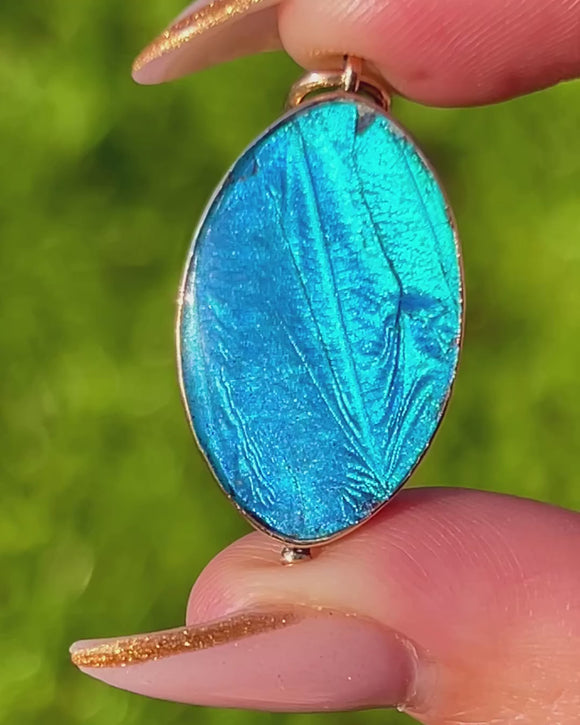 Set in a slender 9ct Gold bezel, this pendant is a classic example of early–mid 20th century butterfly wing jewellery, beloved for its ethereal, almost magical luminosity. The oval shape is flattering and elegant, and the colours are exceptionally vivid.