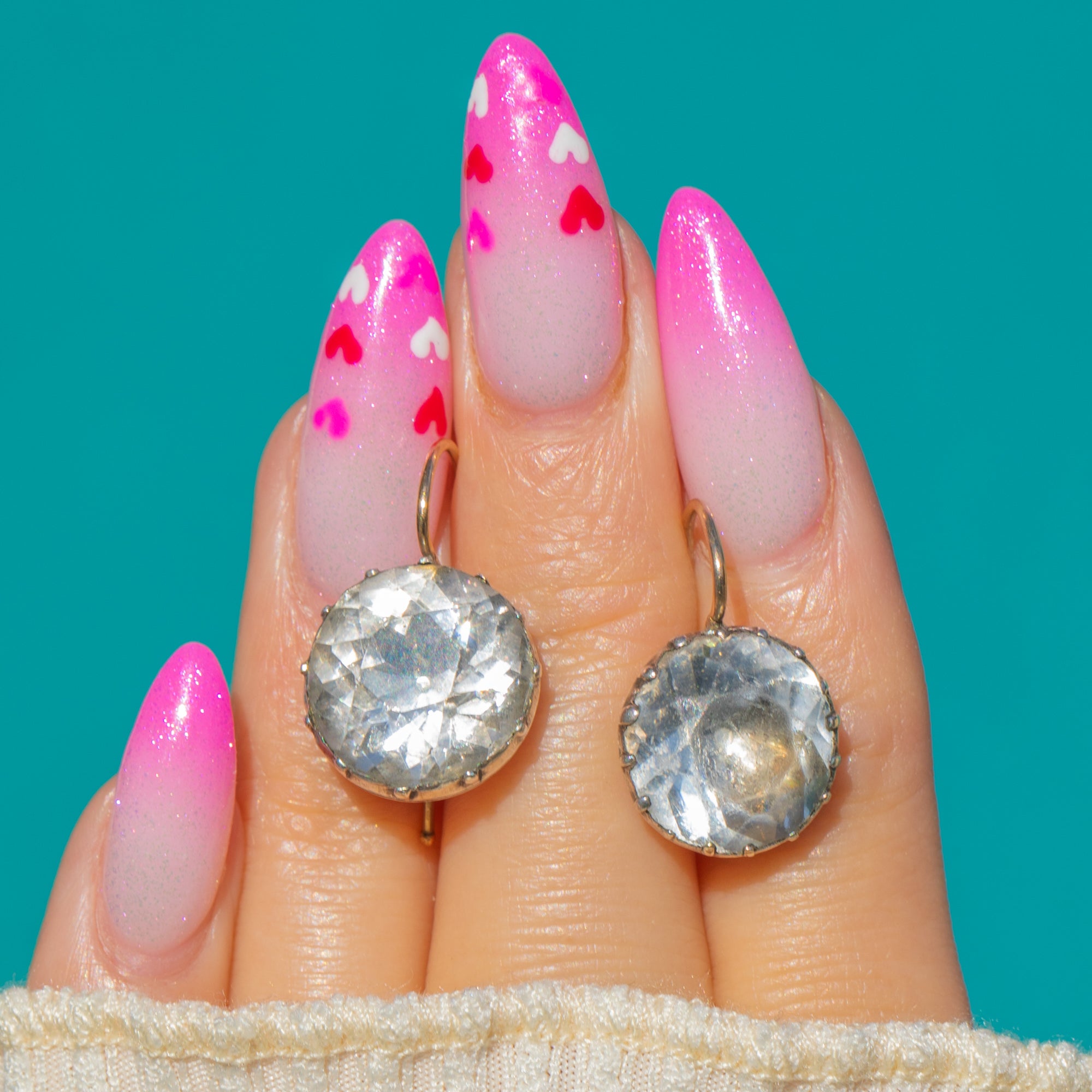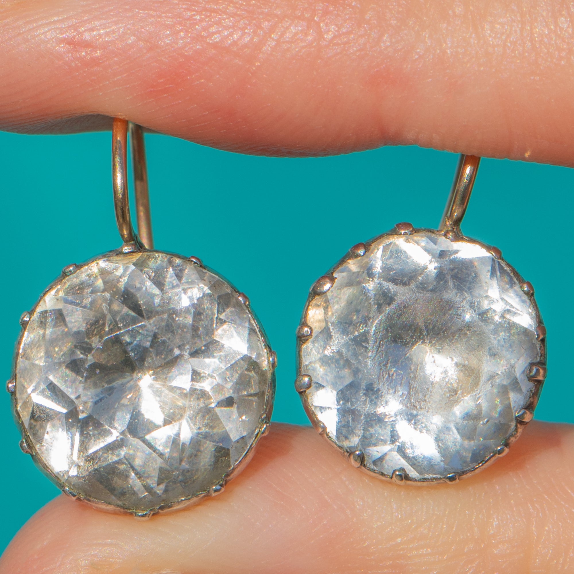 EXCELLENT: Paste stones display light facet wear and minor abrasions commensurate with age, with the soft, cloudy glow typical of antique Paste; any tiny nicks are discreet in wear. The closed-back collet settings and hooks are secure with gentle patina and no issues to the integrity of the mounts. No obvious signs of repair; the earrings have been well cared for.