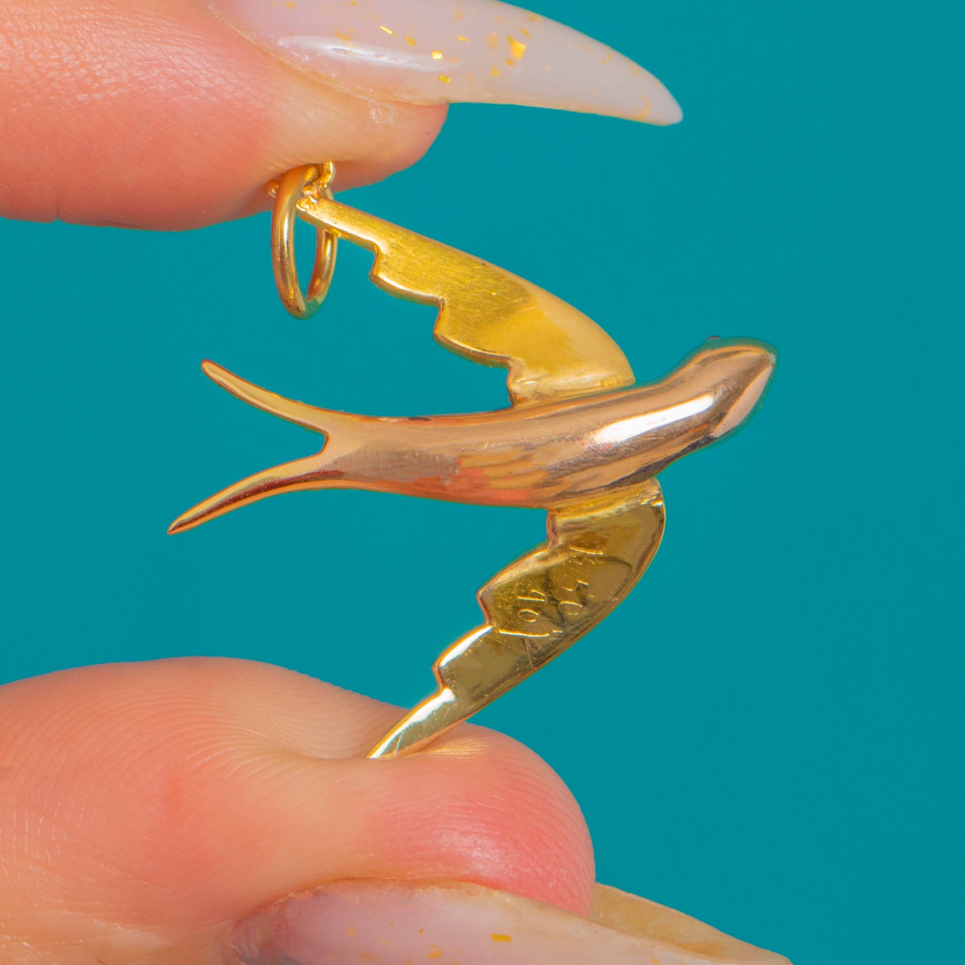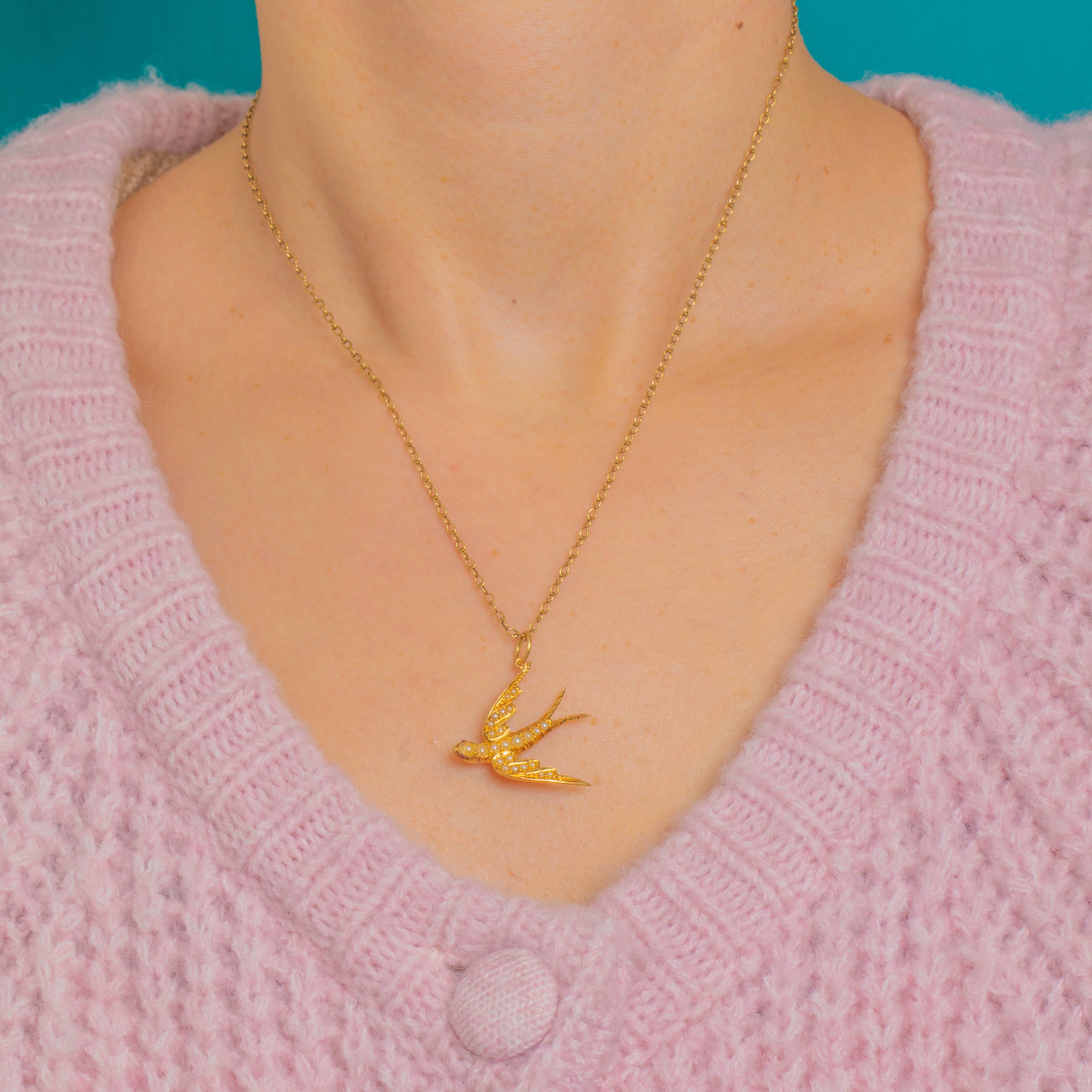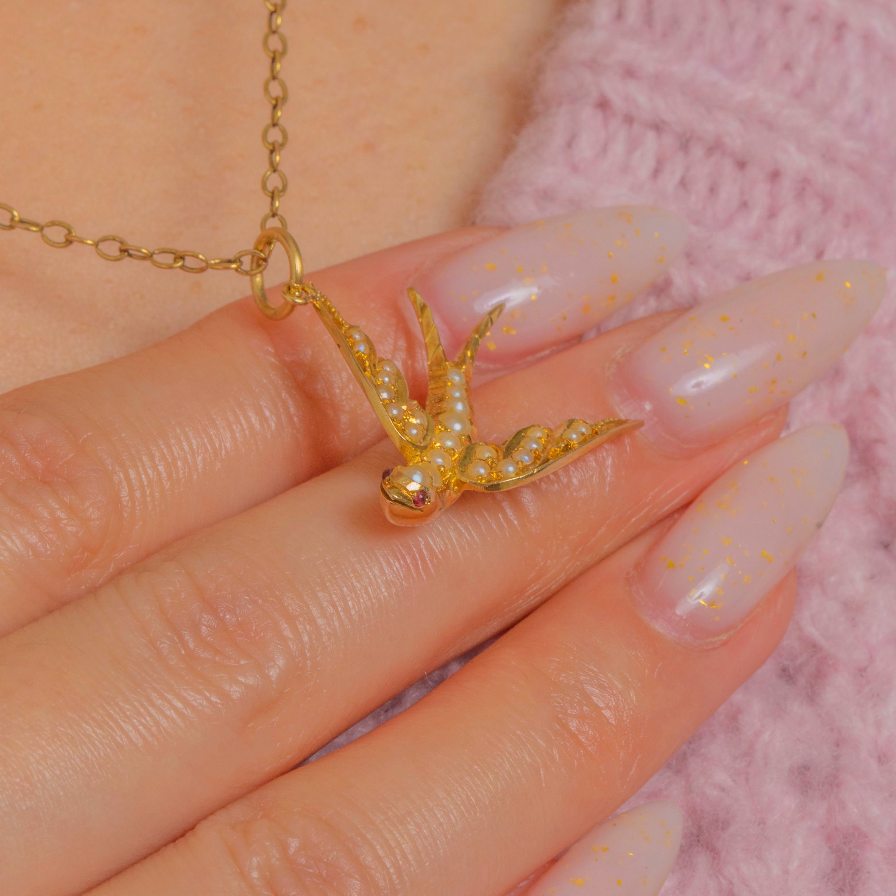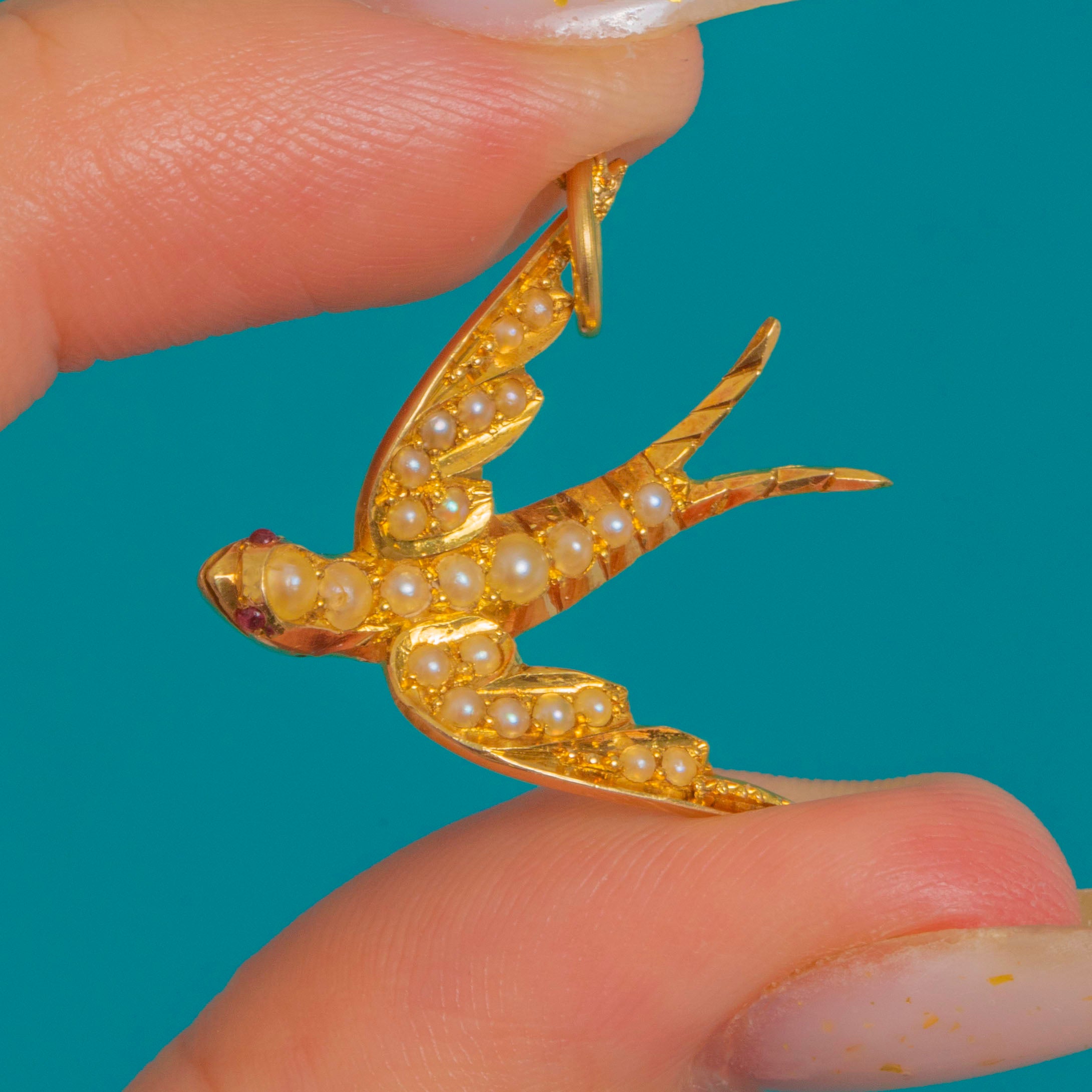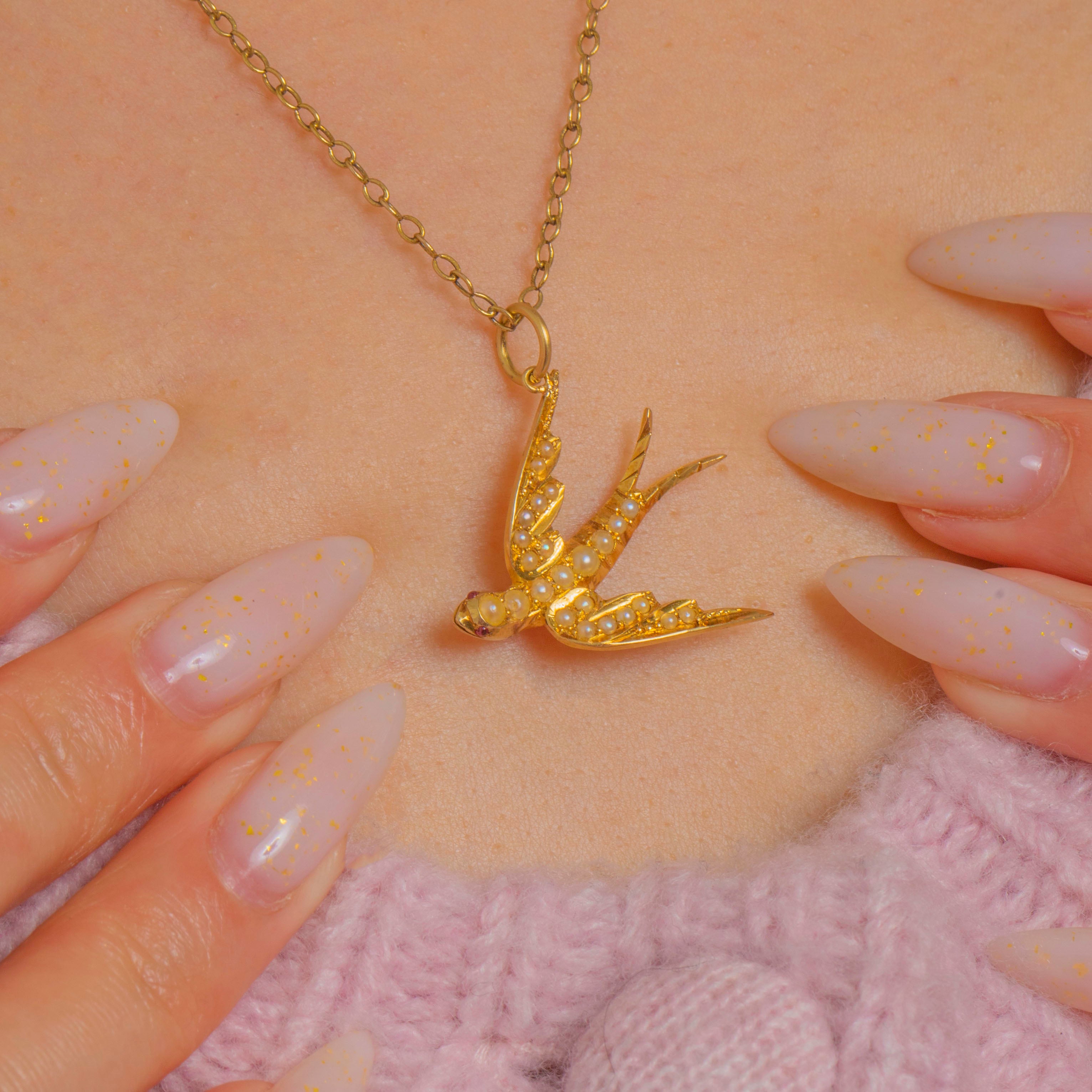 A cherished Victorian motif, this elegant Swallow charm is crafted in rich 18ct Gold, its outstretched wings sprinkled with luminous Seed Pearls and accented by tiny Red Paste eyes for a touch of lively colour. The bird’s feathers are defined with delicate chased detail, while the pearls nestle in raised collet settings that catch the light beautifully as it moves.