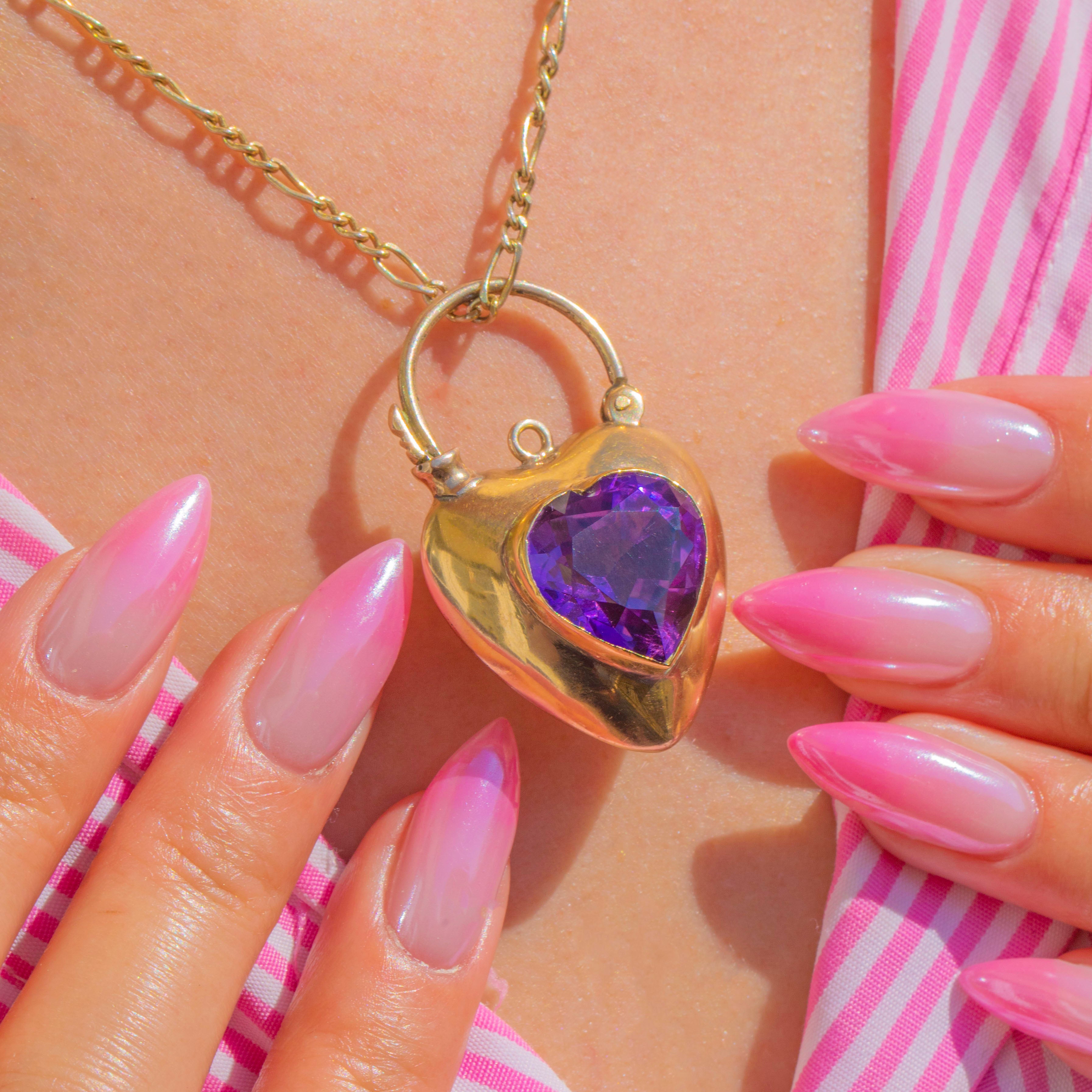 A romantic Victorian treasure, this heart padlock pendant is crafted in rich 15ct Gold and set with a sumptuous Amethyst in a smooth rub-over bezel. The voluptuous, high-polish heart is beautifully balanced by the vibrant purple glow of the gemstone, creating a striking play of colour and light.