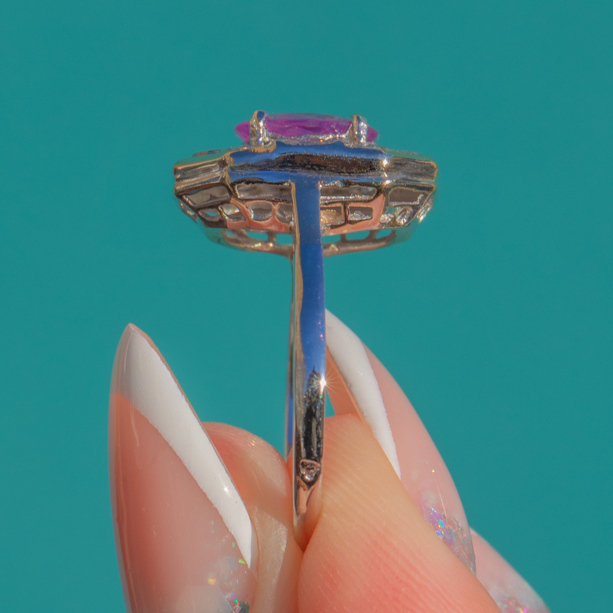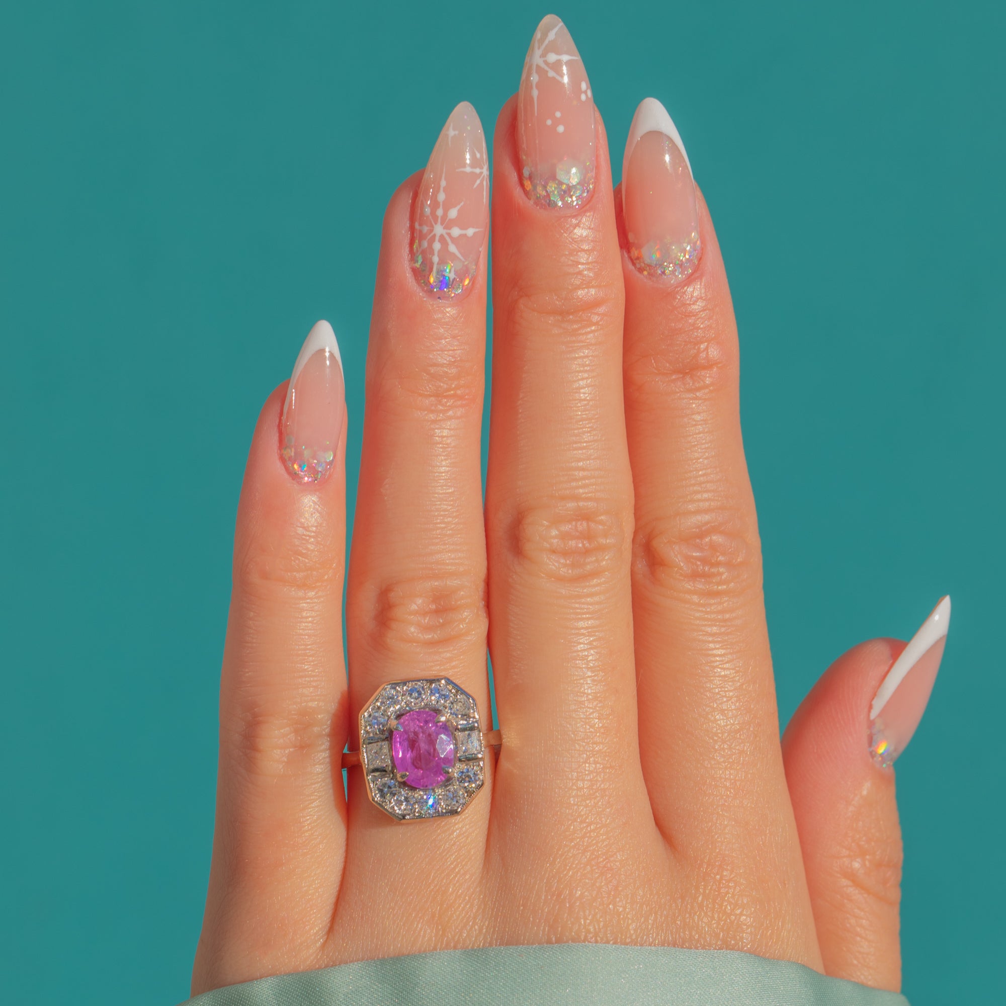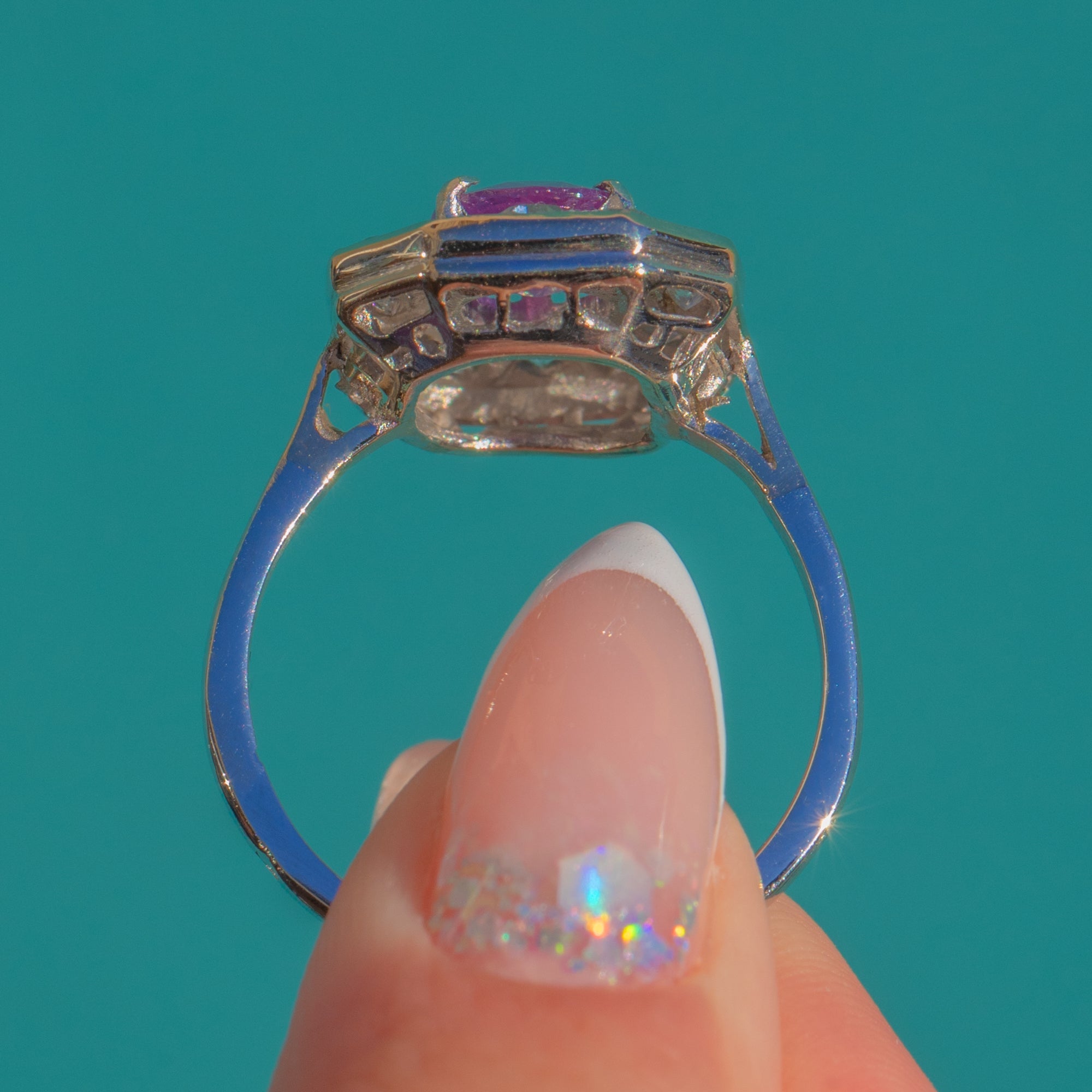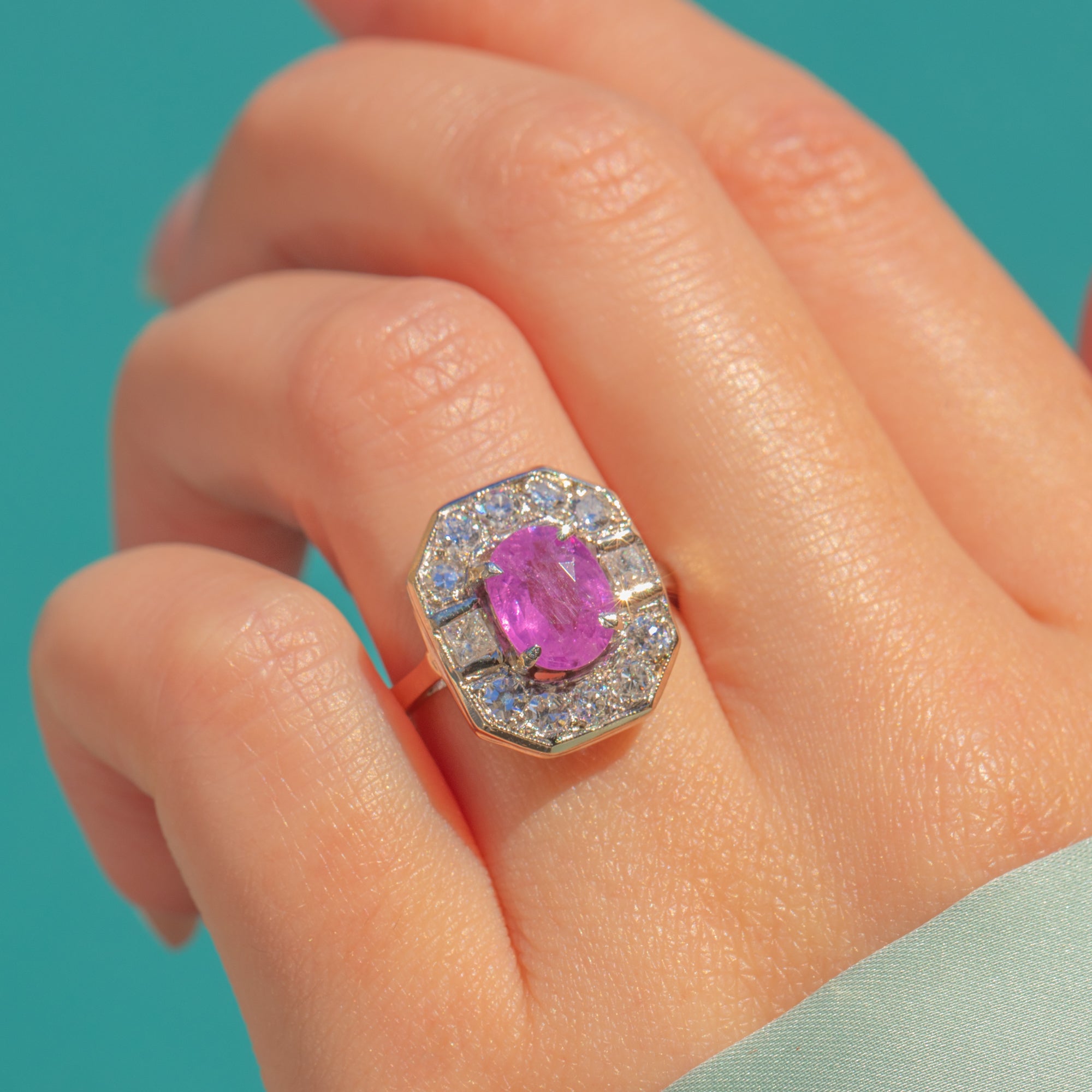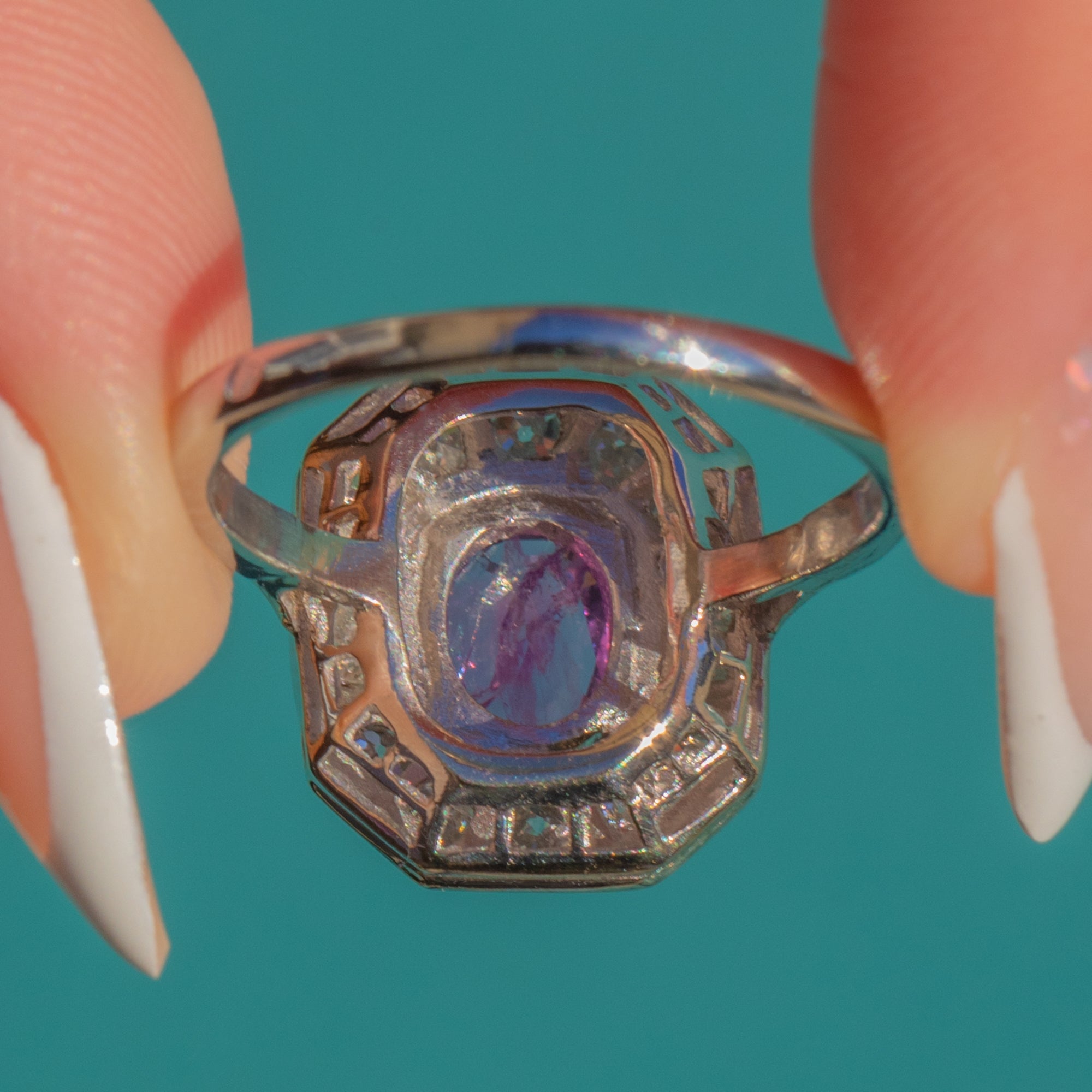 The Platinum setting is beautifully constructed, with strong lines and a wonderfully balanced silhouette that sits elegantly on the hand. Perfect for those who love vibrant colour and glamorous vintage style, this ring makes an unforgettable statement.