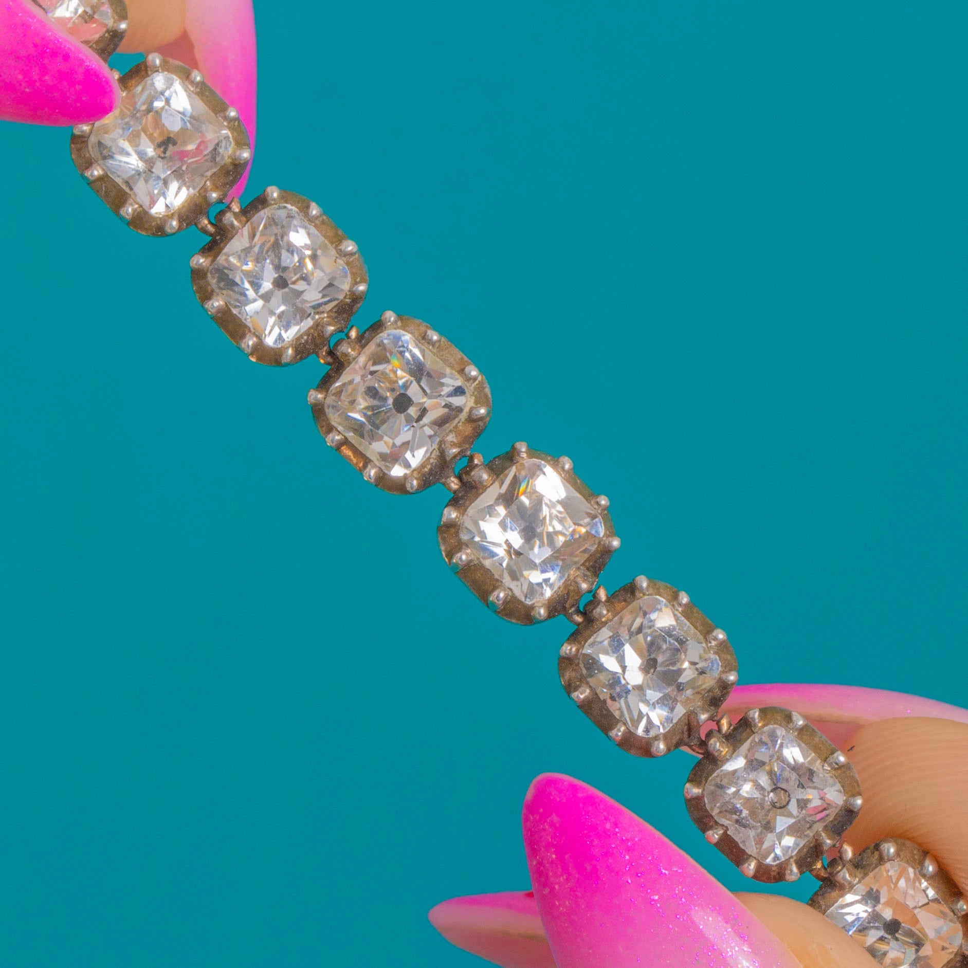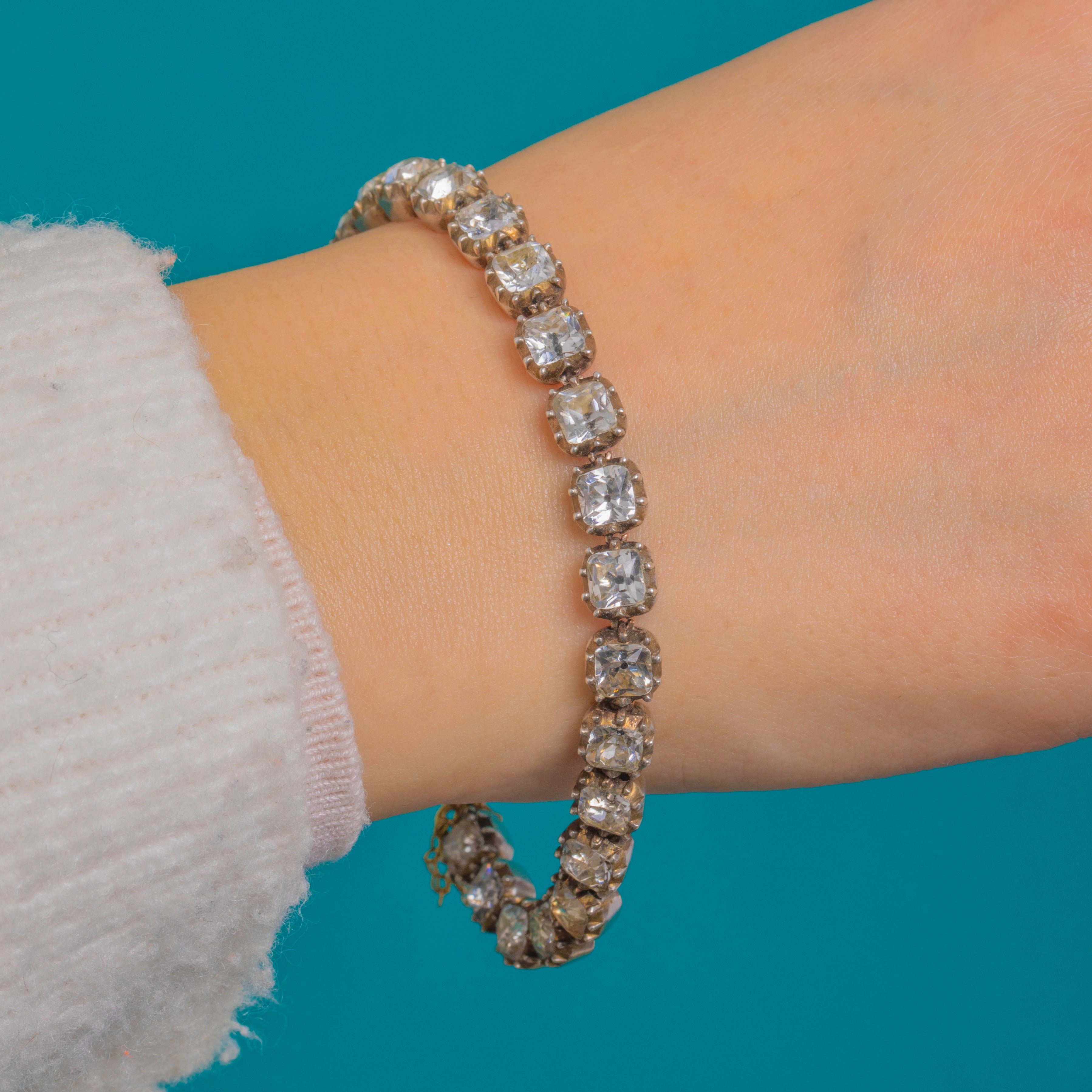 An exquisite early 19th-century Georgian Paste tennis bracelet, set with a continuous line of cushion-cut Back Dot Paste stones that shimmer with refined, candlelit allure. Each stone is housed in traditional Gold-backed Silver piecrust settings, creating that soft glow so beloved of the Georgian era.